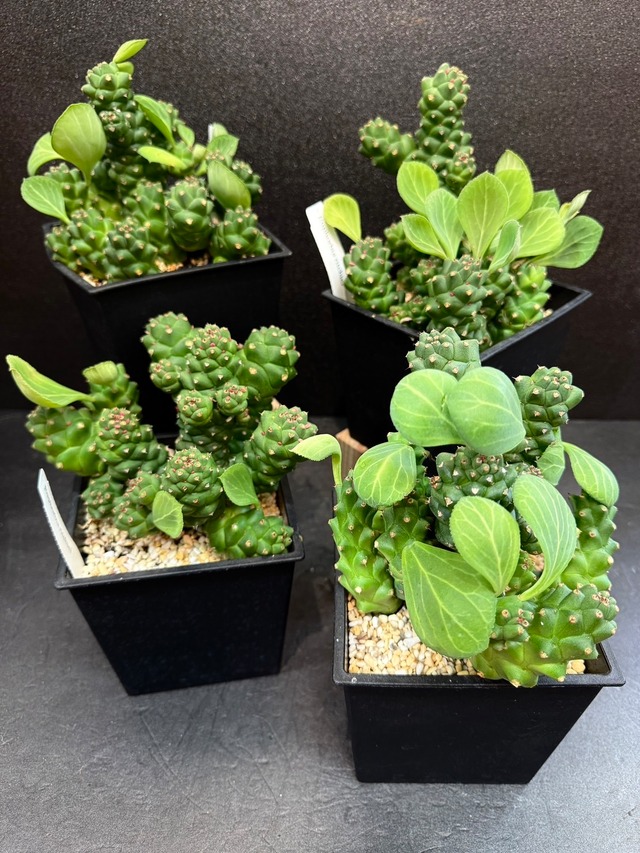 フォルビア・アブデルクリは、石灰岩や石のようにも見える、灰がかったメタリックな質感の柱状の茎を持ち独特で奇妙な見た目の多肉植物です。 インド洋の孤島、アブドゥルクーリー島にのみ自生する非常に希少な植物で、成長が非常に遅いことが特徴です。 根や茎、葉を傷つけると白い乳液(乳液)が出て、これが皮膚に触れるとかぶれることがあるので注意が必要です ※ランダム発送となります 【写真更新日】2025/11/7 ■サイズ:3.5号 ■置き場 【春~秋】 明るい場所、半日陰などに置きます。 夏場の直射直射日光は当たらないようにしてください。 日陰でも育ちますが、成長が緩やかになります。 【冬】 寒さに対しては弱いため、室温が10℃以上になる場所で育てましょう。 ■水やり 【春~秋】 乾燥に強い為土の表面が完全に乾いたら、 更に3日~4日待ってからたっぷりと 水を与えます。 ※過湿にならないように注意が必要です。 【冬】 水やりは控えめにし、土が完全に乾いてから 数日後に与えます。 ※乾燥気味に管理します ※冬は屋外管理であれば、ほぼ水やりはお休みです。 特に根の周りに水を入れてはいけません。 ※必ずお読みください 店頭でも同時販売している商品もございます。 タイムラグにより商品が完売してしまった場合は、キャンセルのご連絡が行く場合がございますので予めご了承下さい。 植物をお送りする場合、写真からの成長や若干の枯れ、多少の傷・汚れなどがあります。 今後の育成に問題はないものになります。 当店発送後の商品の補償・交換・返品・キャンセルはお受けしておりませんので 予めご了承くださいませ。 ご購入商品が雑貨・園芸資材の場合、不良品においては交換対応を行っております。 発送品の長期受け取り拒否、お客様都合による到着日変更による各トラブルにつきましても 当店は関知致しませんのでご注意くださいませ。 配送時の箱の変形や転倒と思われる中身の植物・鉢・その他雑貨類のトラブルにつきましては配送業者にお問い合わせください。 植物なので、虫などがまだいる場合もあります。 入荷時や定期的な薬剤散布や清掃は行っております。 商品が届きましたら早めに開封いただき、明るく暖かい室内でゆっくり1日休ませてあげてください。 同梱について 複数ご購入いただいた場合、極力同梱対応させていただきますが、配送費に伴うサイズを超える場合、同梱出来ない事があります。その場合、配送についてのご相談の為こちらからご連絡させていただきます。