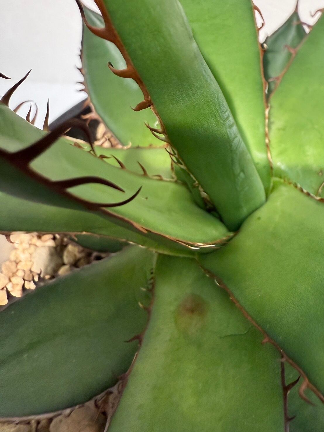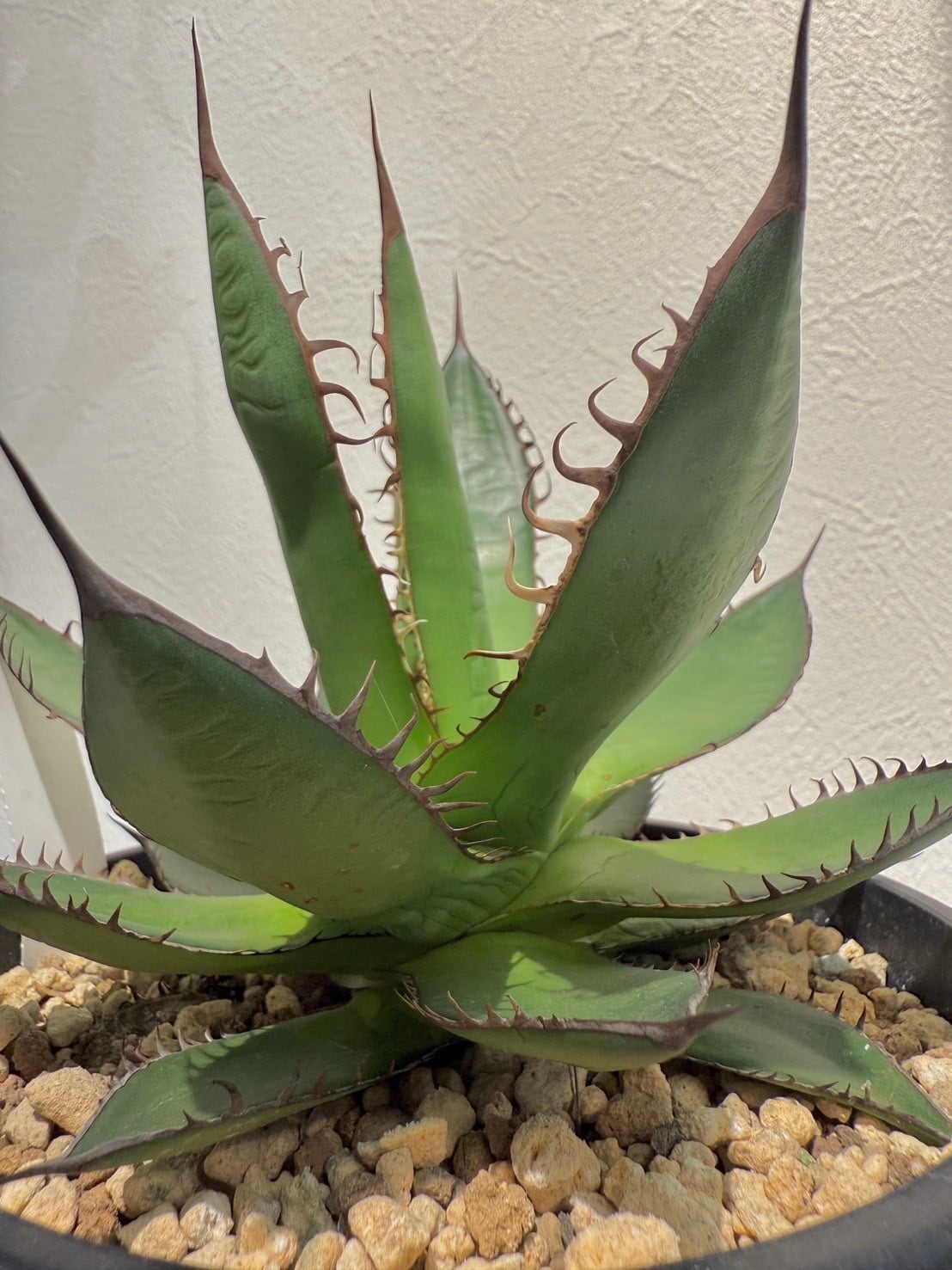 葉は光沢のある濃緑色で縁が反り返っています。鋸歯(きょし/葉の周りにある切れ込み)は幼株では茶褐色、成株はアッシュグレーで牙のようになります。葉は薄く、美しいロゼット(バラの花のように、葉が放射状に広がっている状態)を形成します。