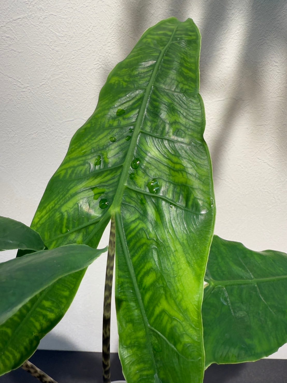 葉には奇妙な色彩効果があり、他のアロカシアには見られない珍しい特徴です。