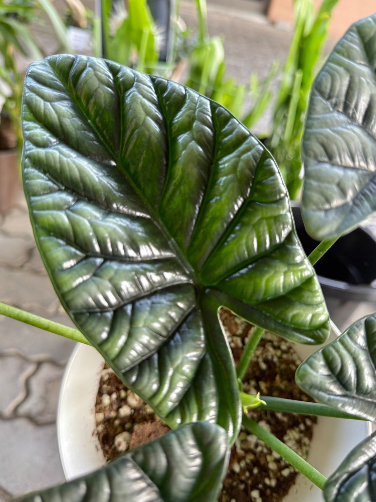 「シヌアータ」は竜の鱗を想わせる、凹凸のある特徴的な葉が魅力のアロカシアです。