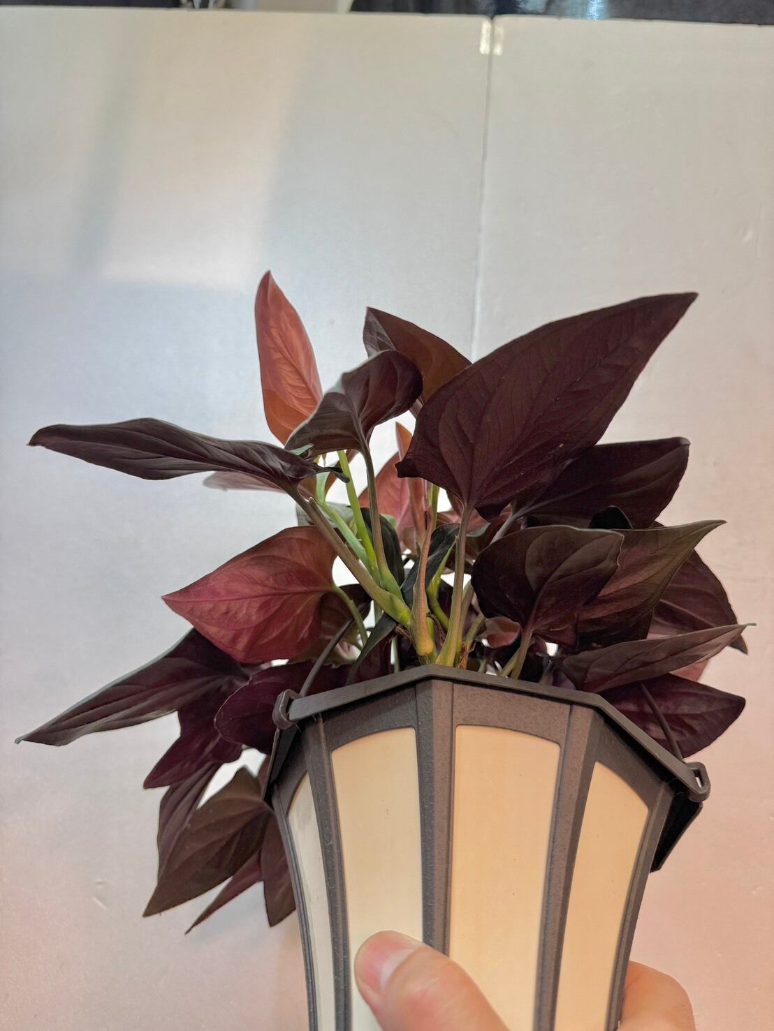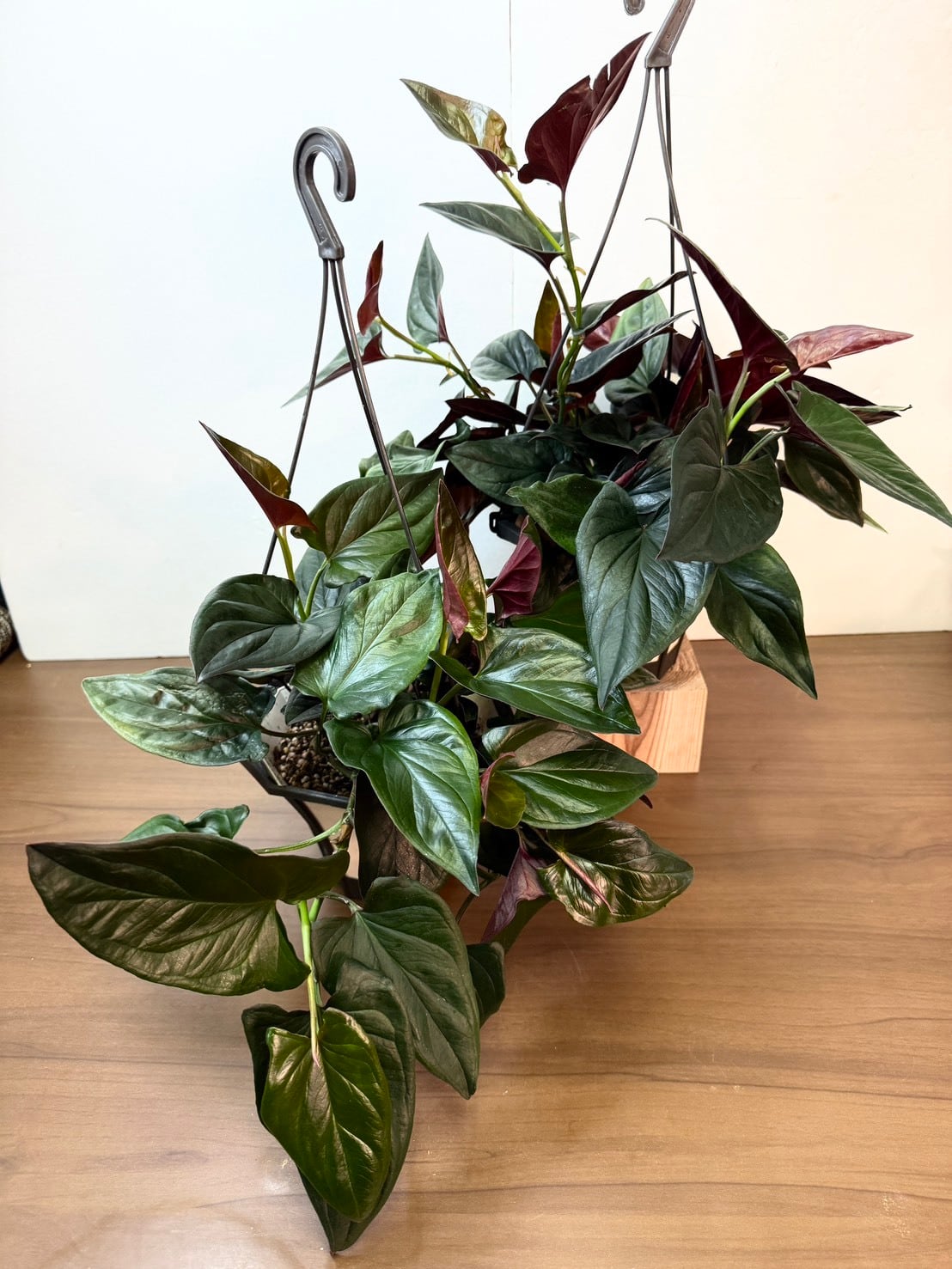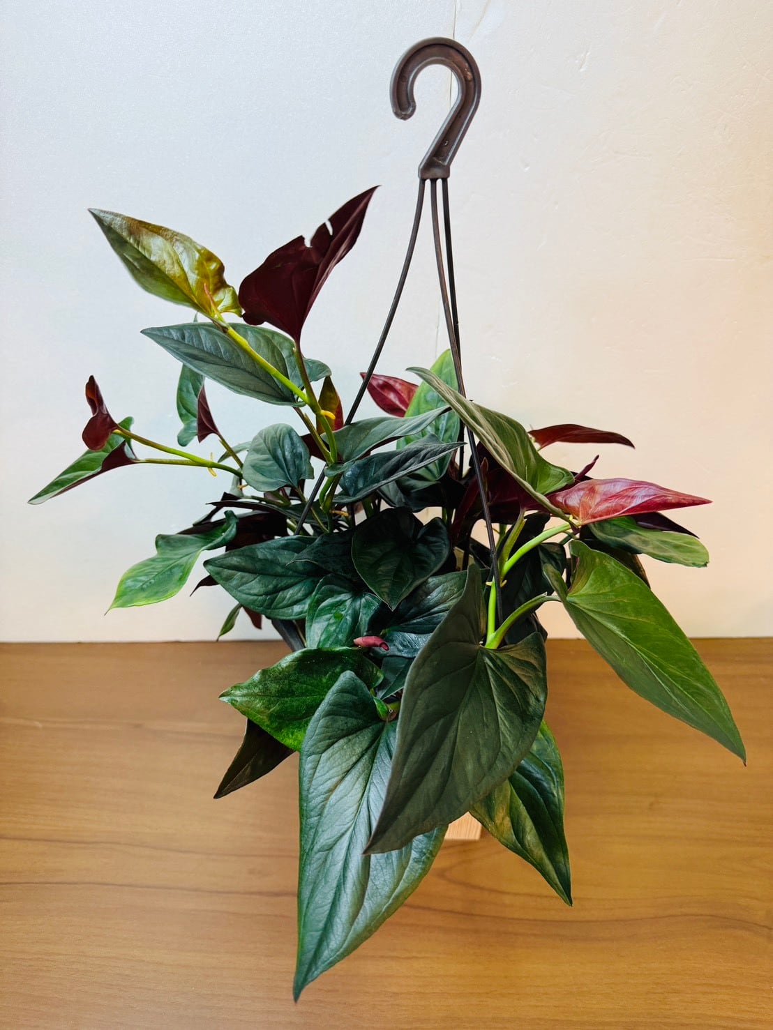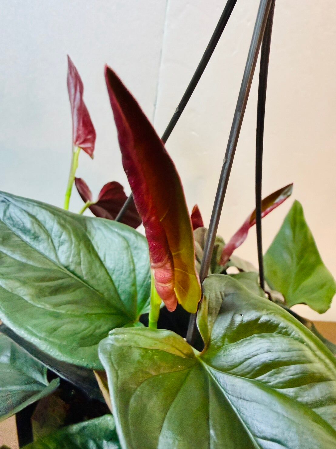 シンゴニウム・チョコレートは、濃い緑色と赤紫色の二色の葉色で矢尻形をした葉が特徴です。