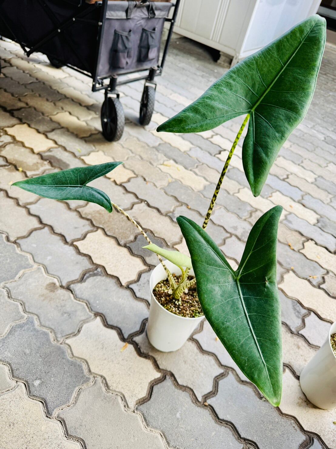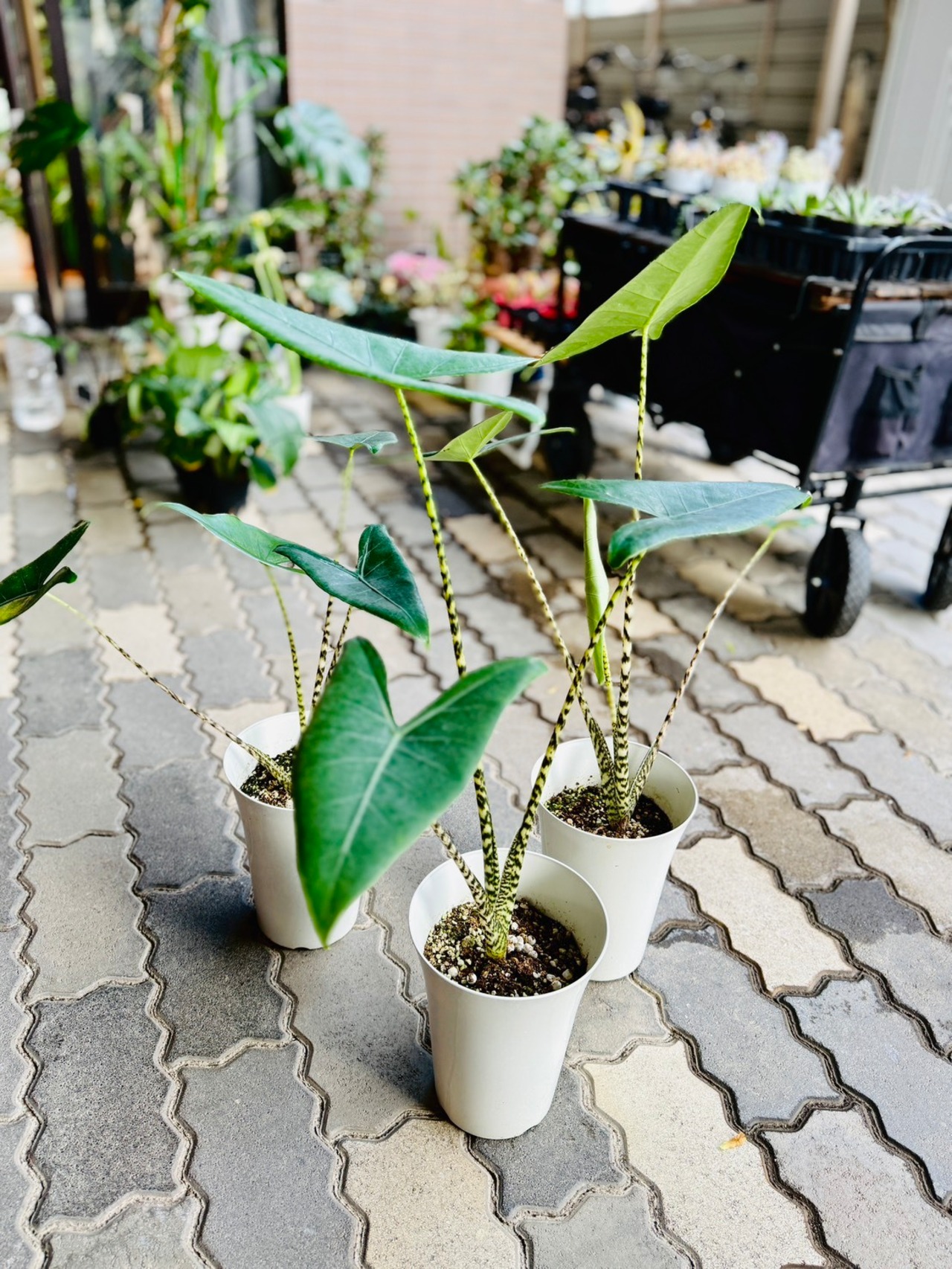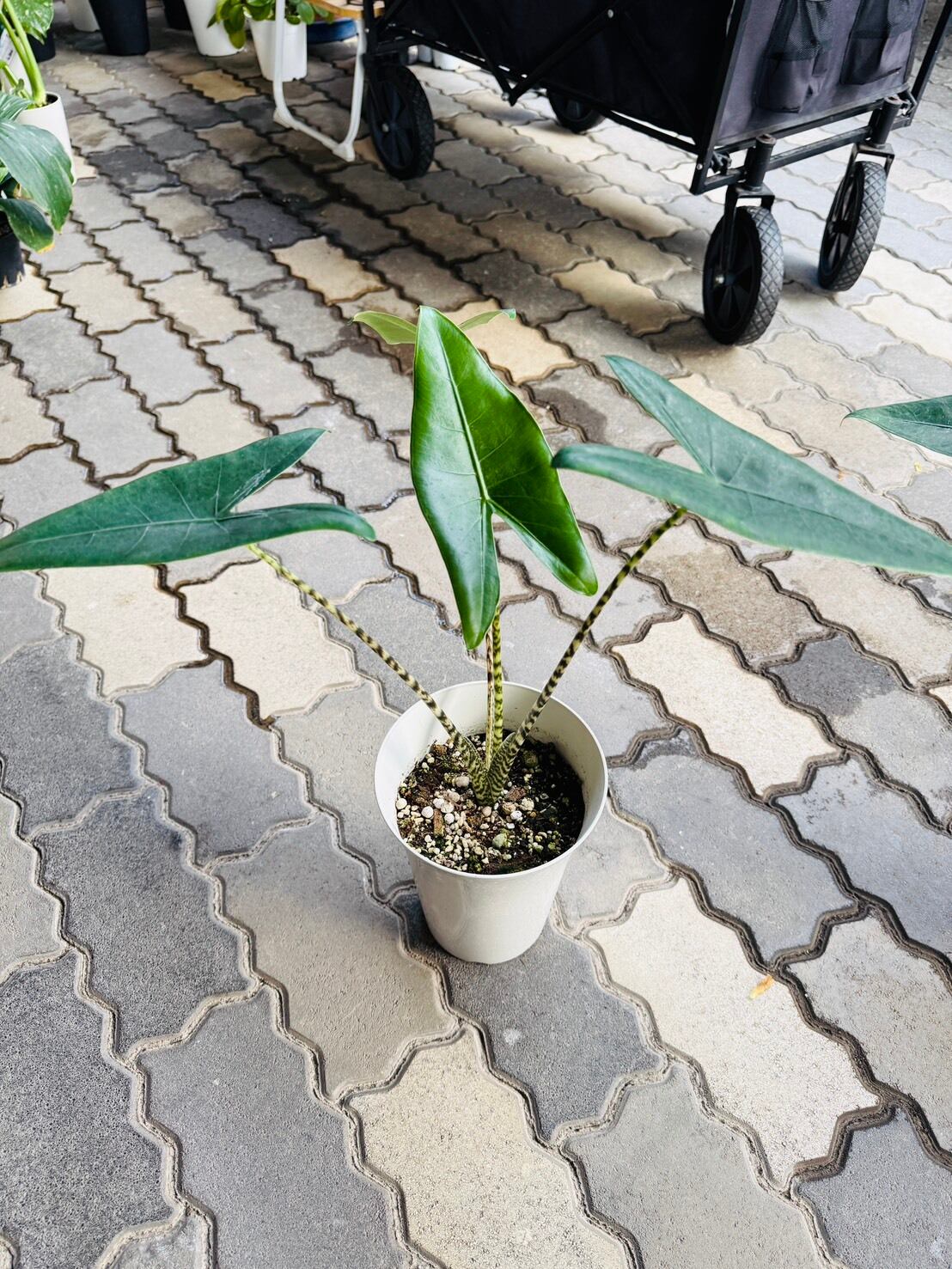 アロカシア・ゼブリナは、葉柄の色が緑色と黒色 (暗褐色)の二色で構成されておりシマウマのように縞模様になる特徴があります。
