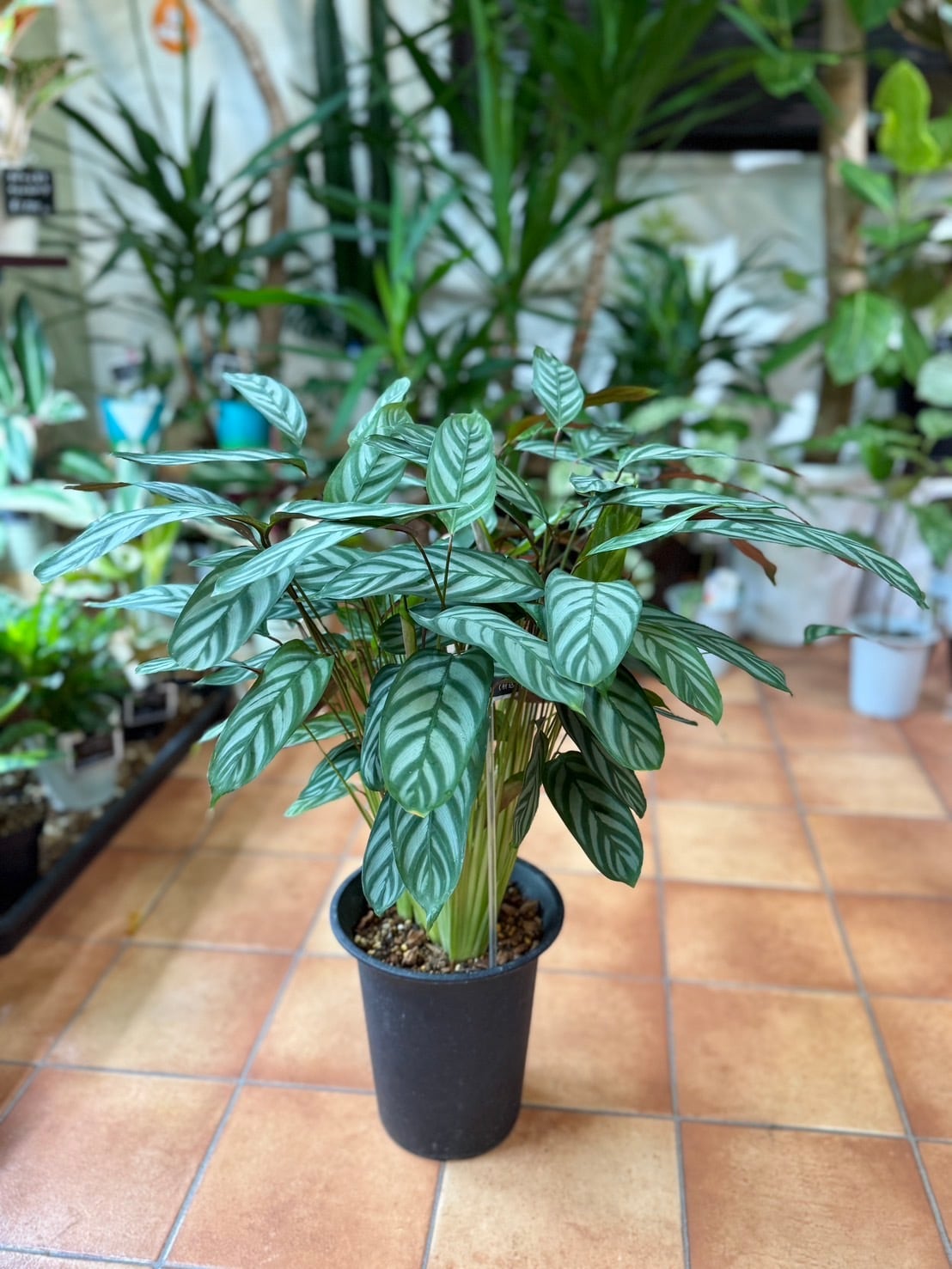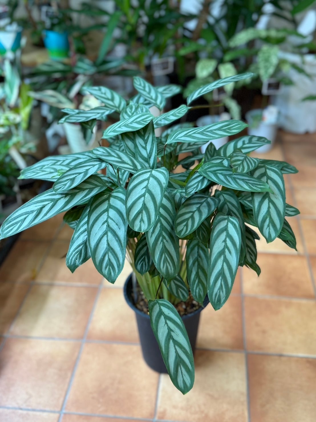 クテナンテ・セトサは、灰色がかった緑の大きな葉にくっきりとした葉脈に裏側は鮮やかな赤紫色をしておりコントラストが美しい植物です。