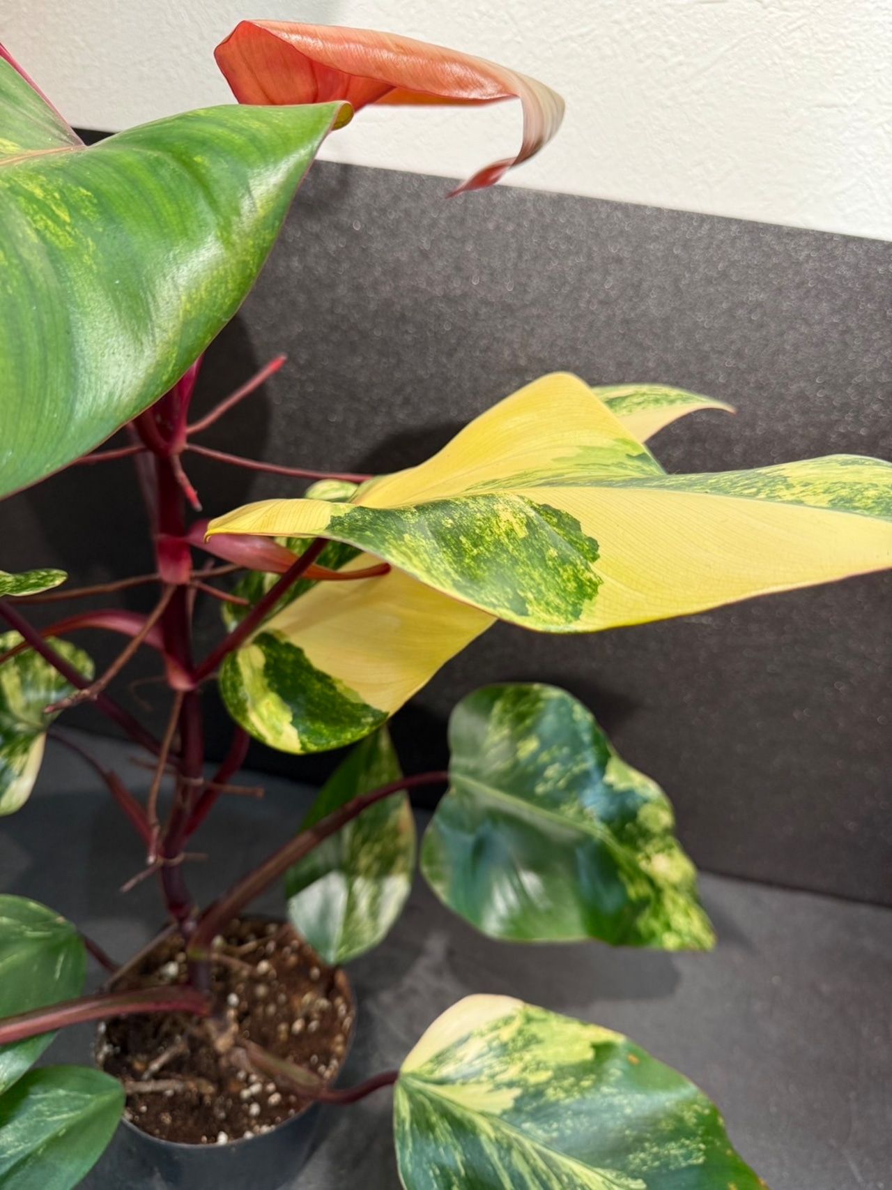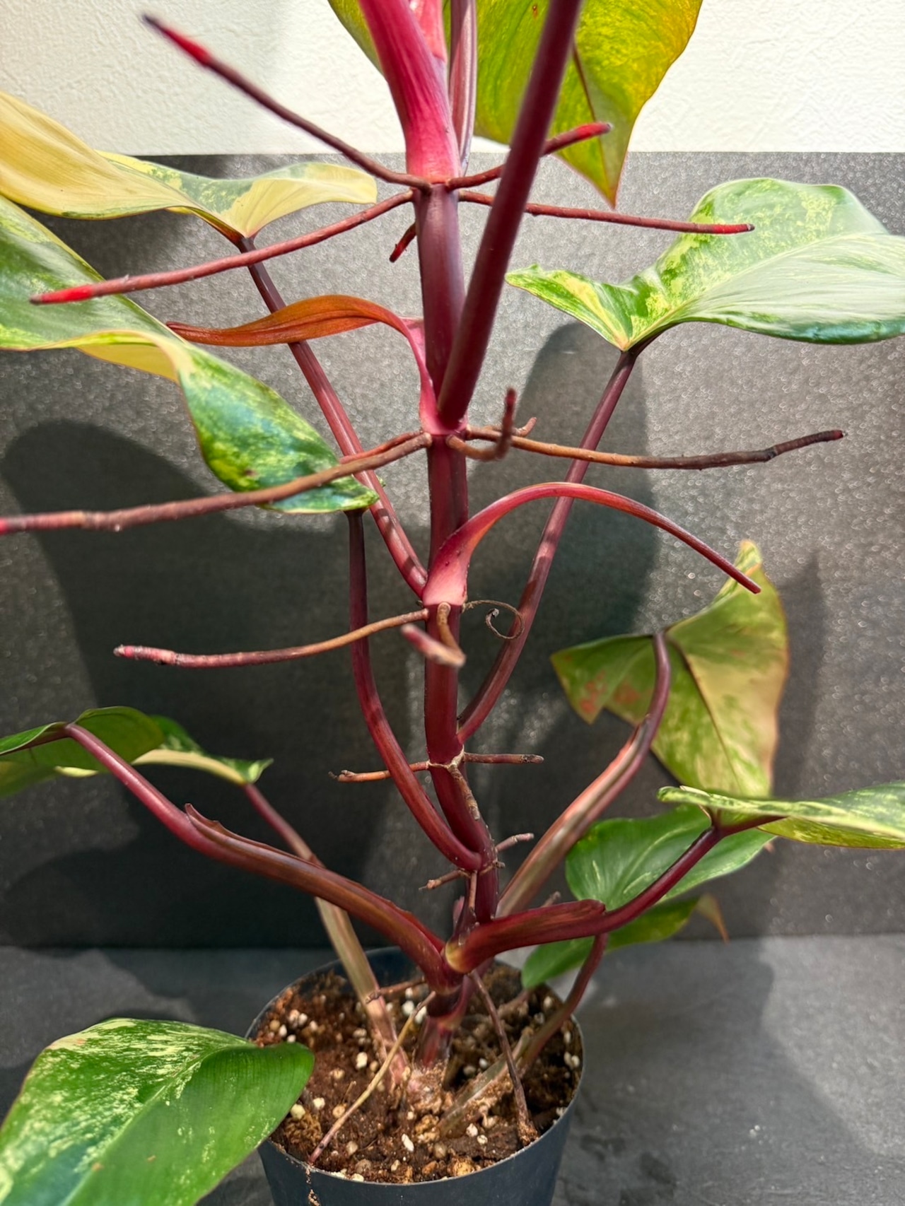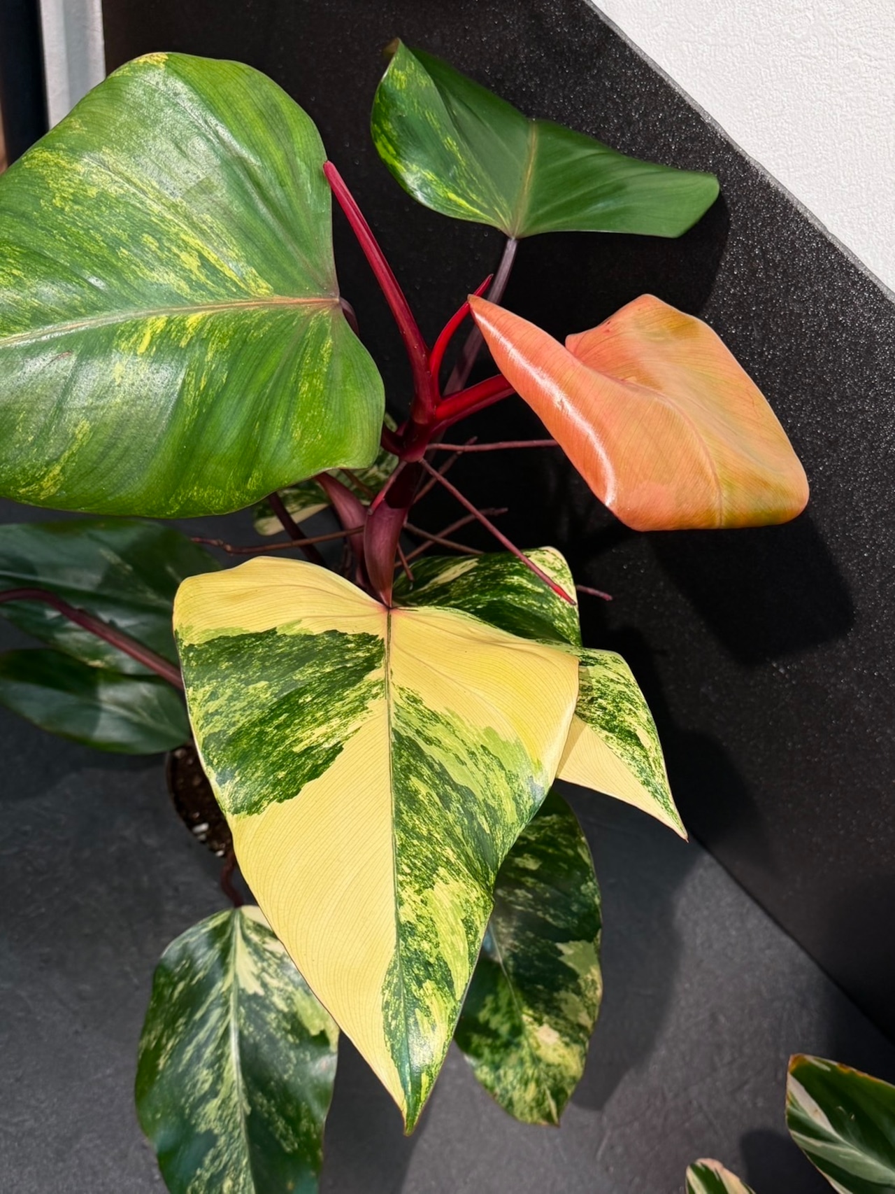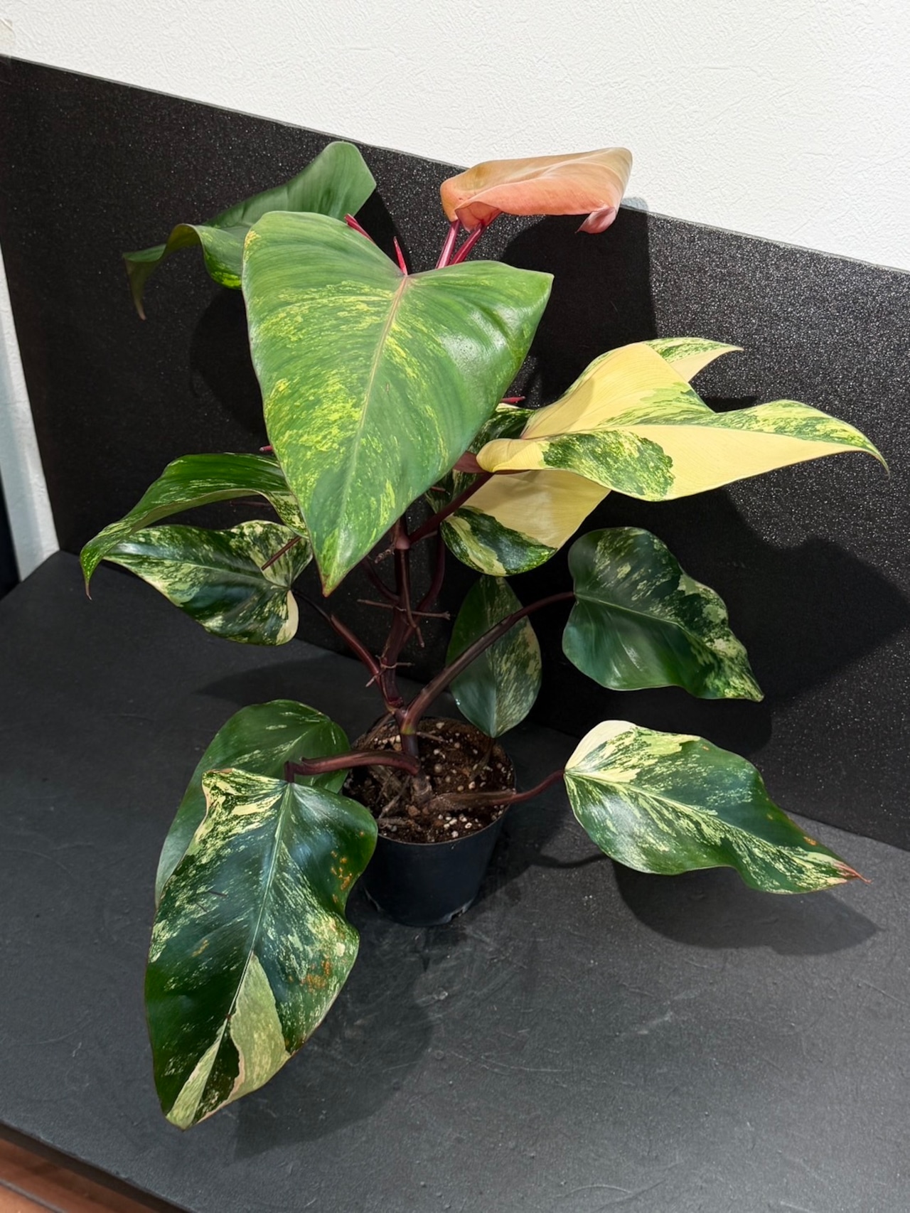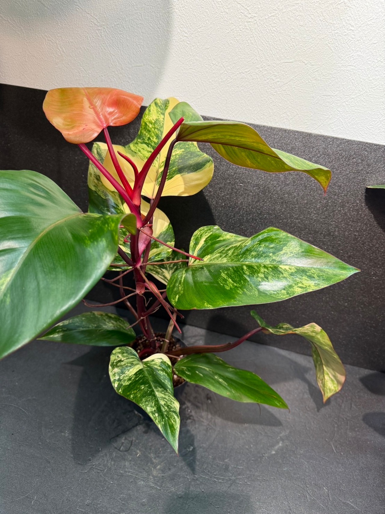 フィロデンドロン ストロベリーシェイクは、観葉植物の中でも珍しい、ピンク系の斑入り模様が魅力的な植物で人気&希少品種です。