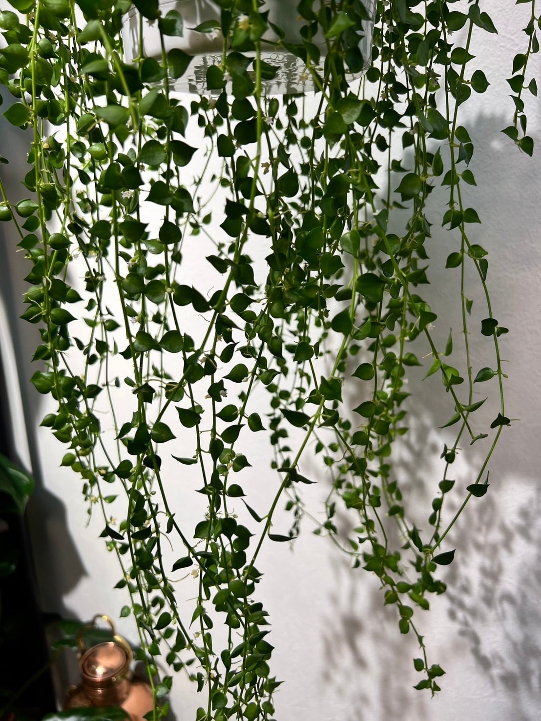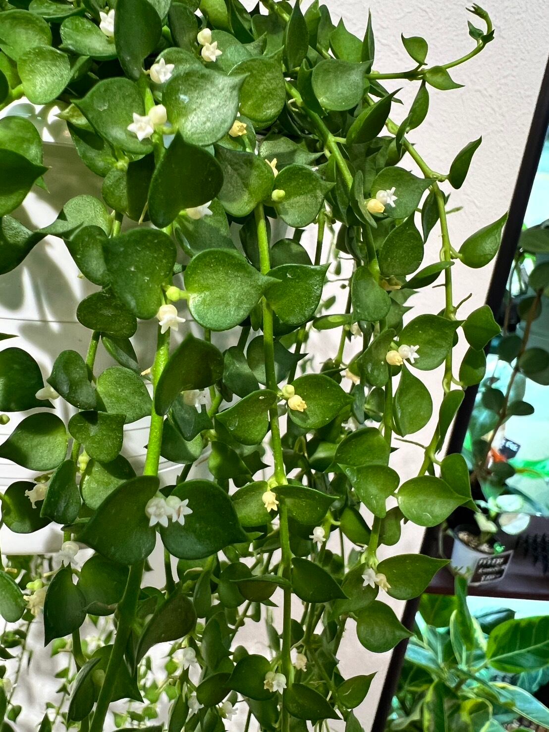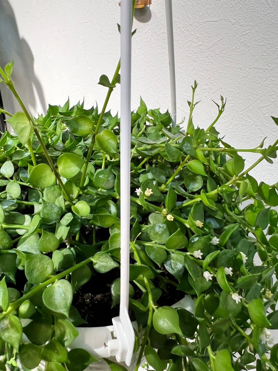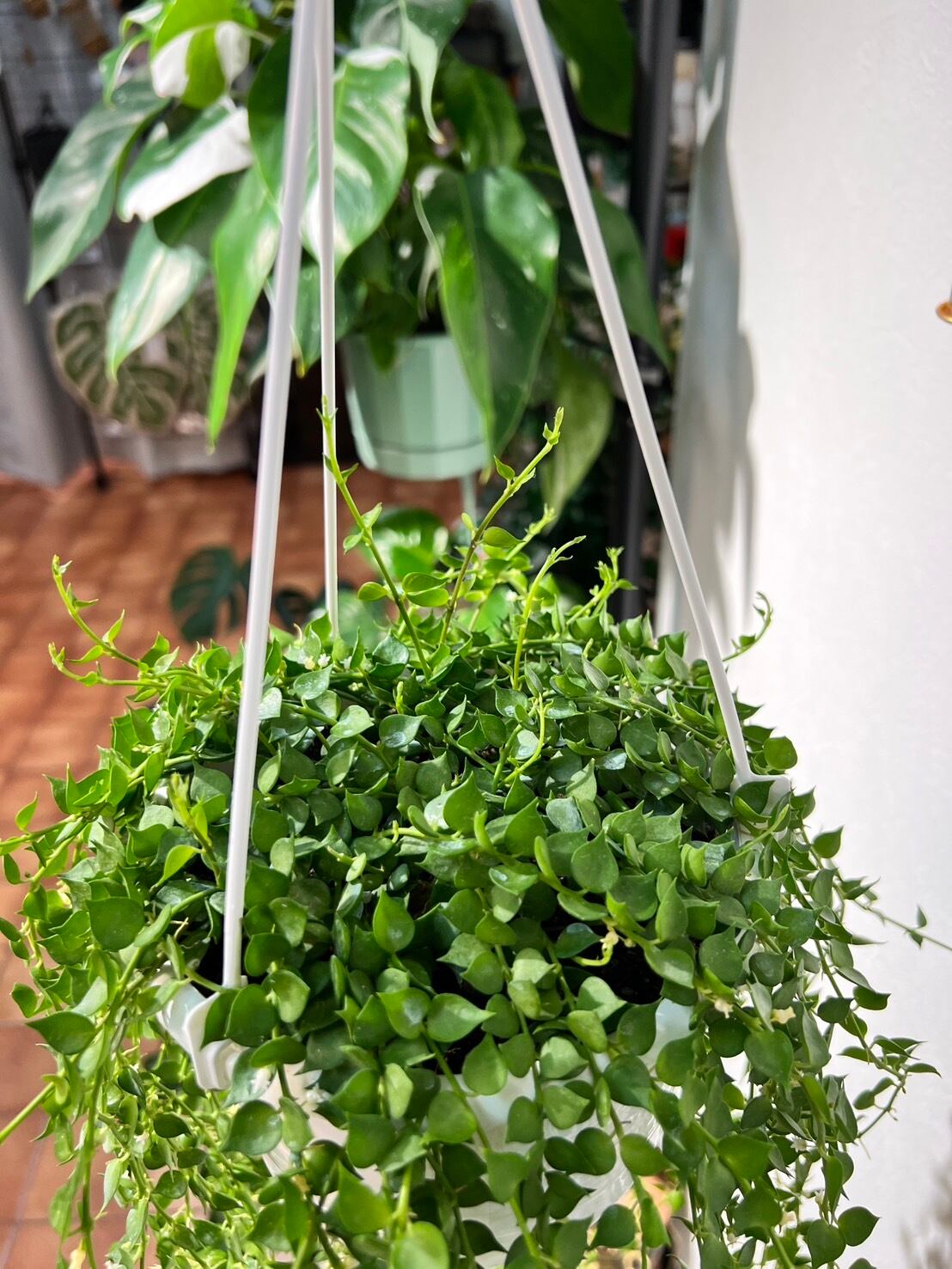 ディスキディア・ミリオンハートは、葉の形がハート形で多肉質な植物です。葉の大きさが非常に小さく、ツル性に成長する習慣などにありインテリア性の高い植物です。6月~8月に白い小さい鈴のような花を咲かせてくれます。耐陰性が強く乾燥にも強く室内で育てやすい品種で初心者の方にもおすすめです。