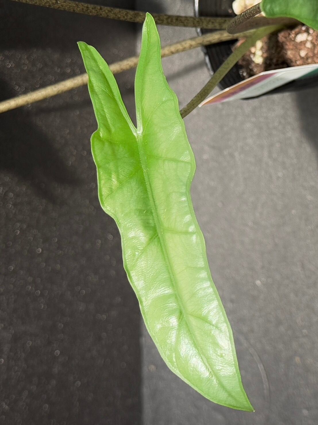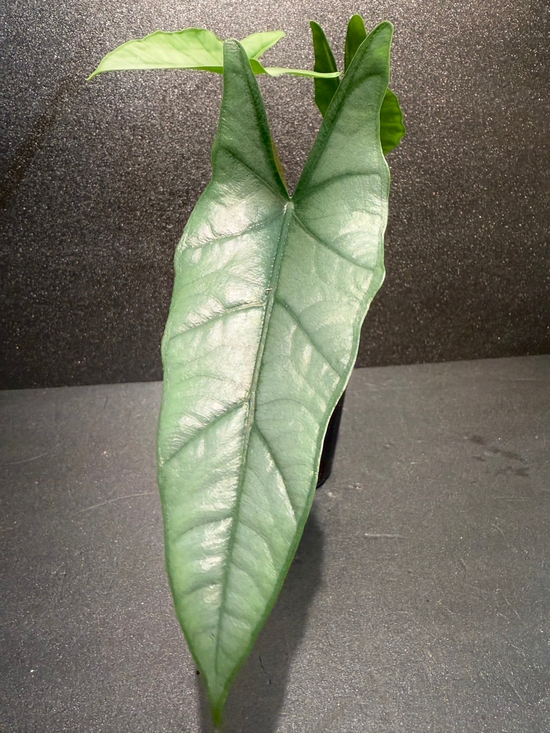 アロカシア・ヘテロフィラ メタリックブルーは、細葉系で名前の通りメタリックブルーな個性的な葉を持つ珍しい品種です。