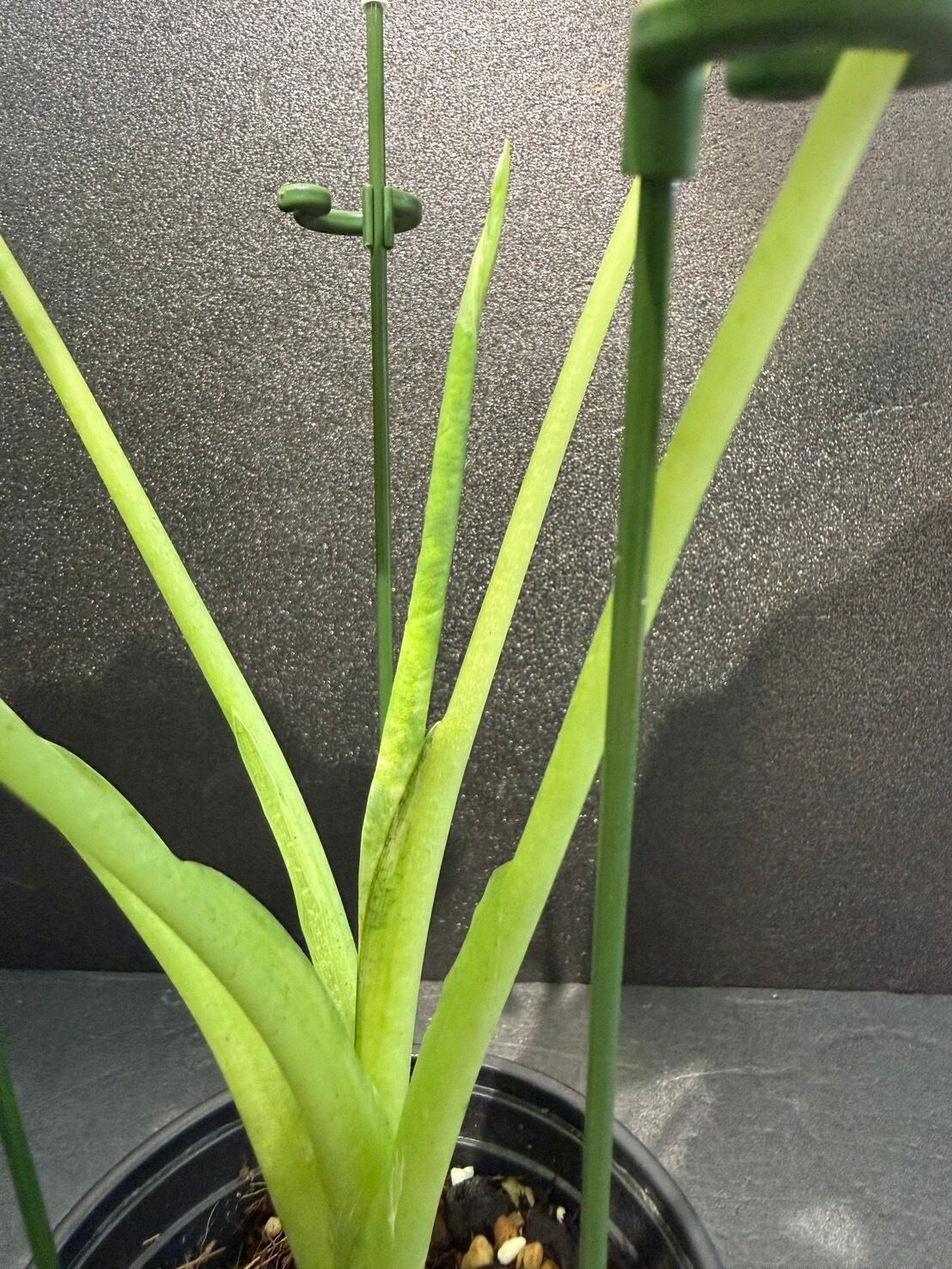 茎一本に大きな葉をつけ、ベルベットのような光沢とくっきりとした白い葉脈の色合いが魅力的な品種です。