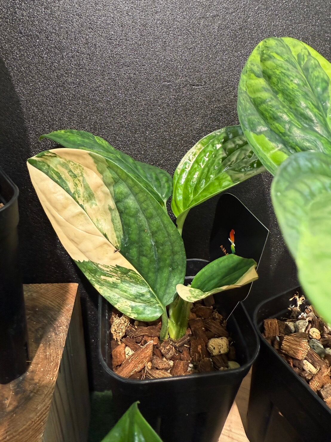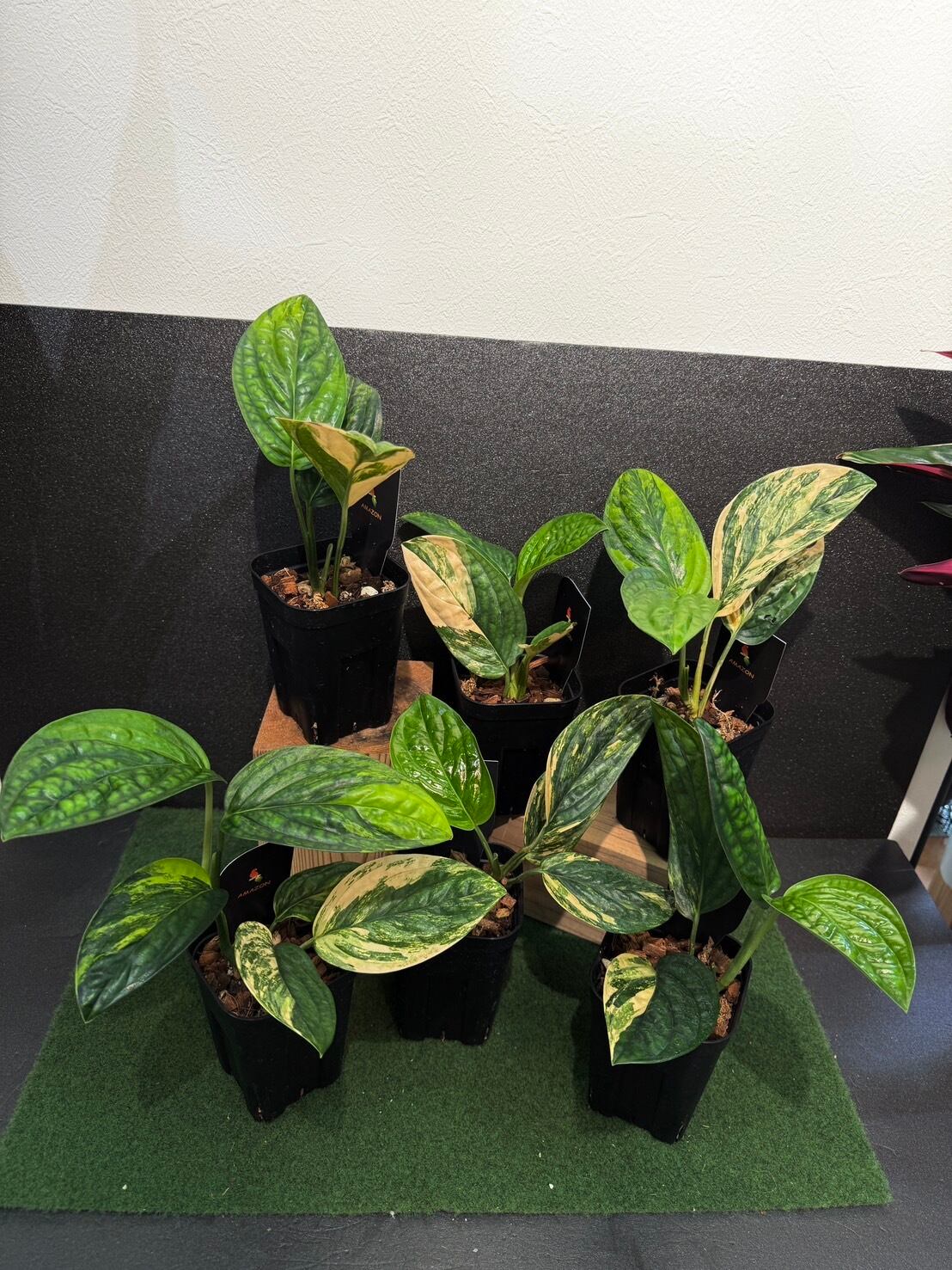 モンステラ・カルステリアナム・バリエガータは、葉に黄白色の斑が入るのが特徴で、通常のカルステリアナムよりも流通量が少なく、希少性が高い品種です。
