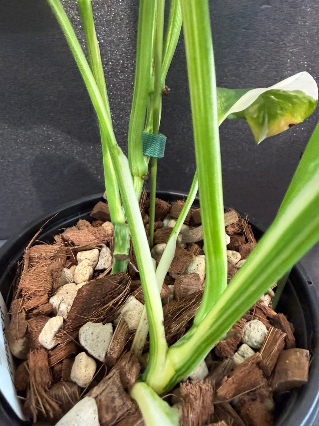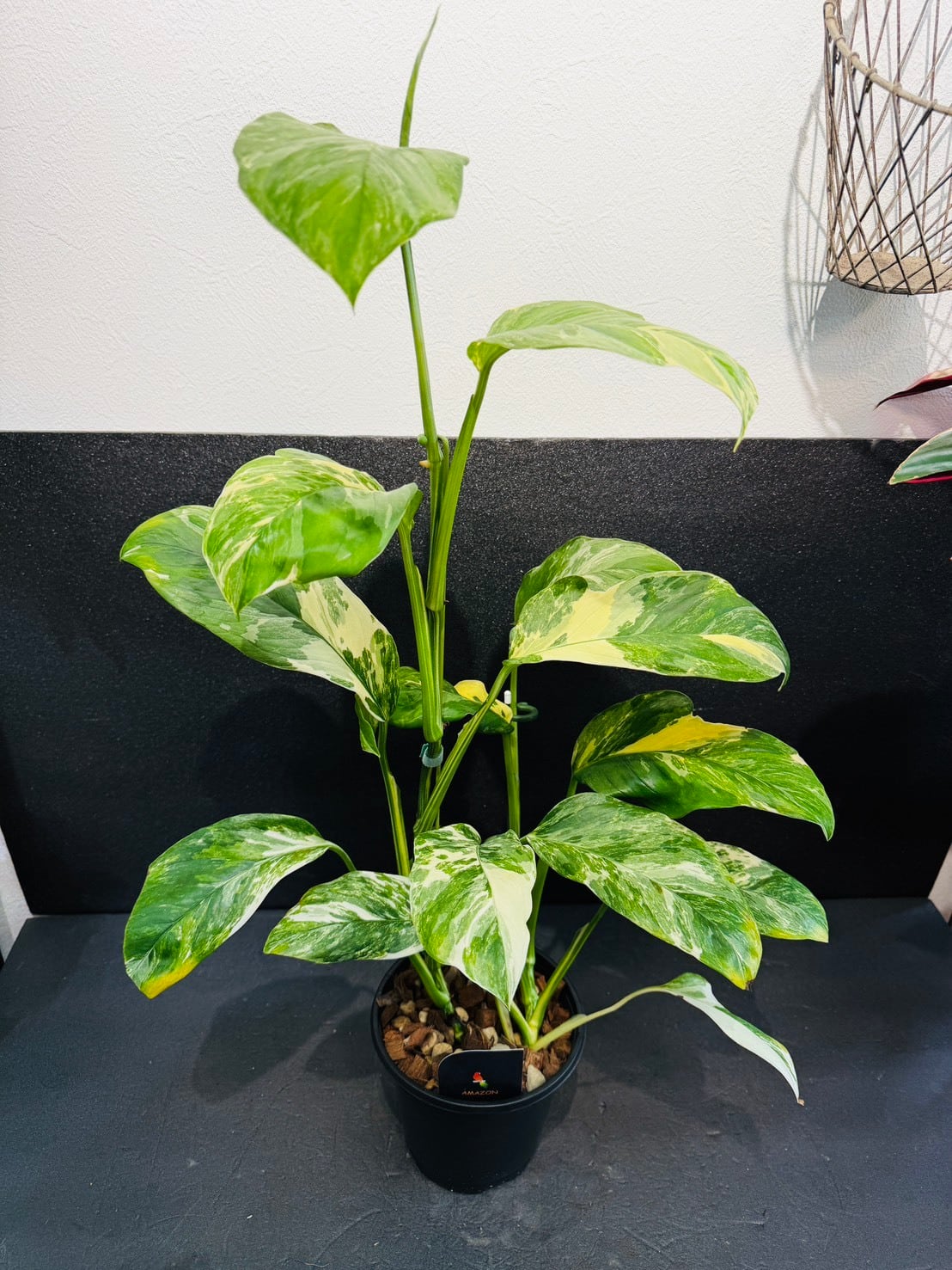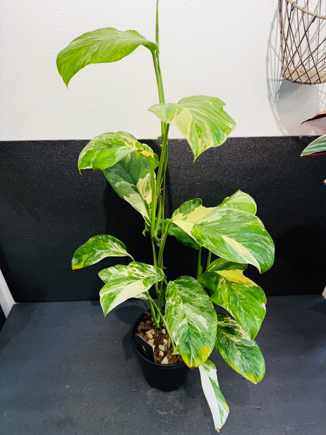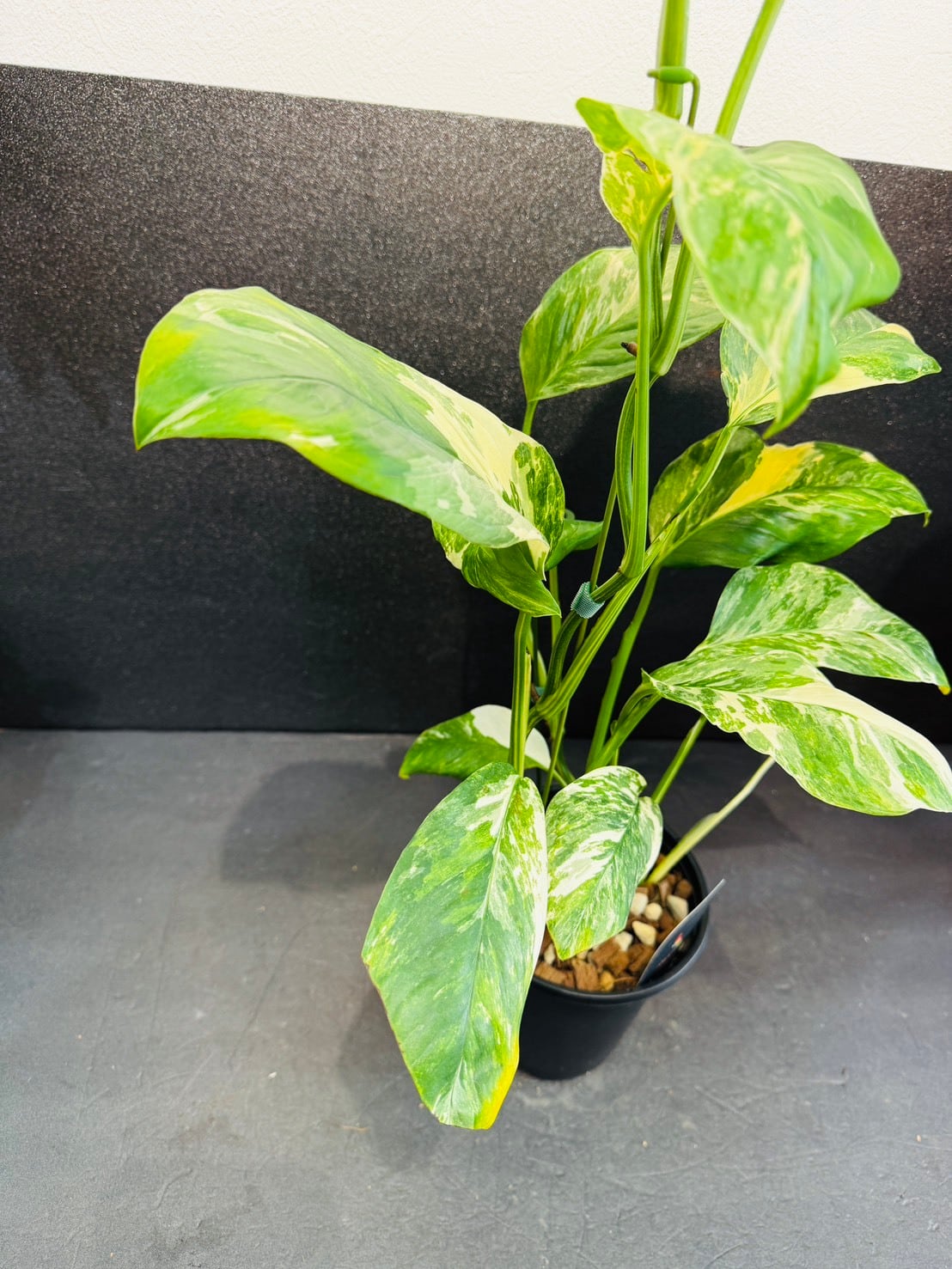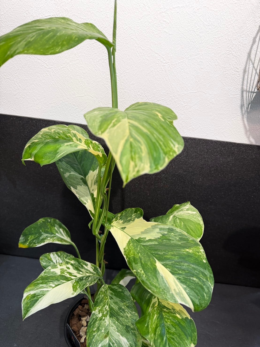 モンステラ・レクレリアナ・バリエガータは、縦長の葉に多数の穴が特徴的なモンステラ・レクレリアナの斑入り品種です。