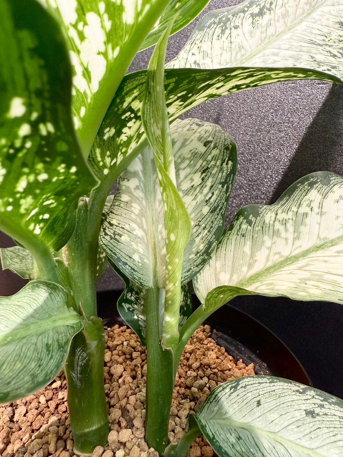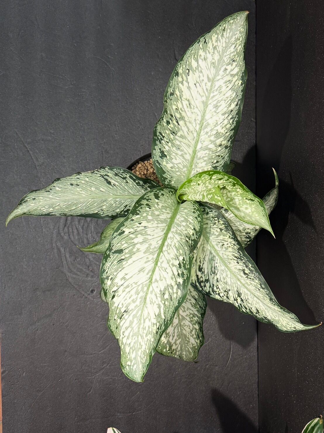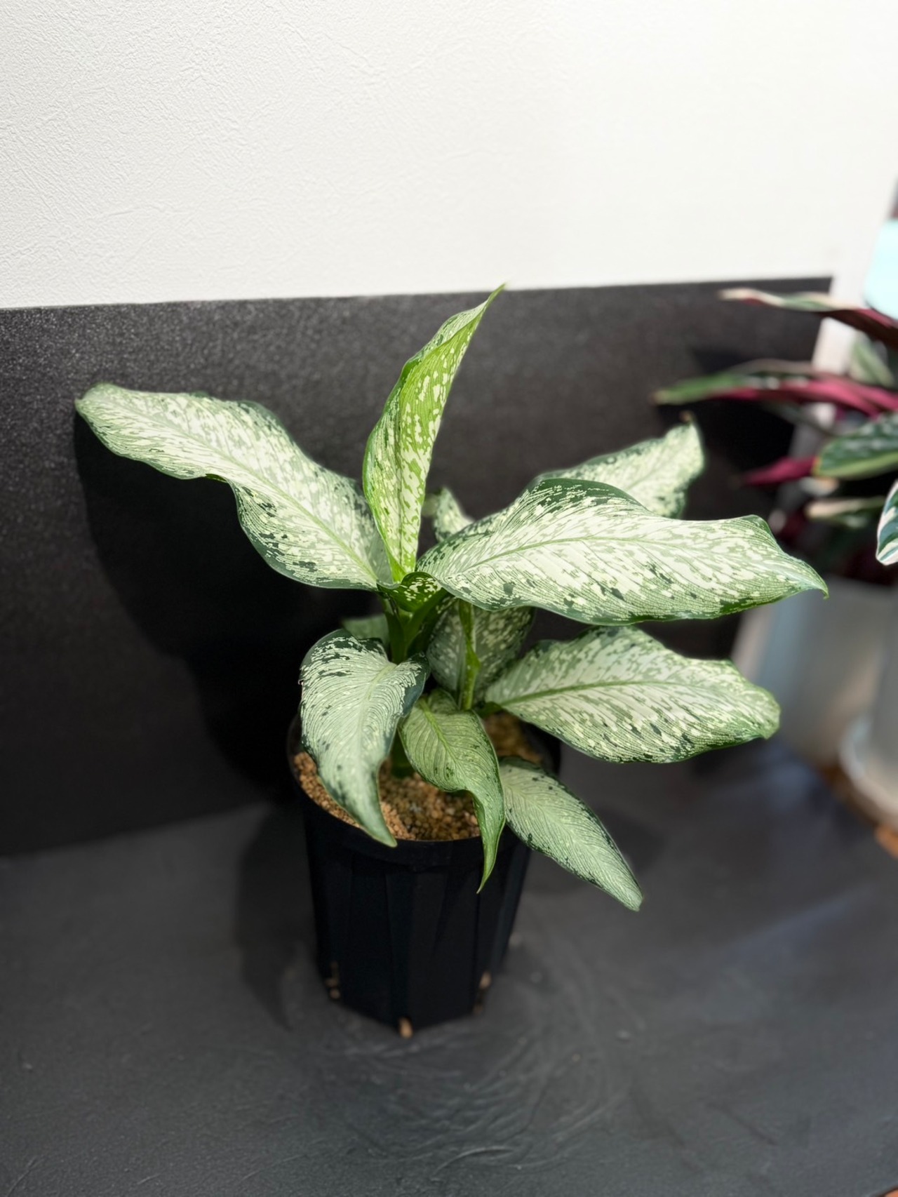 ディフェンバキア・ティキは、 グリーンの葉に白斑のモザイク模様が入る品種です。