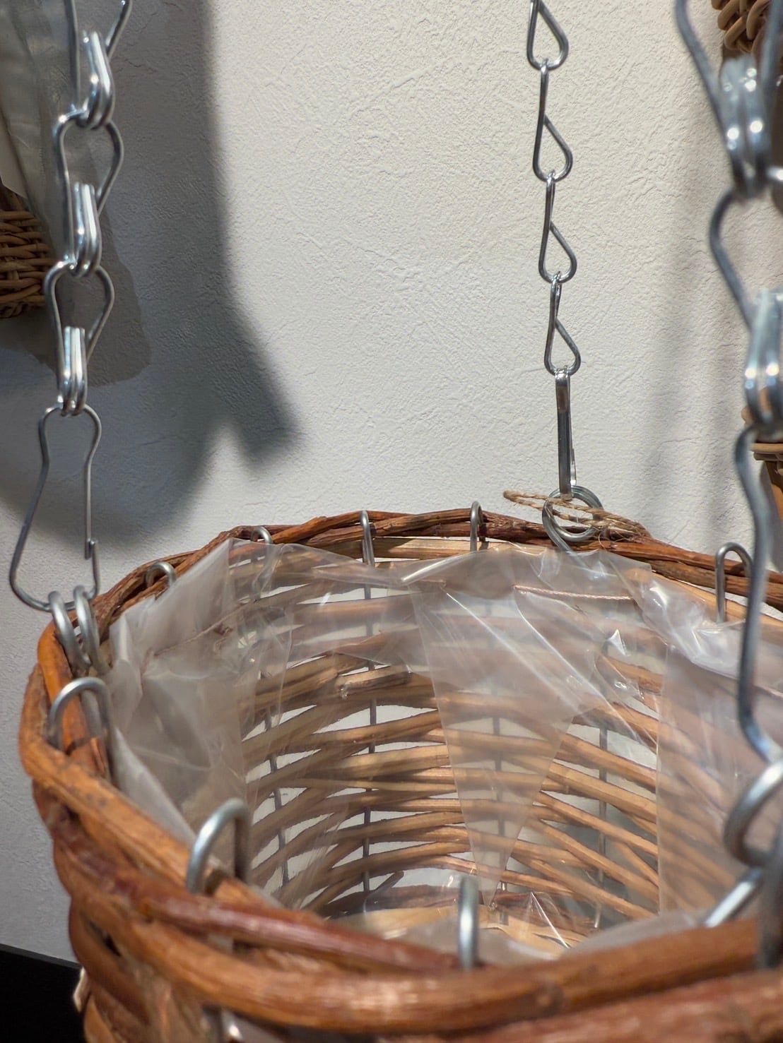 ワイヤーの曲線がアンティークな雰囲気を演出しているハンギングバスケット。