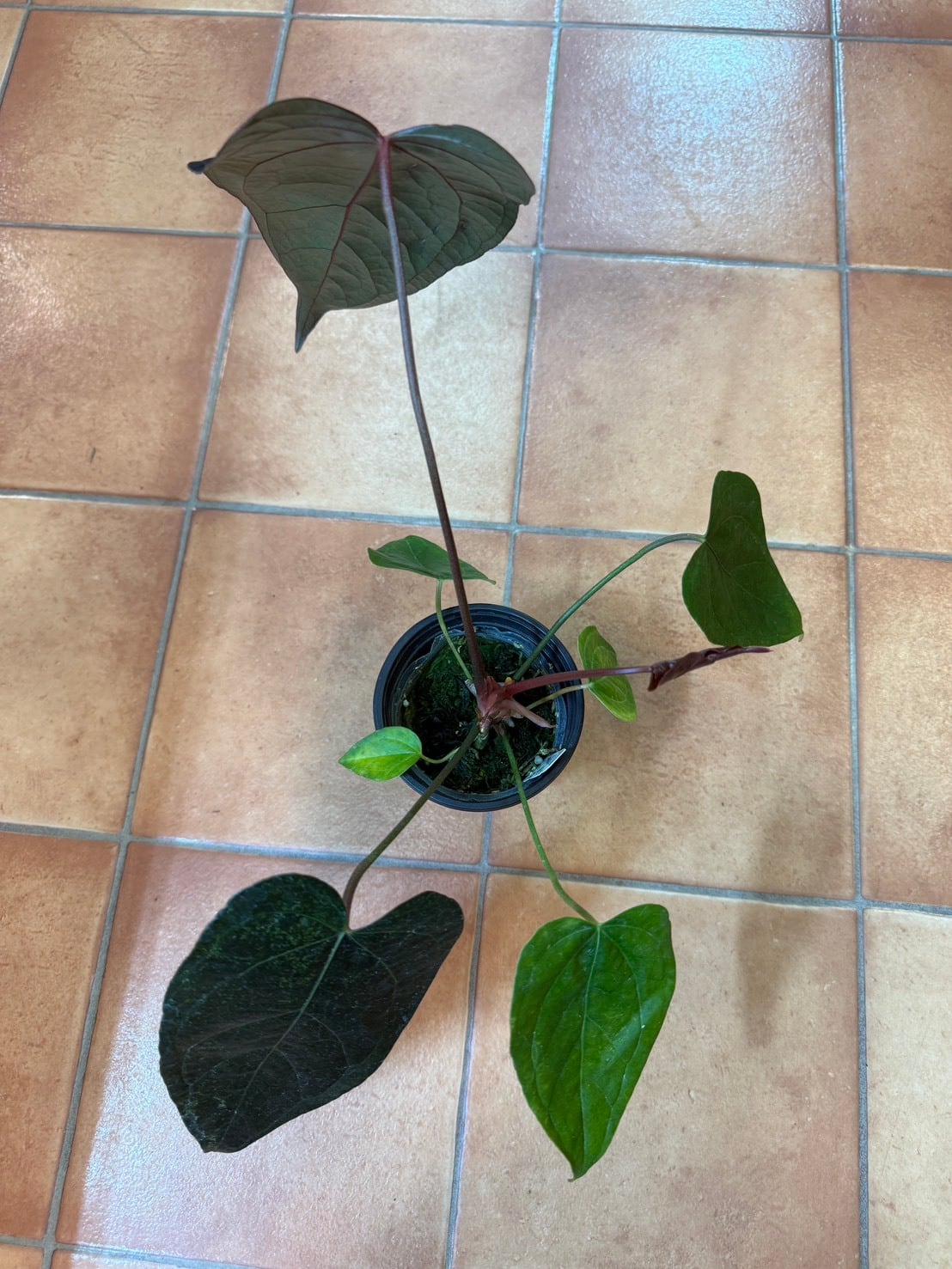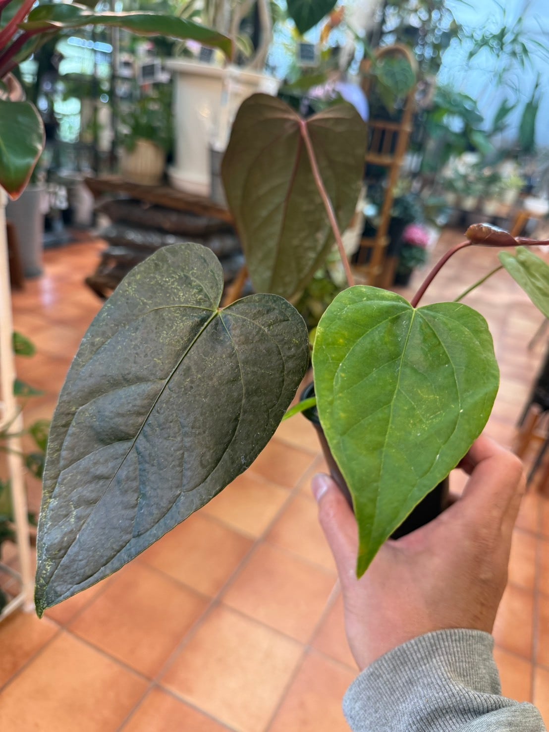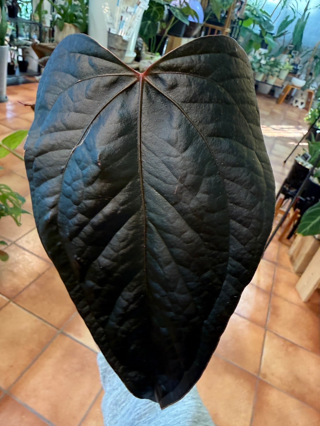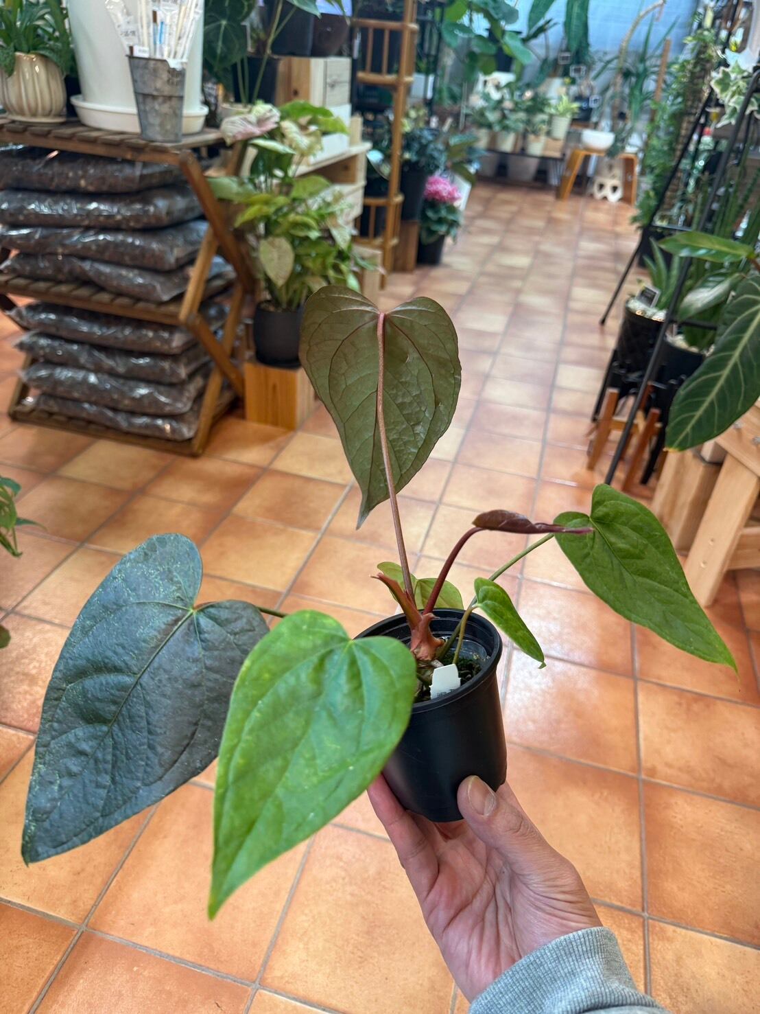 アンスリウム・クイーンオブハートは、名前の由来にもなっている大きなハート型の葉をしています。