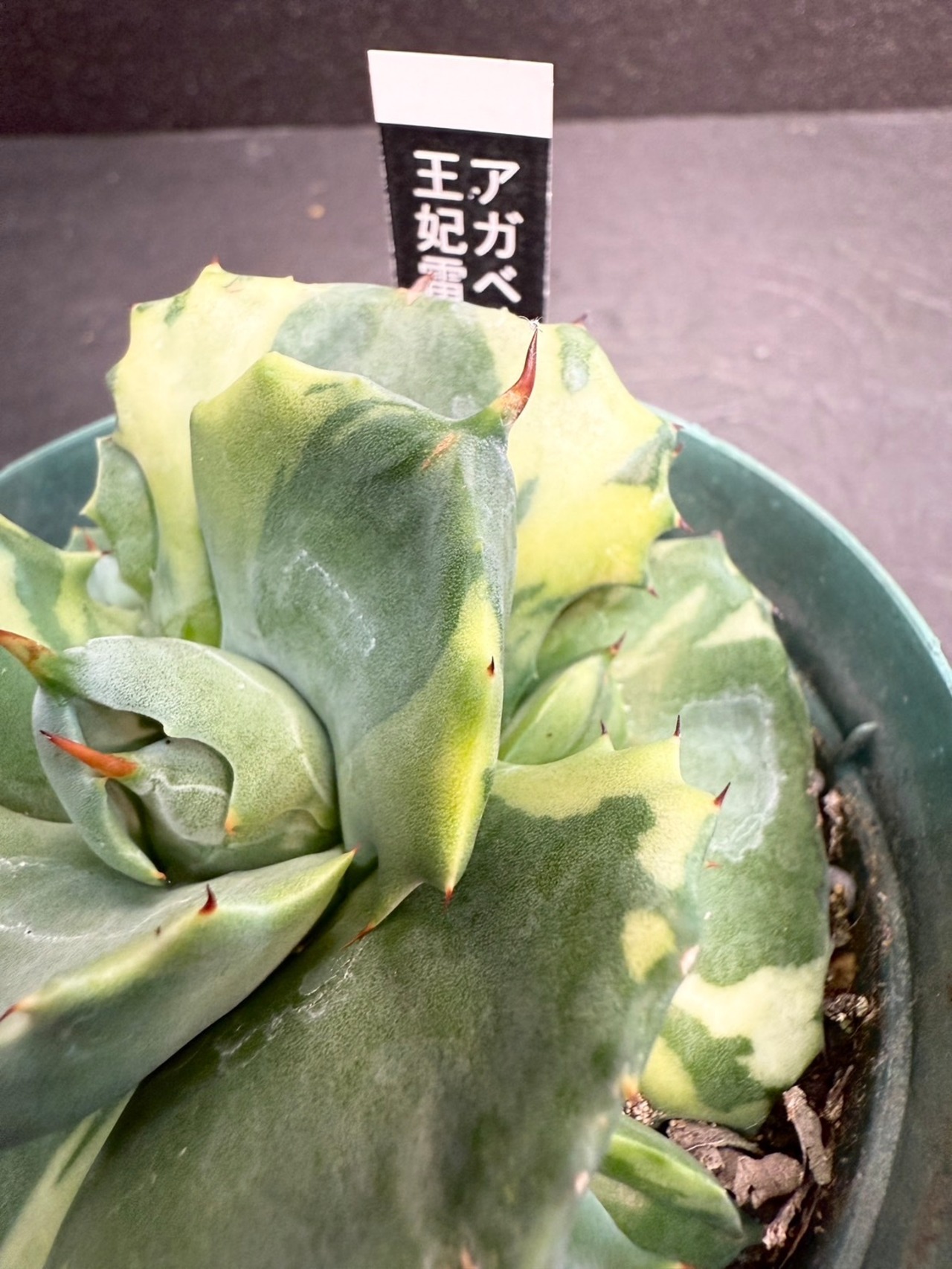 アガベ 王妃雷神 外斑は、硬質で肉厚な葉の縁に白い斑が入ることで、全体的に丸みを帯びたコンパクトなロゼット状の姿をしています。