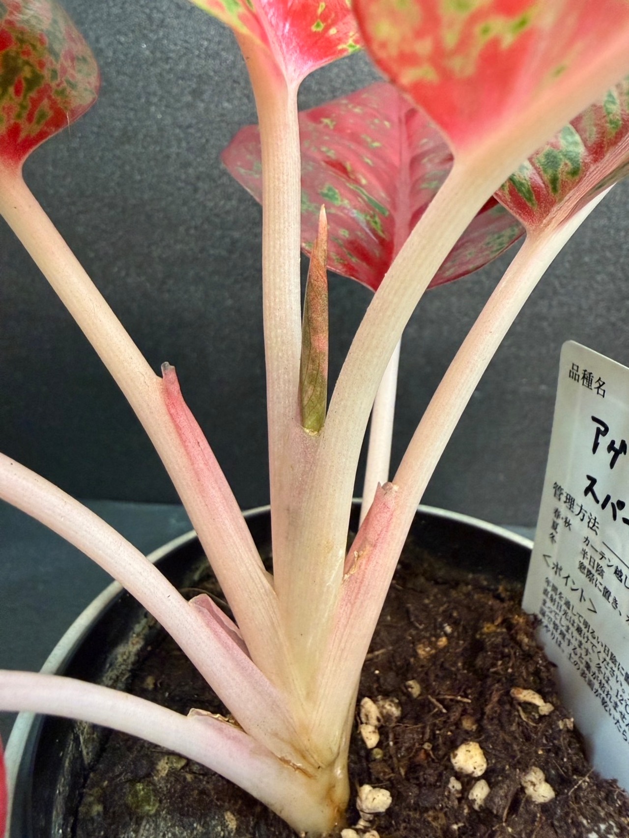 アグラオネマ・スパモンコンは、ニュアンスピンクの葉とピンク色の葉柄が特徴的な観葉植物です。