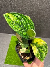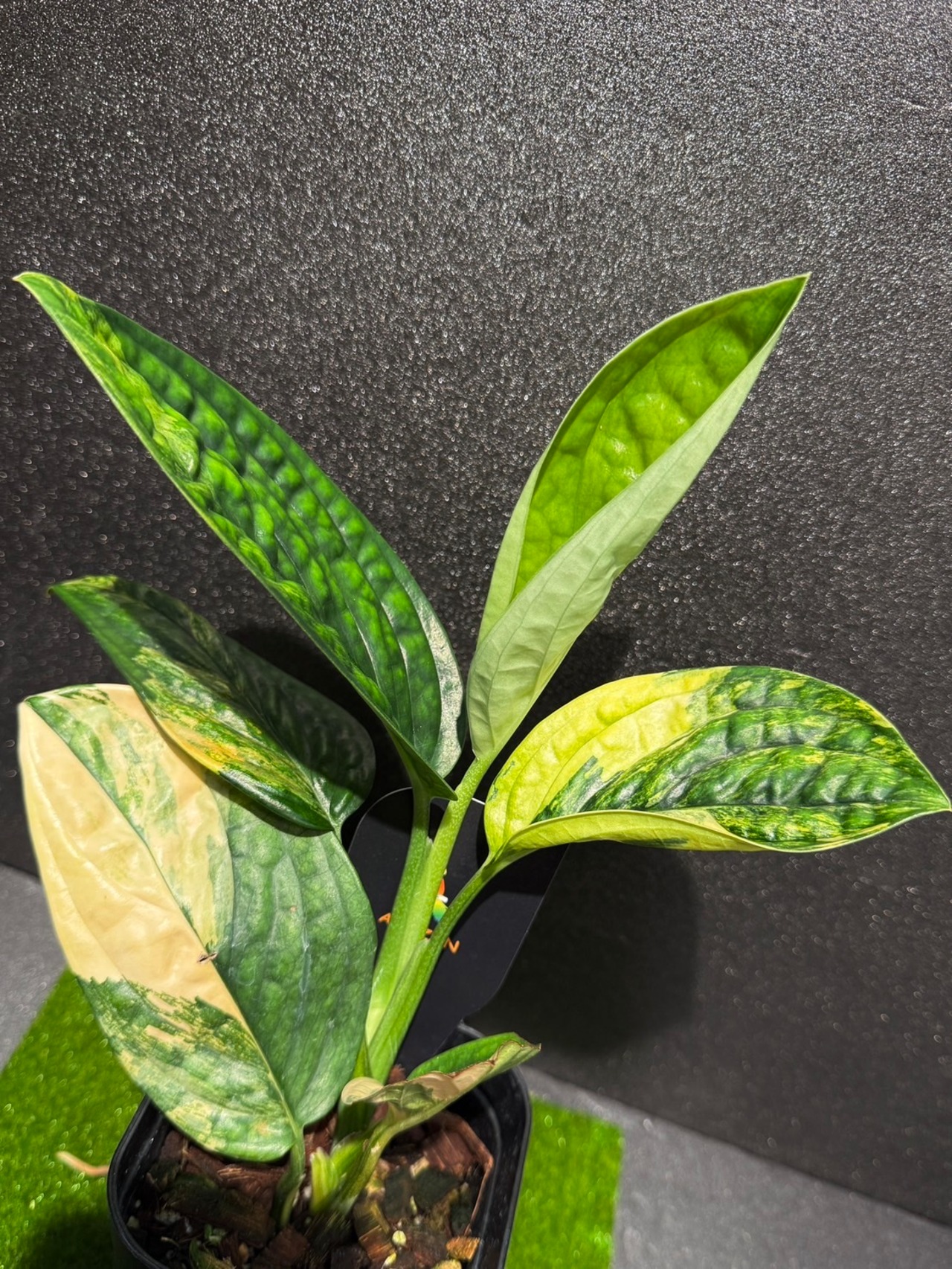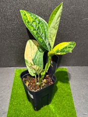 モンステラ・カルステリアナム・バリエガータは、葉に黄白色の斑が入るのが特徴で、通常のカルステリアナムよりも流通量が少なく、希少性が高い品種です。