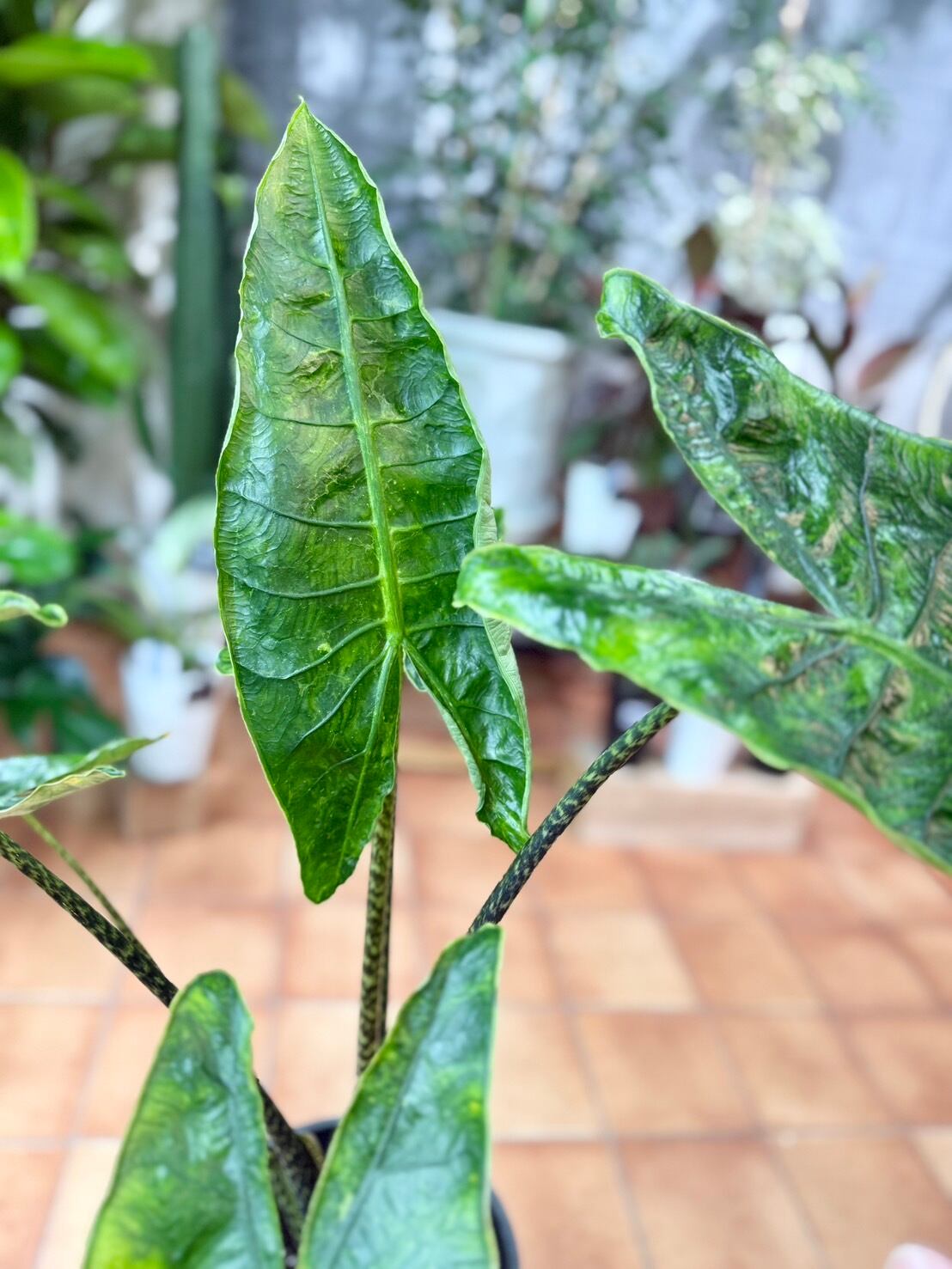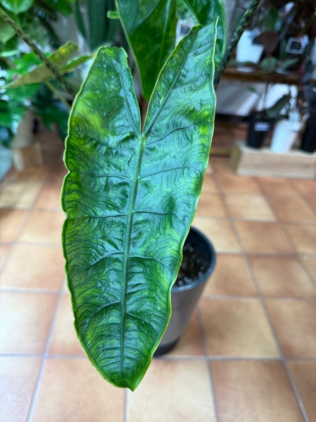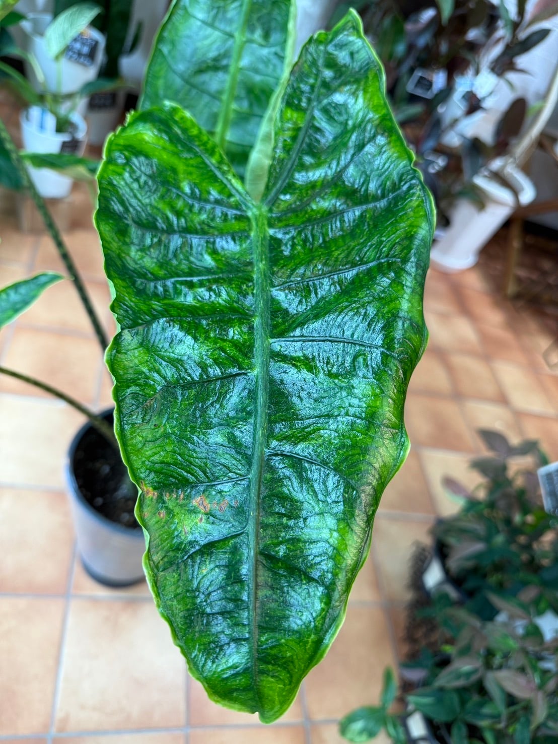 葉には奇妙な色彩効果があり、他のアロカシアには見られない珍しい特徴です。