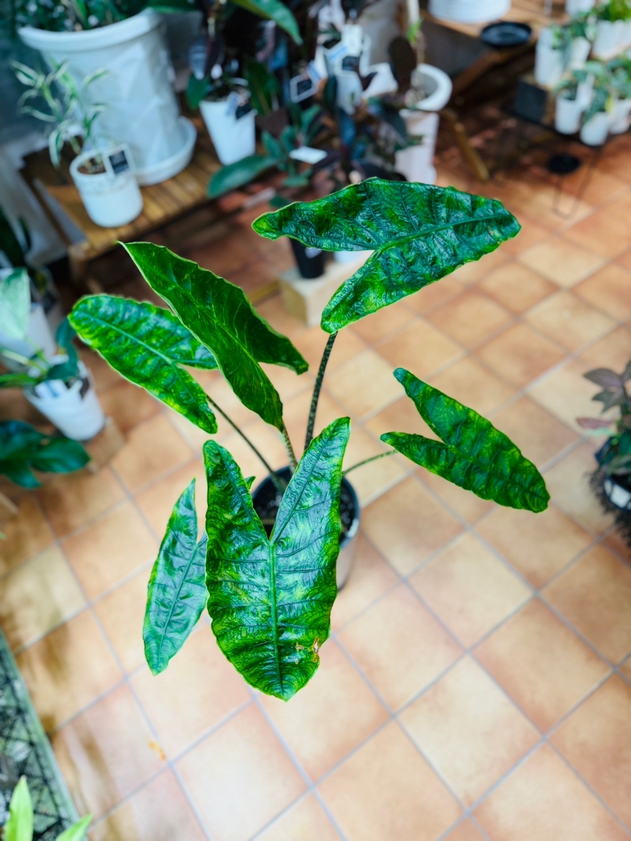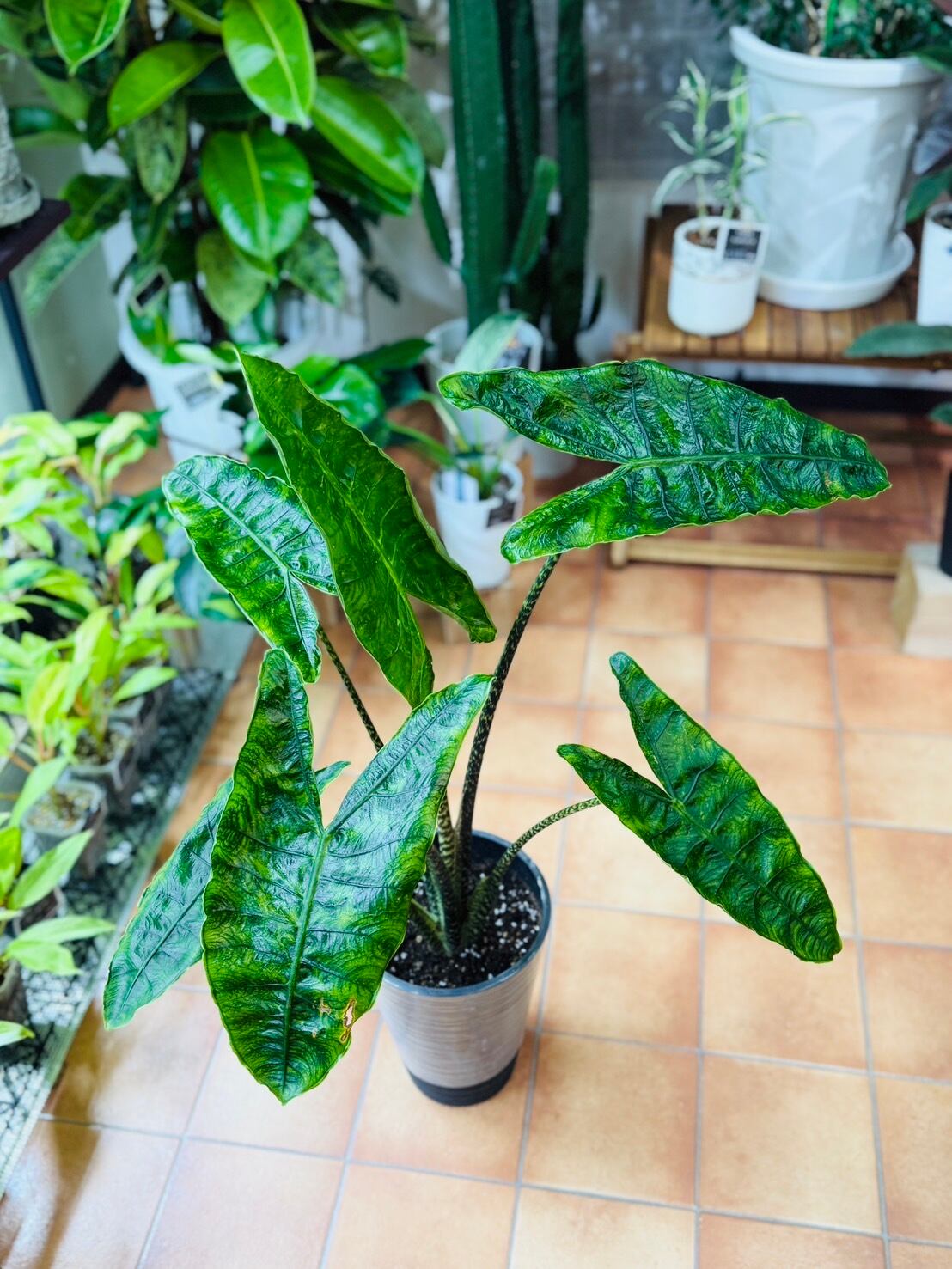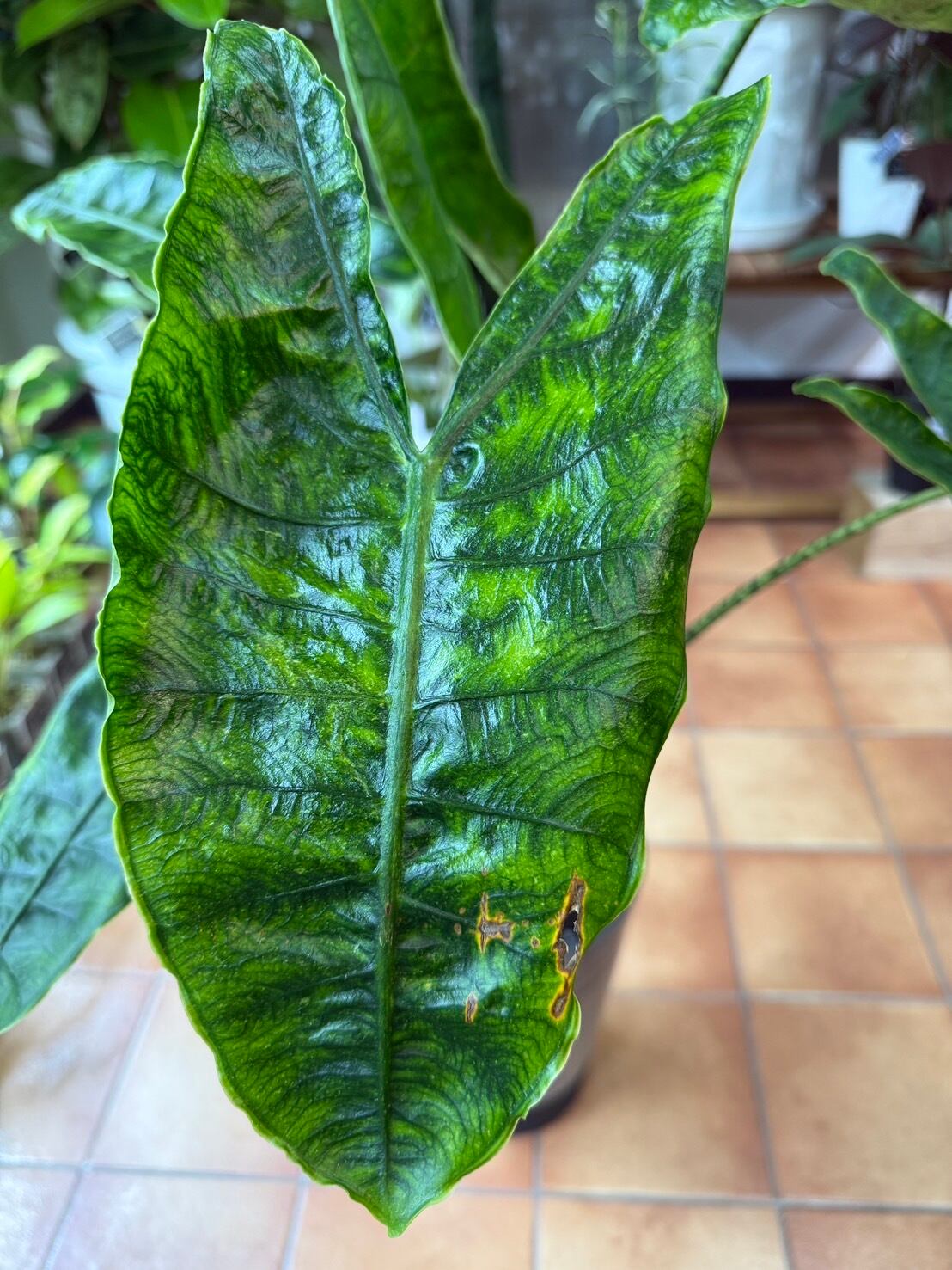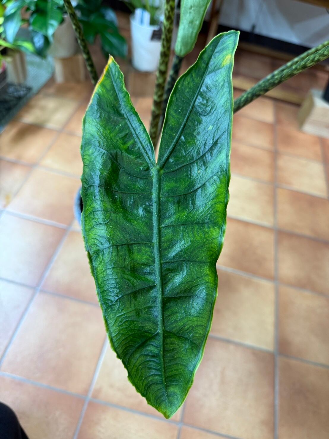 葉には奇妙な色彩効果があり、他のアロカシアには見られない珍しい特徴です。