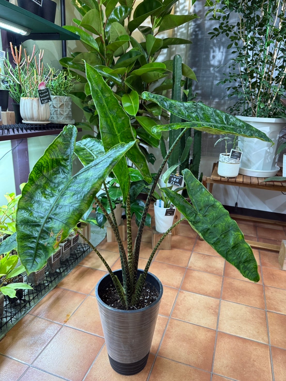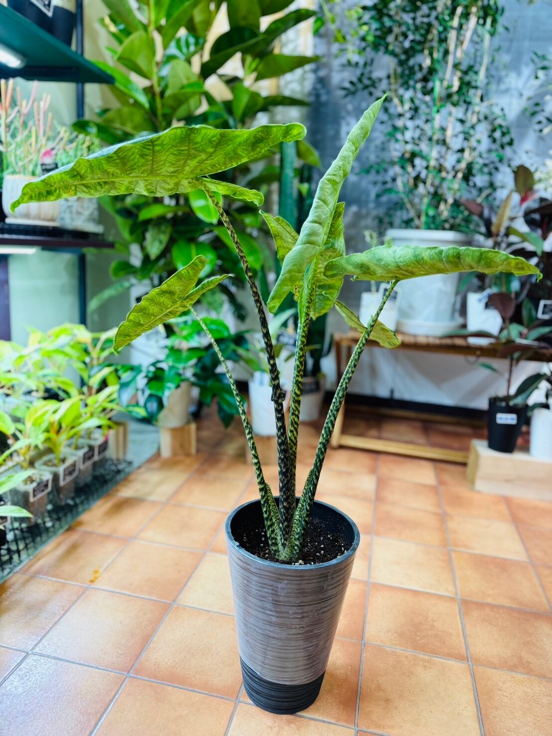 アロカシア・ゼブリナ・レティキュラータはアロカシア ゼブリナ レオパードとも呼ばれ、その美しく細長く、緑と黄色の模様の葉が特徴的です。