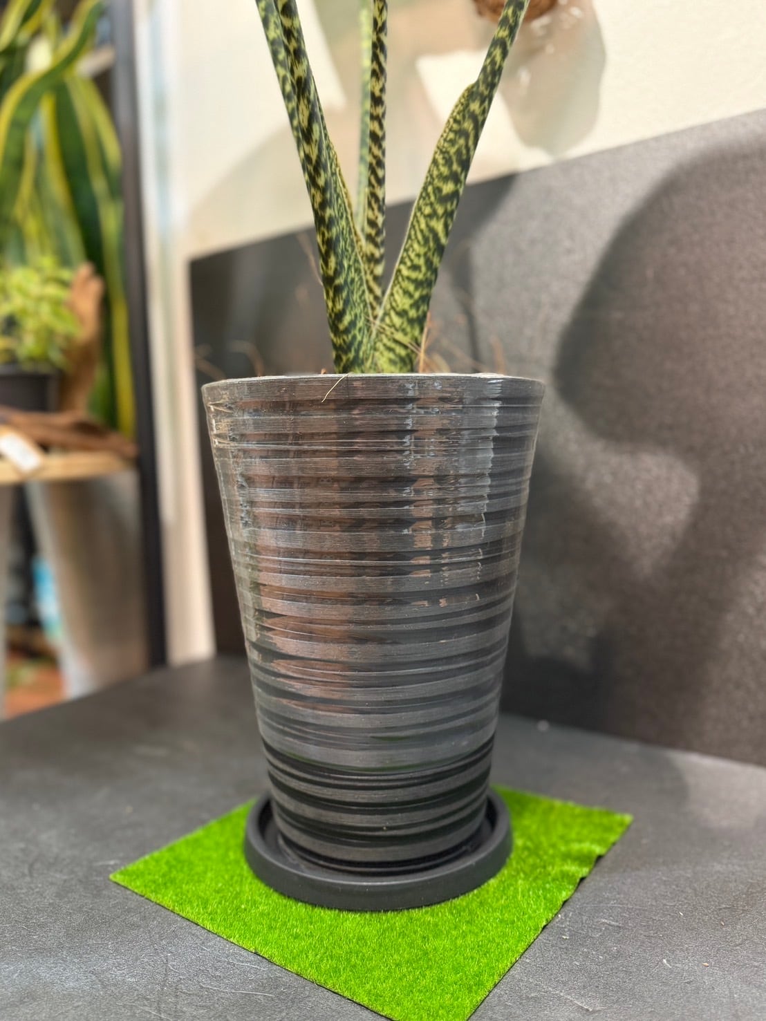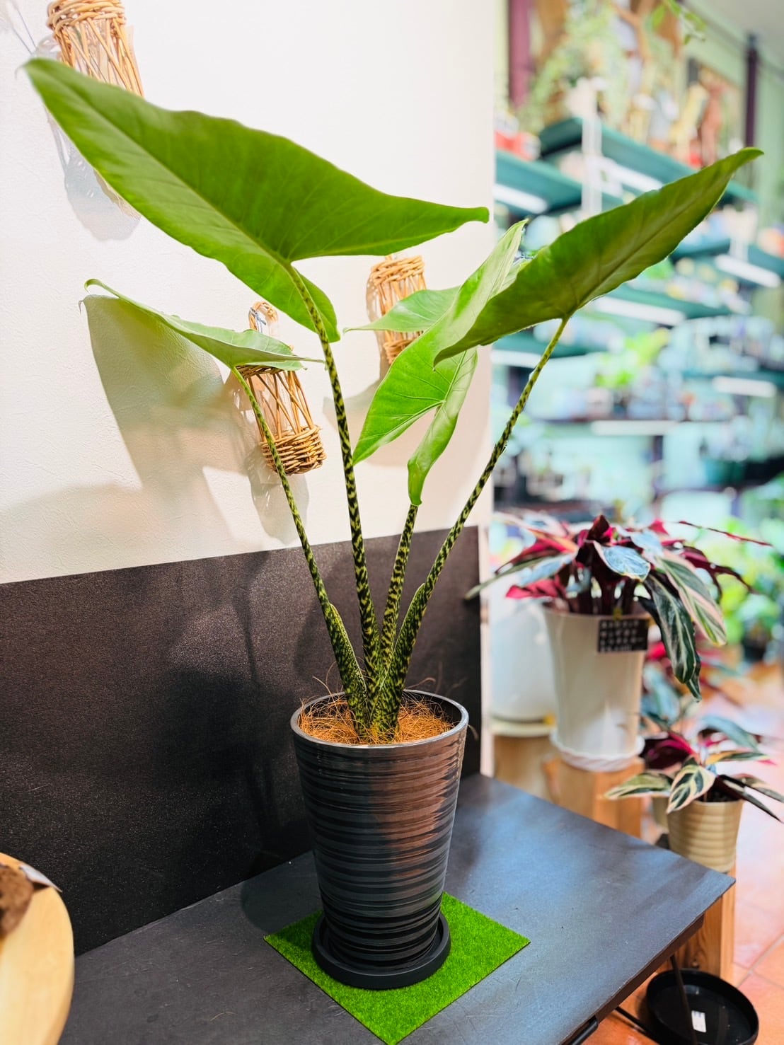 アロカシア・ゼブリナは、シマウマや虎柄を想像させる個性的な模様が入り、葉柄の色は淡い緑色に茶褐色の虎斑がストライプ状に入ります。