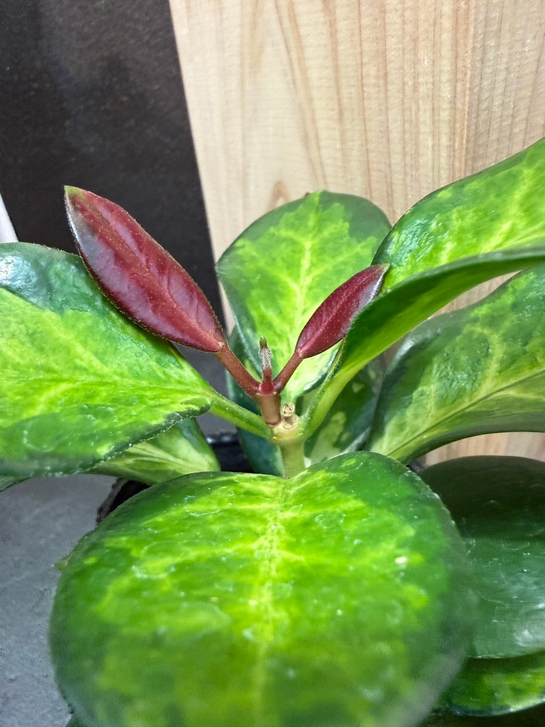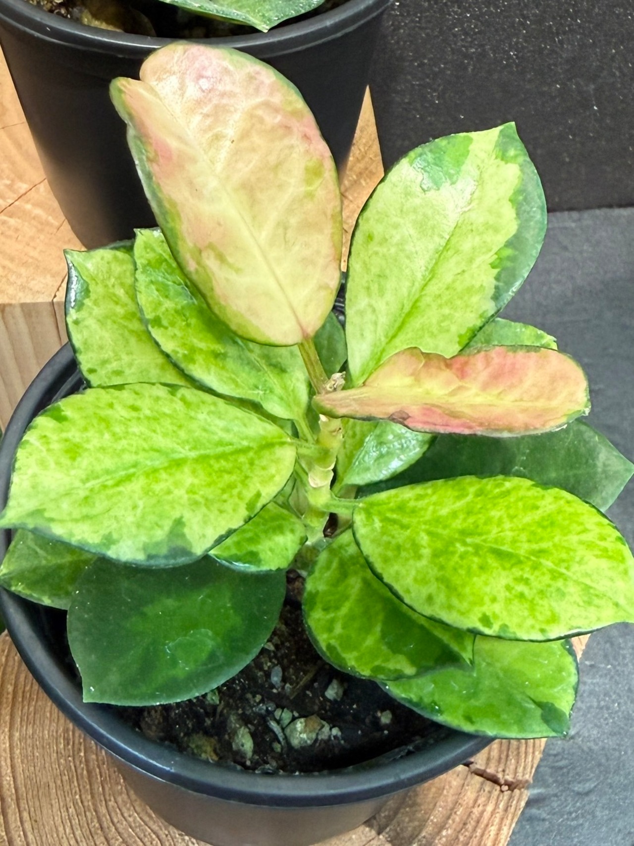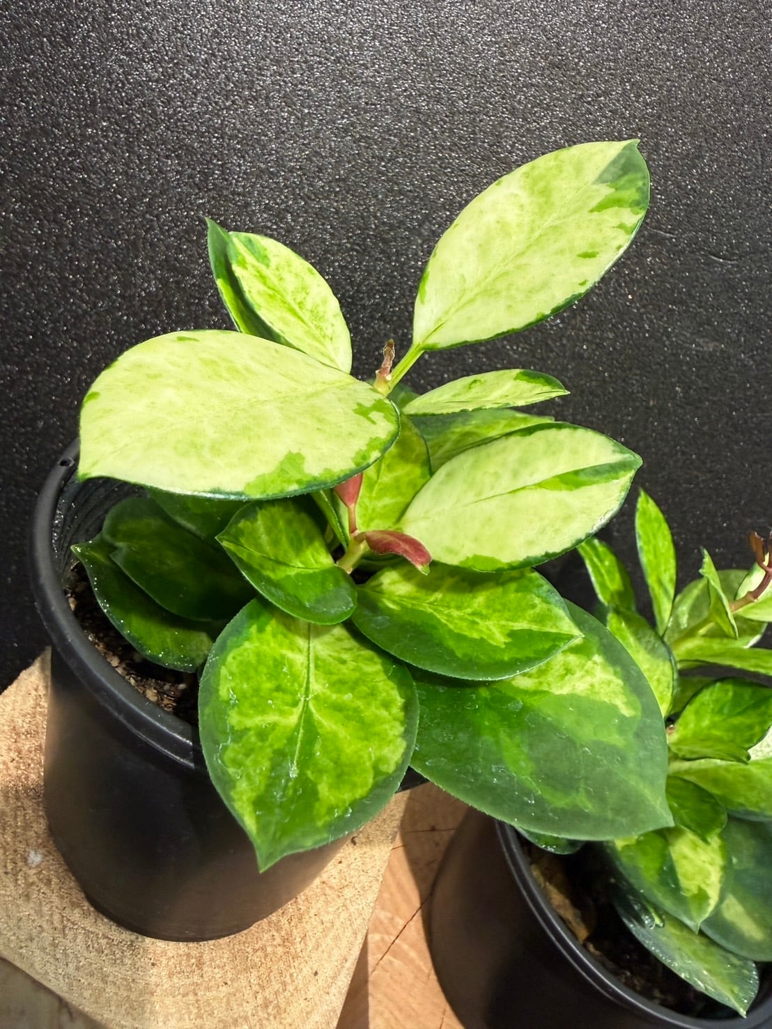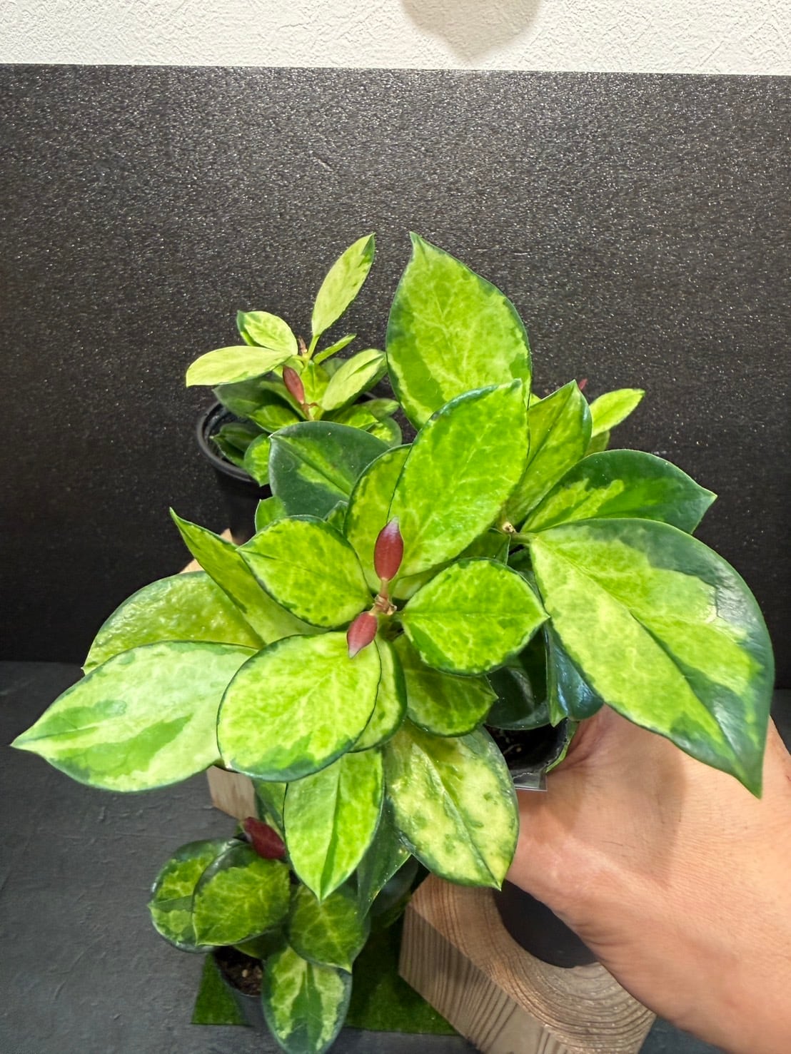 ホヤ・オーストラリス「リサ」は、肉厚で光沢があり、つややかな表面をしており、葉の中にクリーム色や黄緑色の斑が入ります。