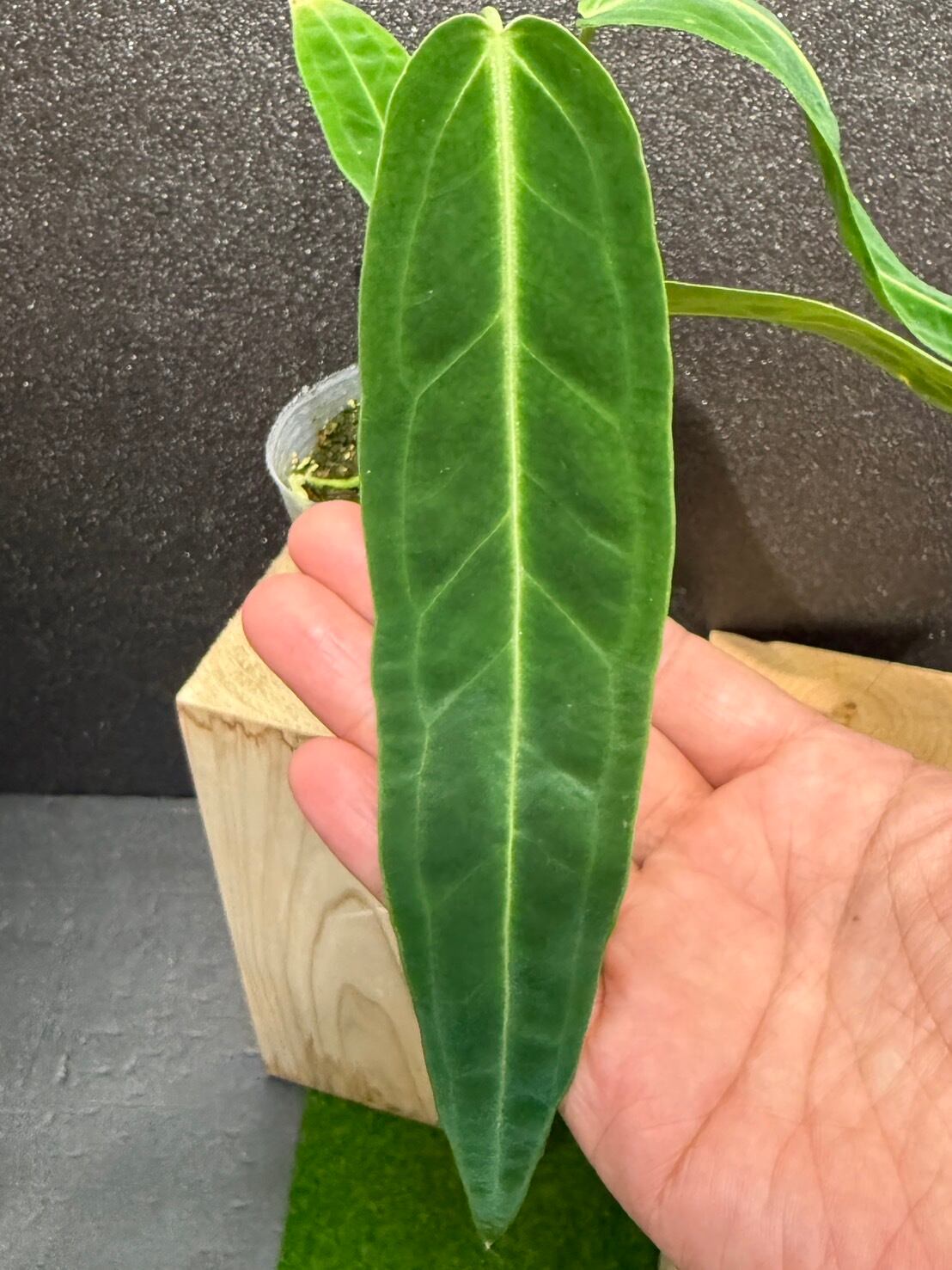 アンスリウム・ワロクアナムは、「アンスリウムの女王」とも呼ばれ、細長くベルベットのような光沢のある美しい葉が特徴です。葉は濃緑色でビロードのような質感を持ち、成長すると1メートル近くになることもあり、優雅に垂れ下がる葉姿が魅力です。
