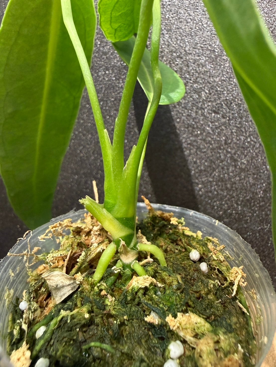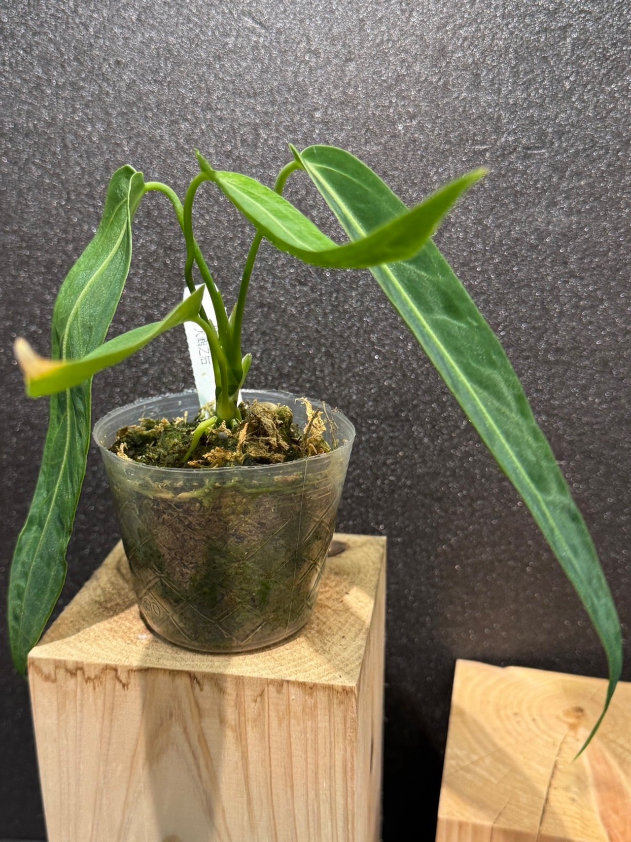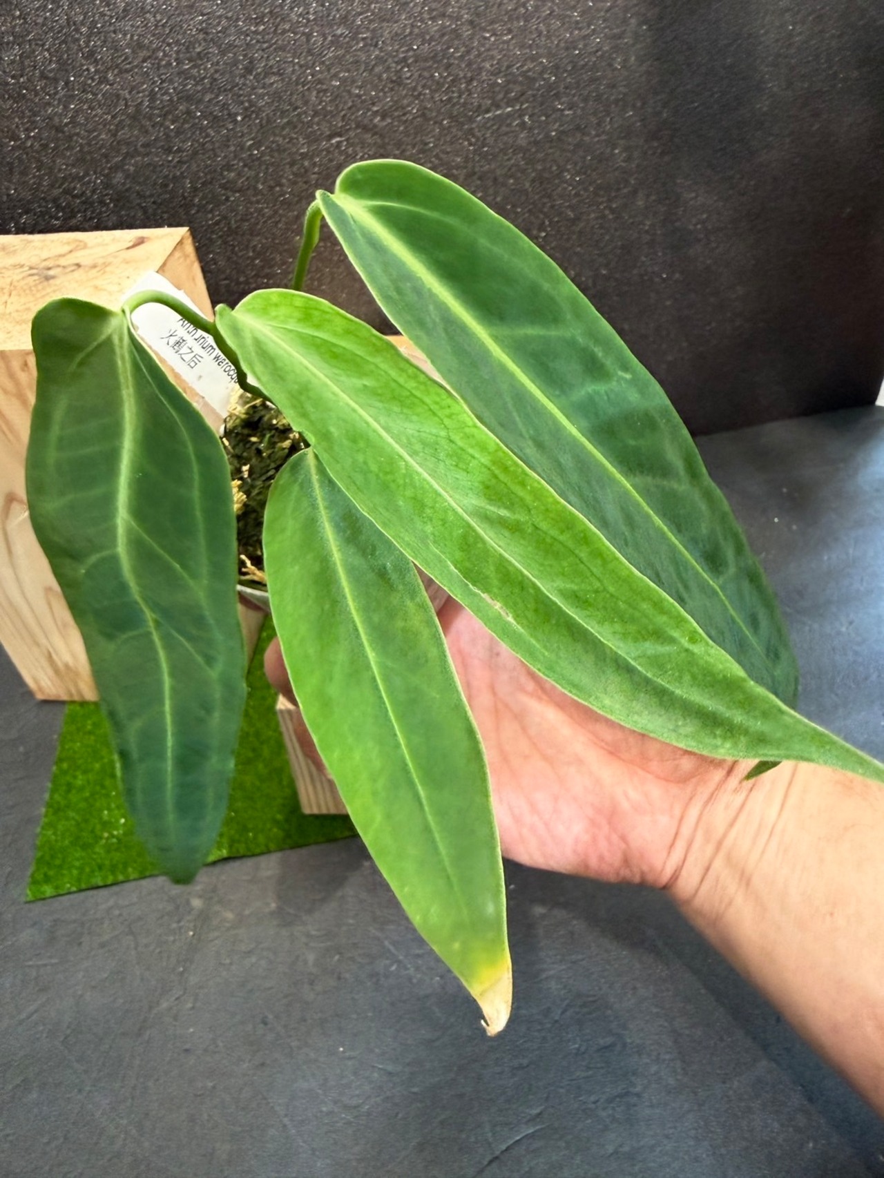 アンスリウム・ワロクアナムは、「アンスリウムの女王」とも呼ばれ、細長くベルベットのような光沢のある美しい葉が特徴です。葉は濃緑色でビロードのような質感を持ち、成長すると1メートル近くになることもあり、優雅に垂れ下がる葉姿が魅力です。