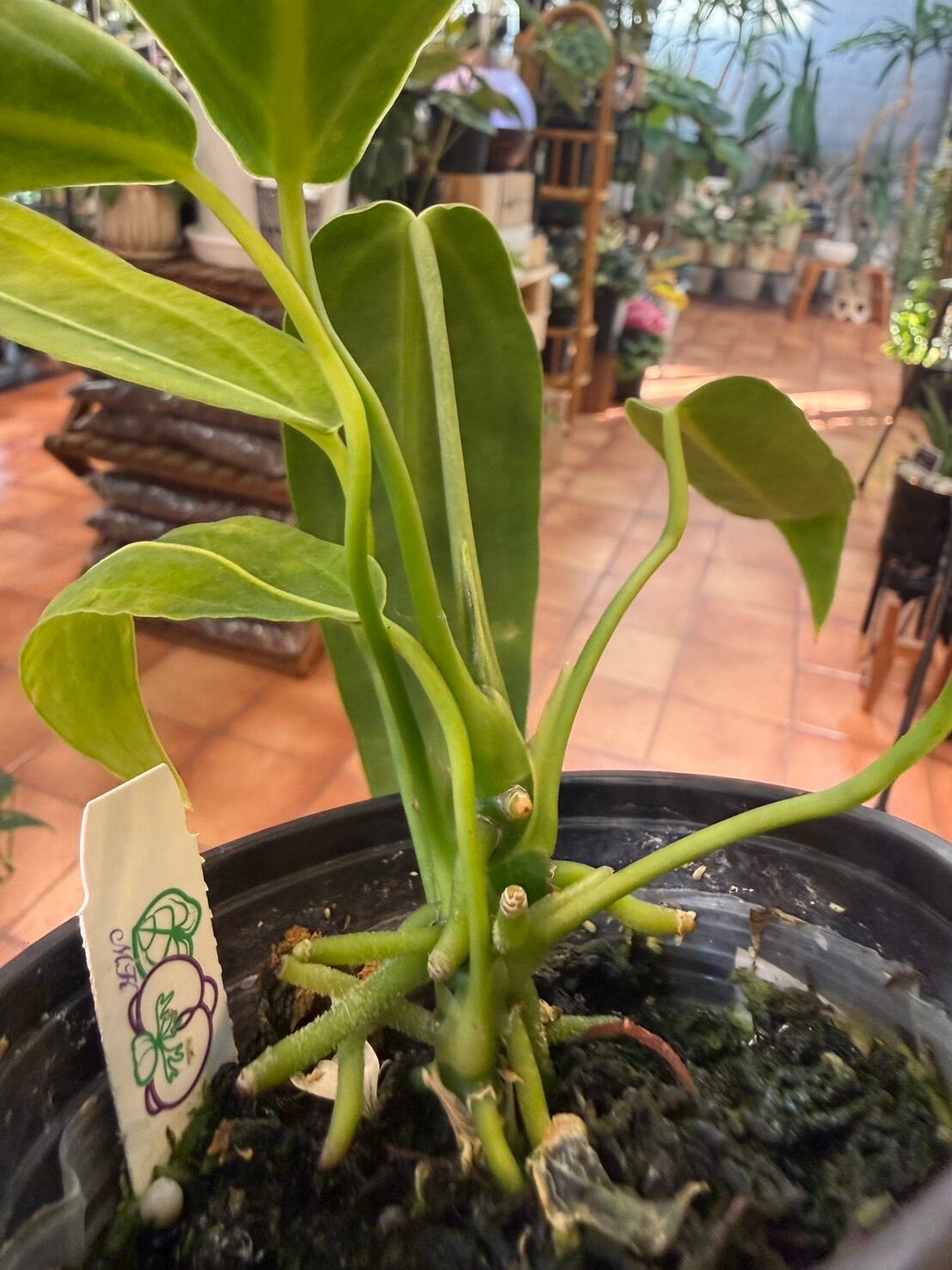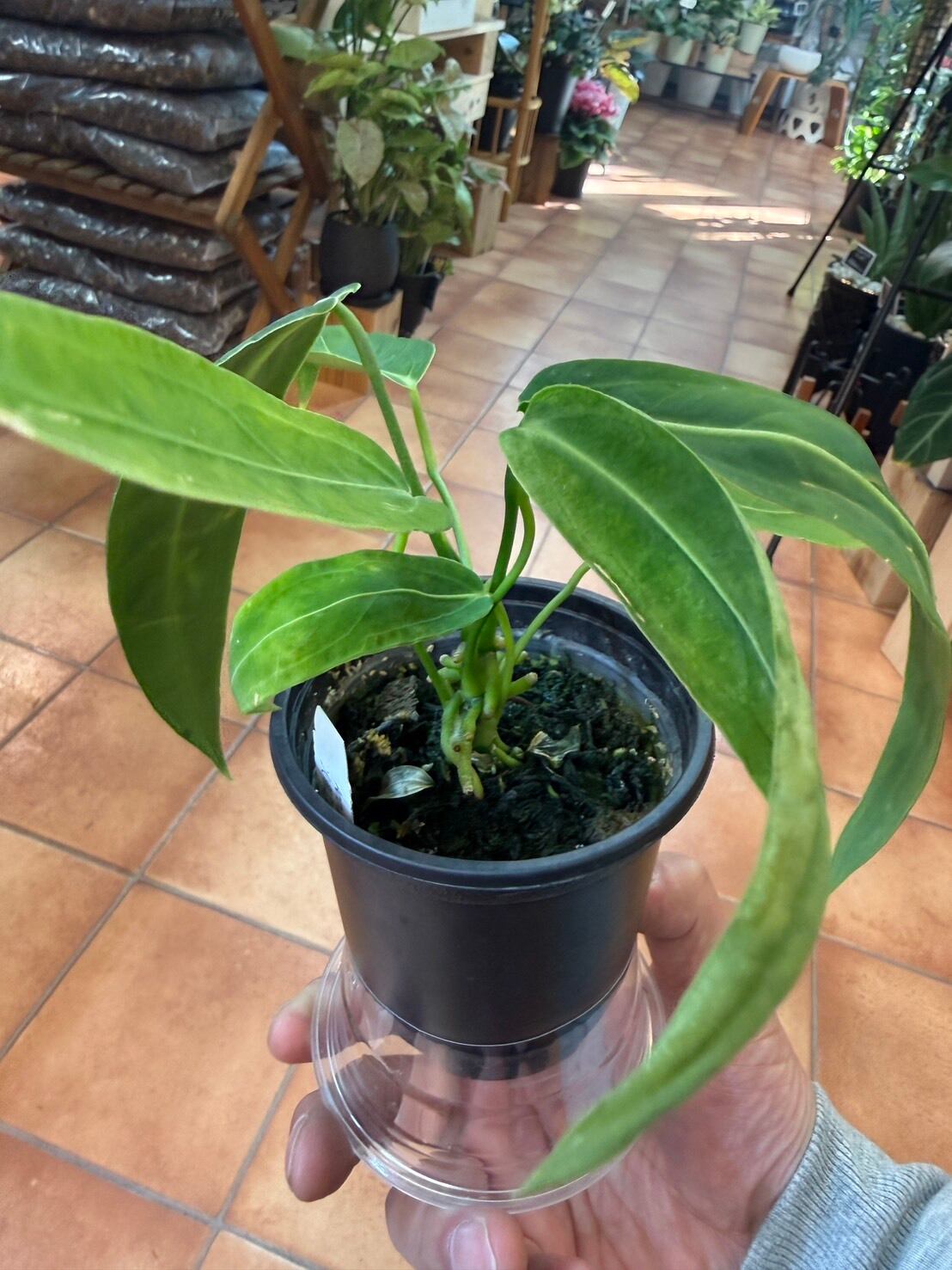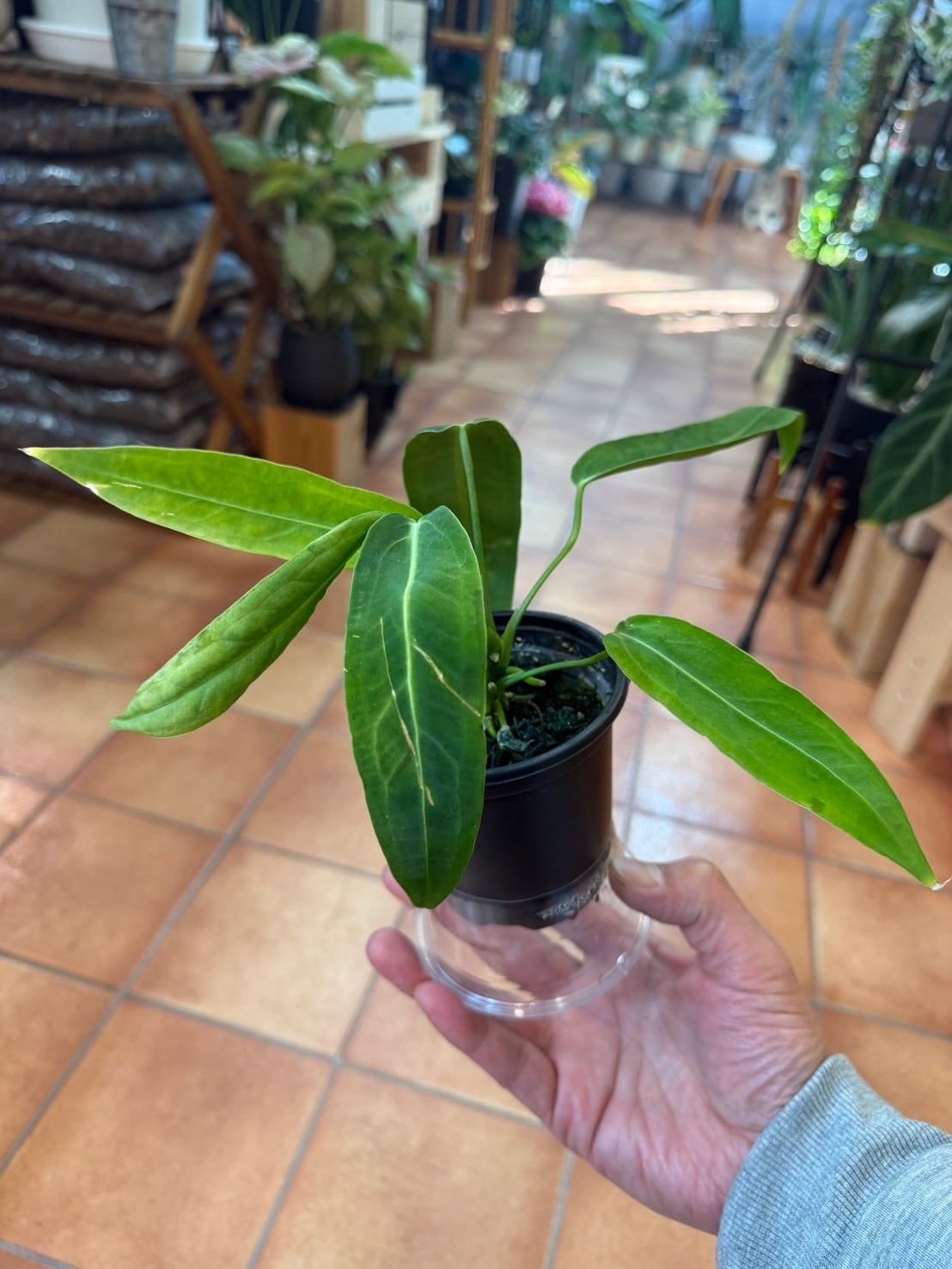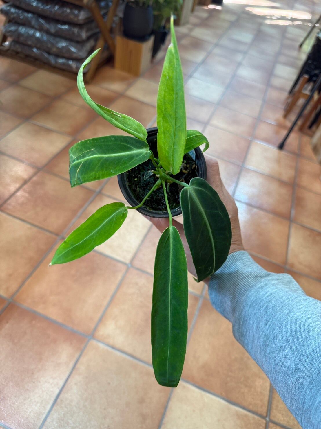 アンスリウム・ワロクアナムは、「アンスリウムの女王」とも呼ばれ、細長くベルベットのような光沢のある美しい葉が特徴です。葉は濃緑色でビロードのような質感を持ち、成長すると1メートル近くになることもあり、優雅に垂れ下がる葉姿が魅力です。