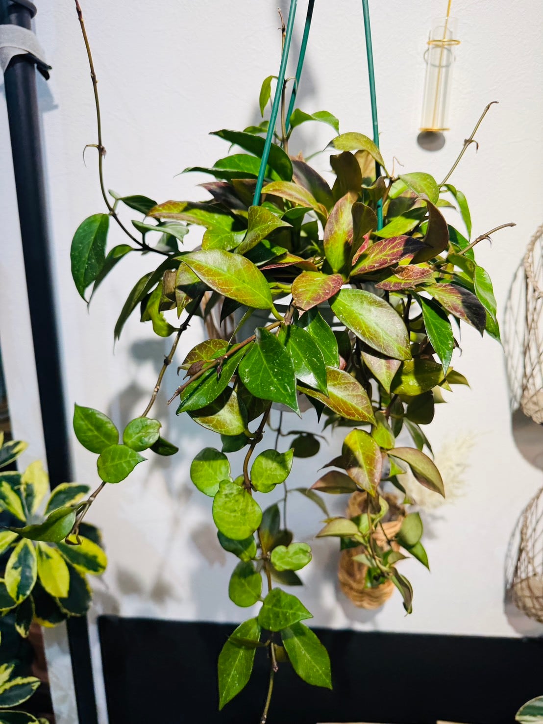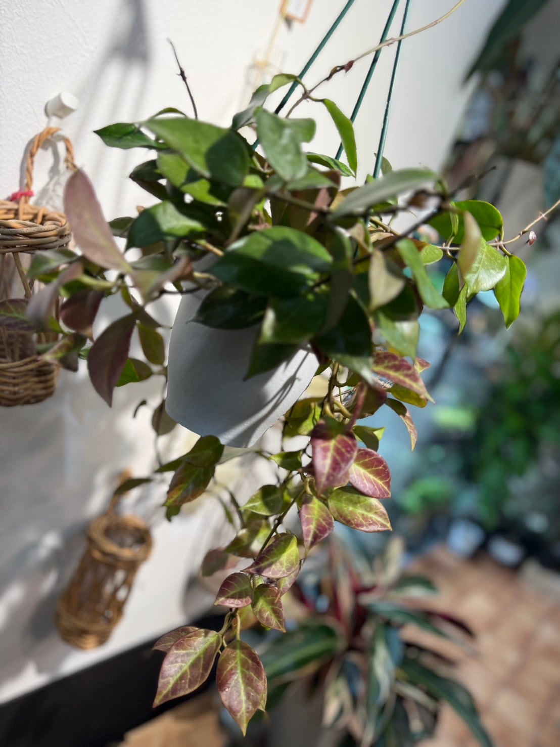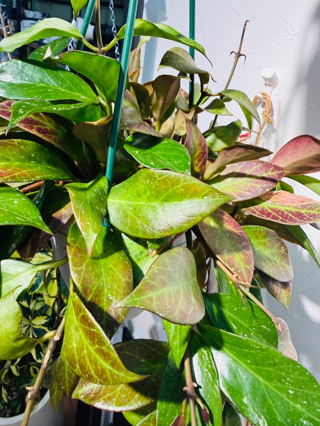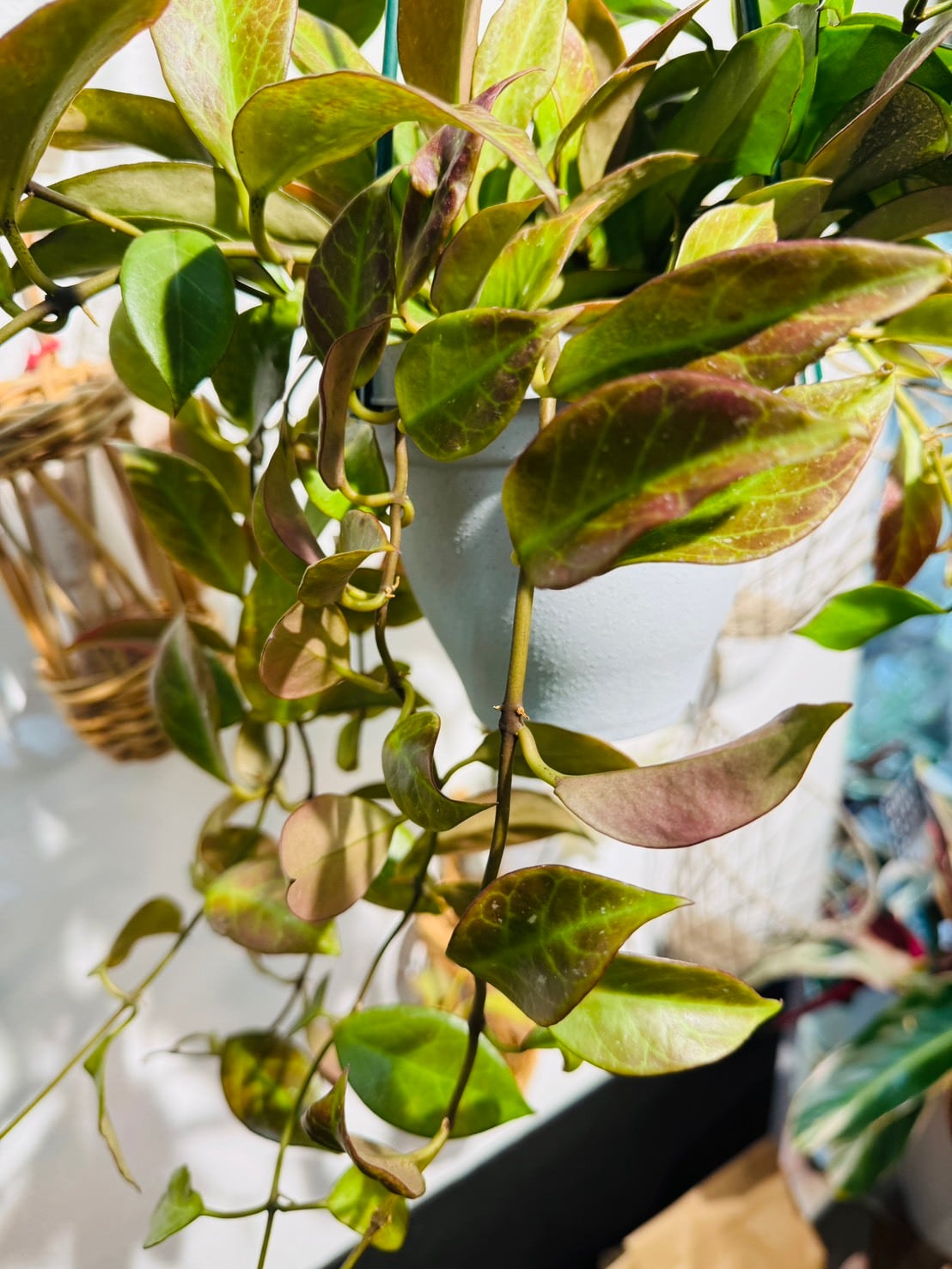 ホヤ・オブスクラ(Hoya obscura)の最大の特徴は、日光の当たり具合によって葉の色が緑色から美しい赤色へと変化する点です。