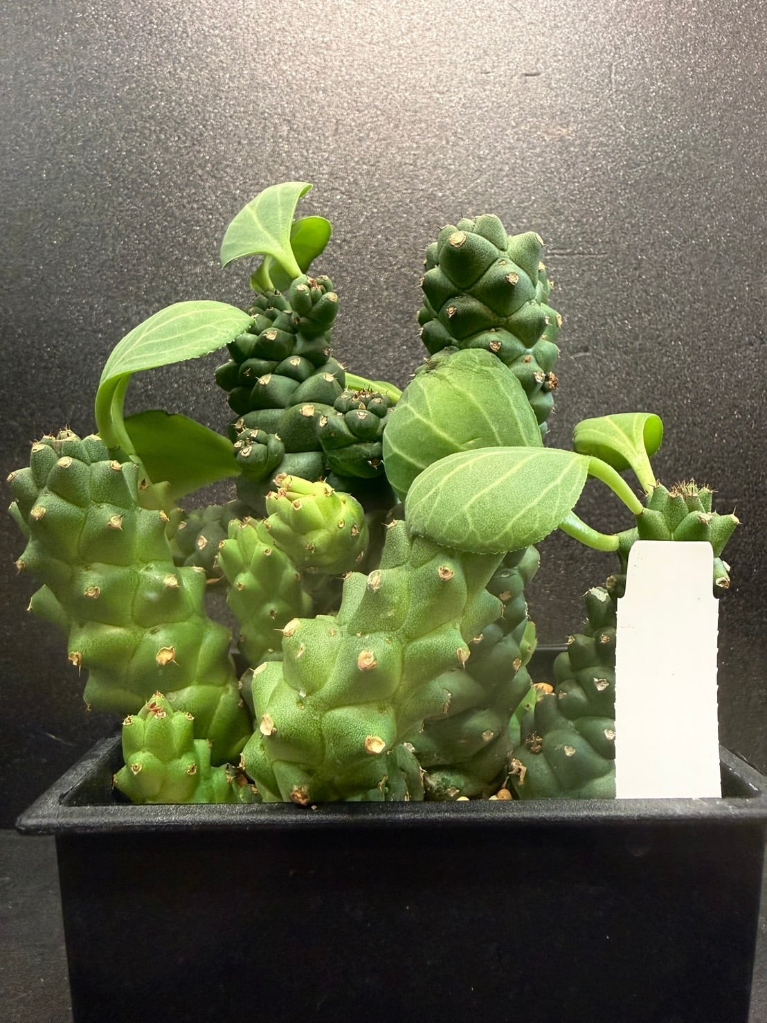 モナデニウム・リチェイは、コブが重なったような独特の肌を持ち、「イモムシ」や「パイナップル」に例えられる愛嬌のある姿をしています。