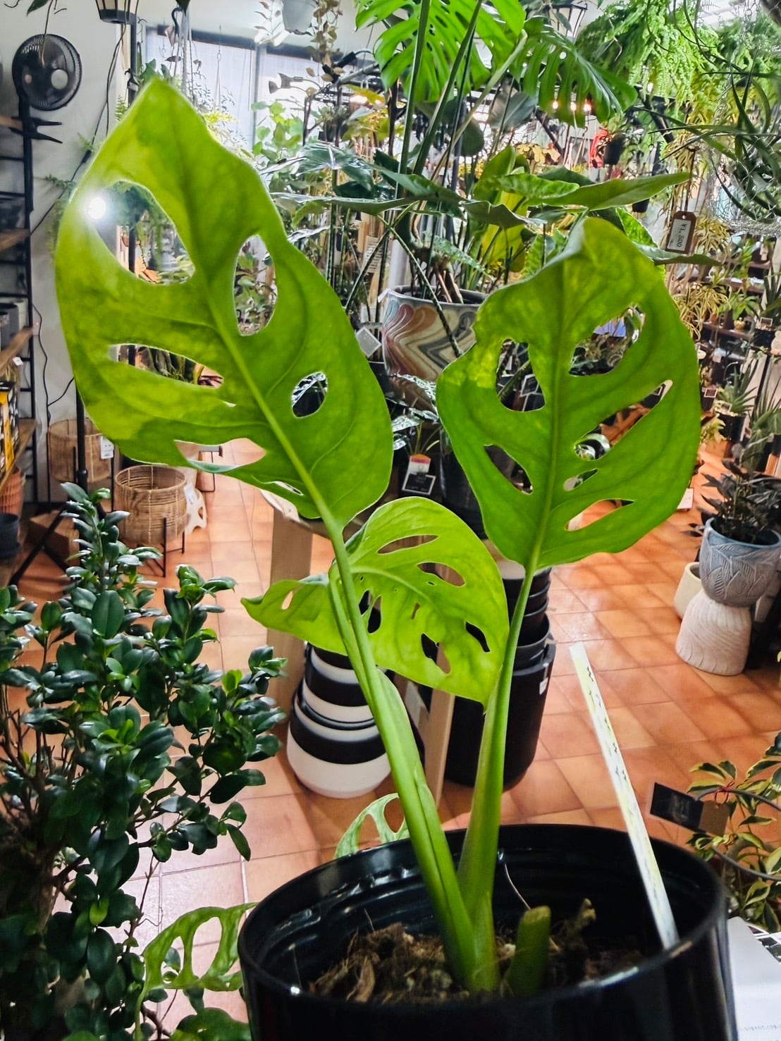 モンステラ・アダンソニー (マドカズラ)はモスポールに立てて葉を大きく育てる、ハンギングにして垂らして育てるなど、いろんな育て方が楽しめます。