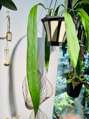 アンスリウム・ビッタリフォリウムは、日本では「ネクタイ」、海外で「ストラップリーフ」と言われる細長く垂れ下がった葉が特徴のアンスリウムです。