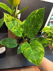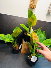 フィロデンドロン・グリーンコンゴ 斑入り(バリエガータ)は、深い緑色をベースに、黄色やクリーム色の散斑が不規則に入る独特の葉色が特徴のフィロデンドロンです。