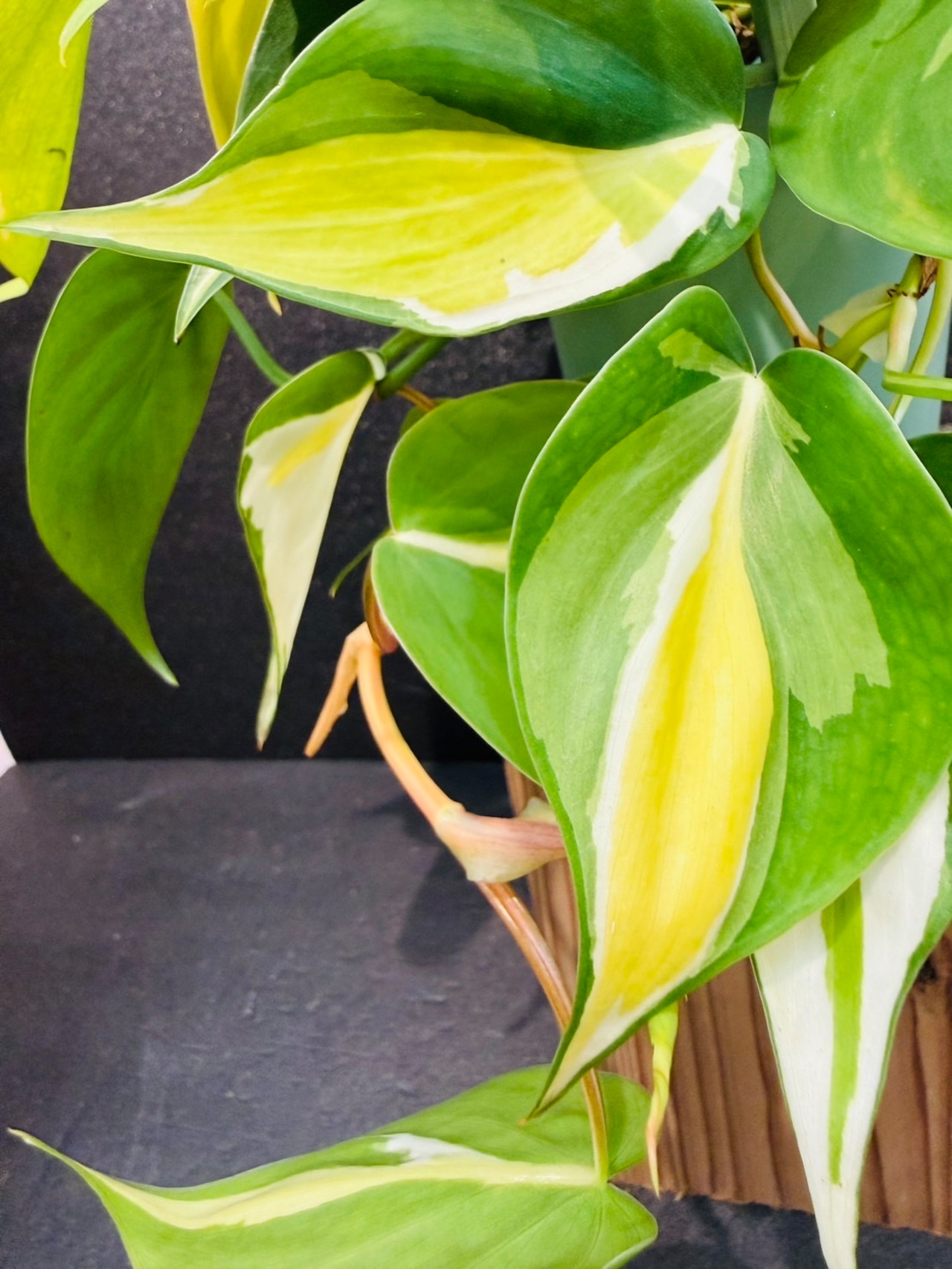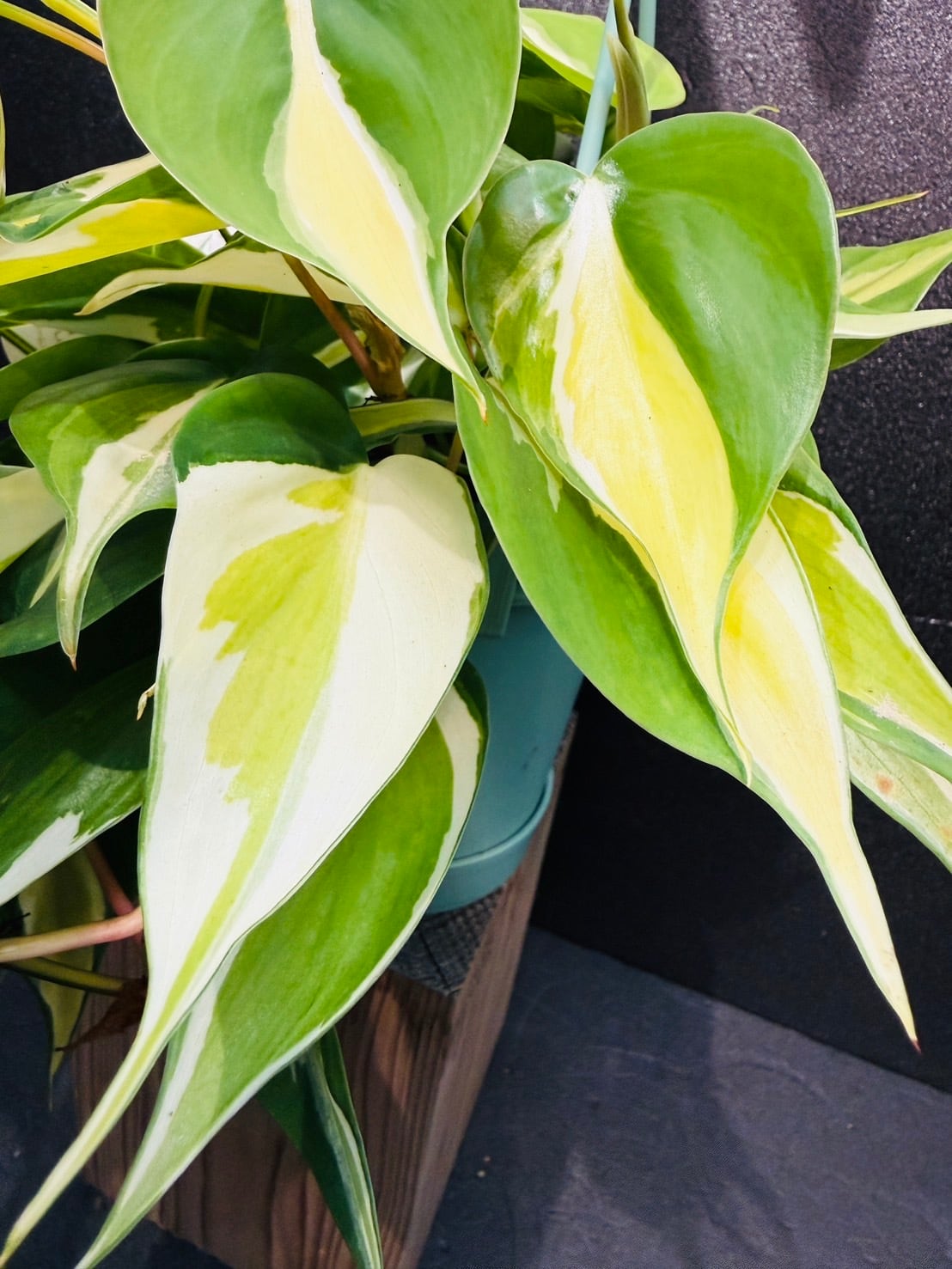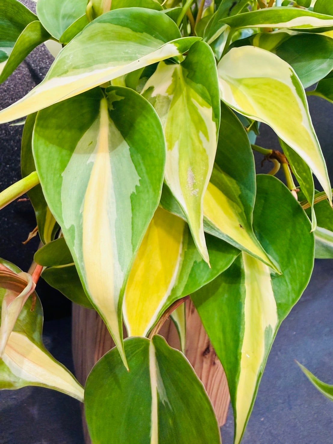 オキシカルジウム・クリームスプラッシュは、葉の色が緑色・黄緑色・黄色の三色で構成されており、葉の中心部に中班が入る傾向があります。
