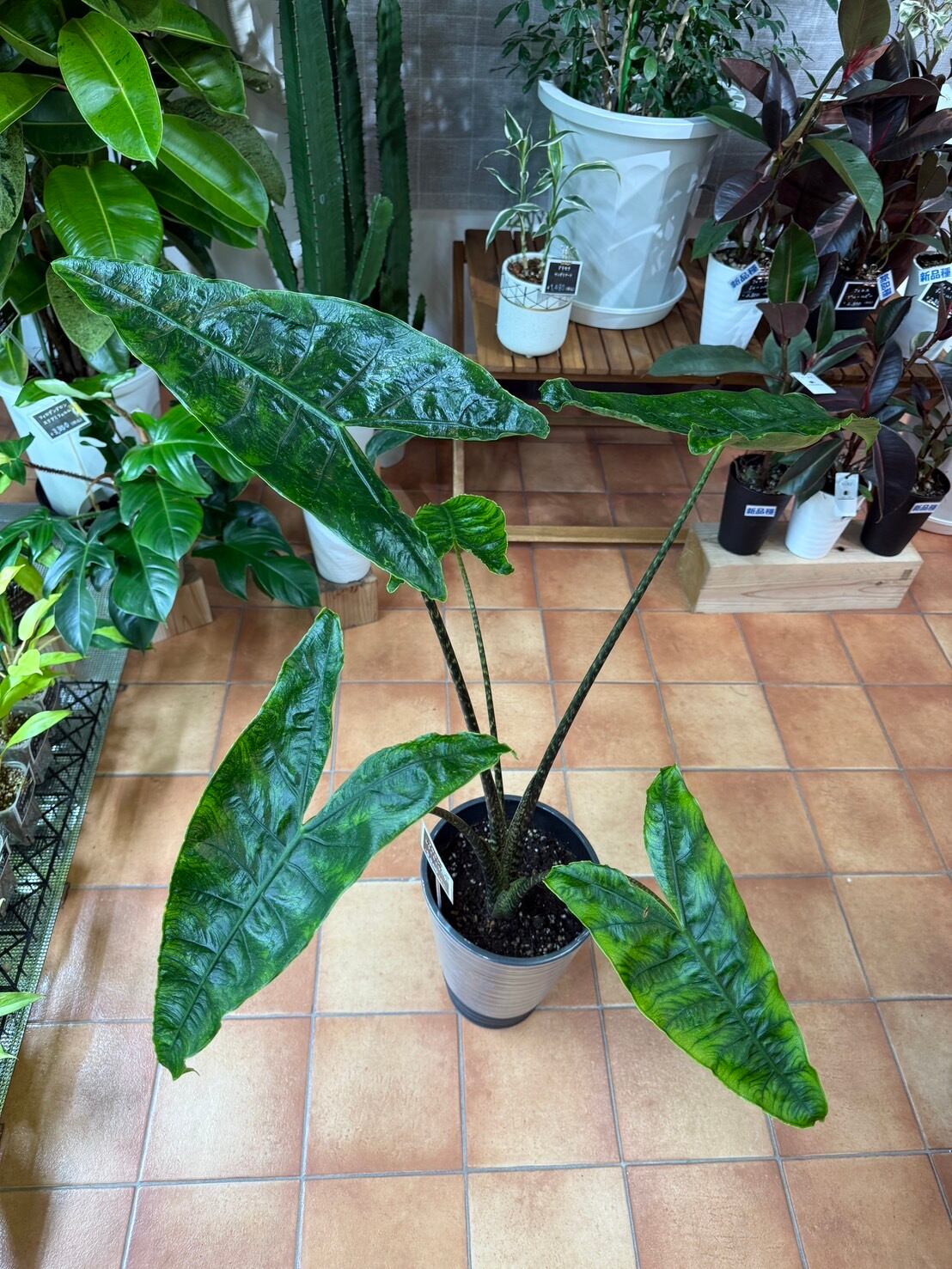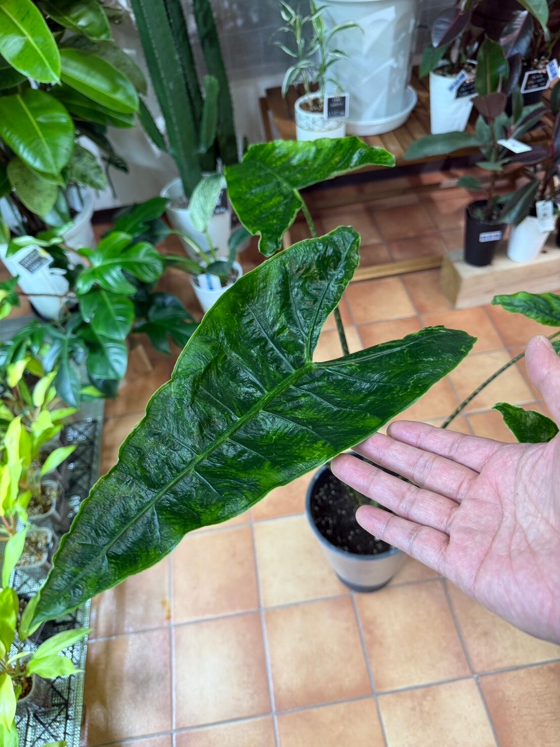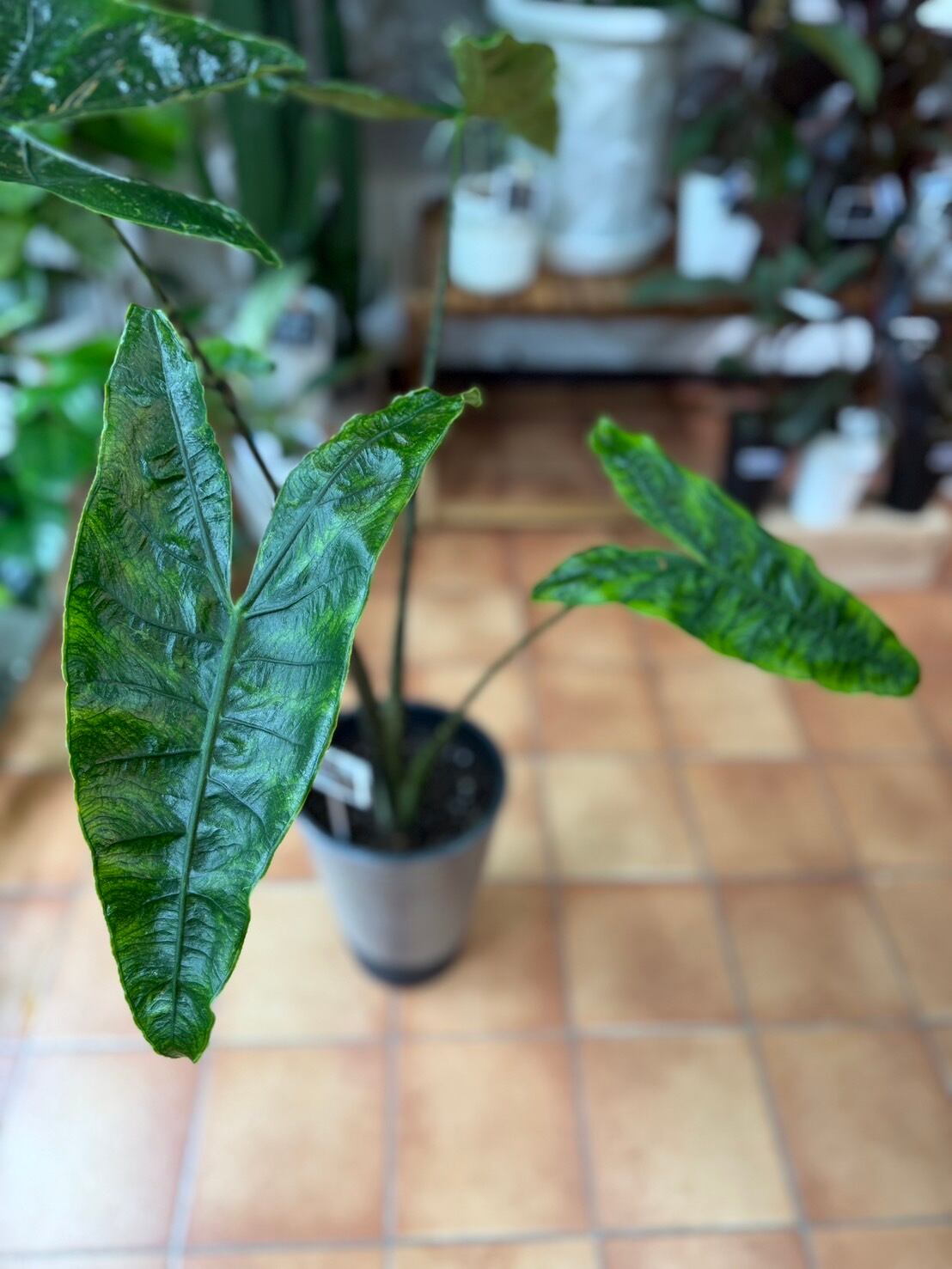 葉には奇妙な色彩効果があり、他のアロカシアには見られない珍しい特徴です。