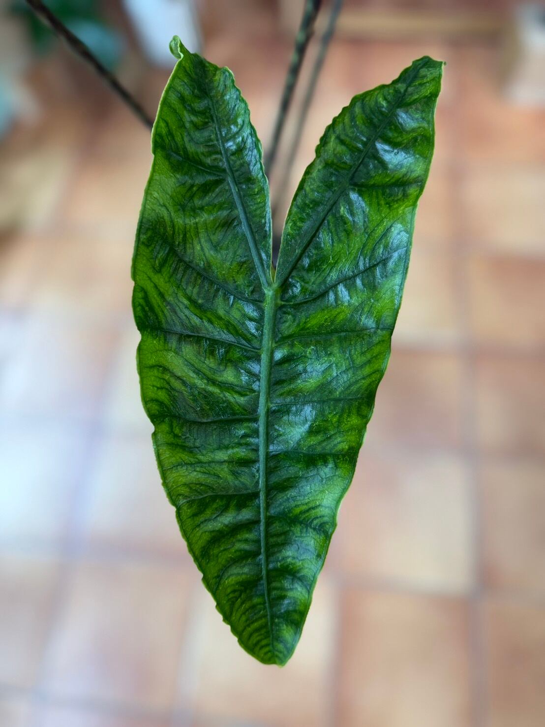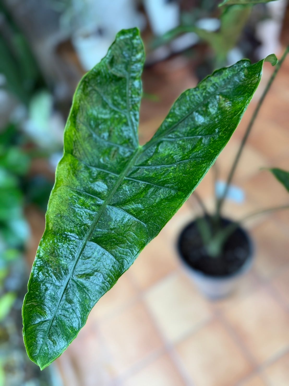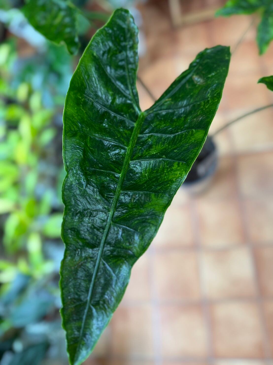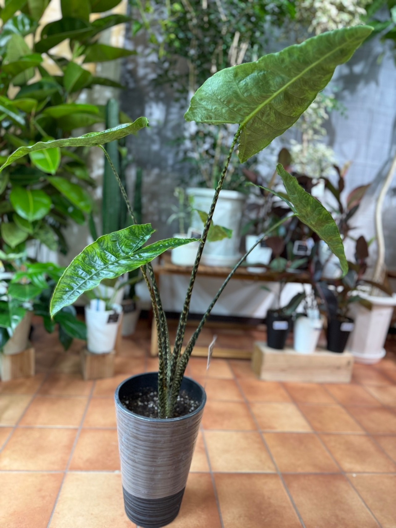 葉には奇妙な色彩効果があり、他のアロカシアには見られない珍しい特徴です。