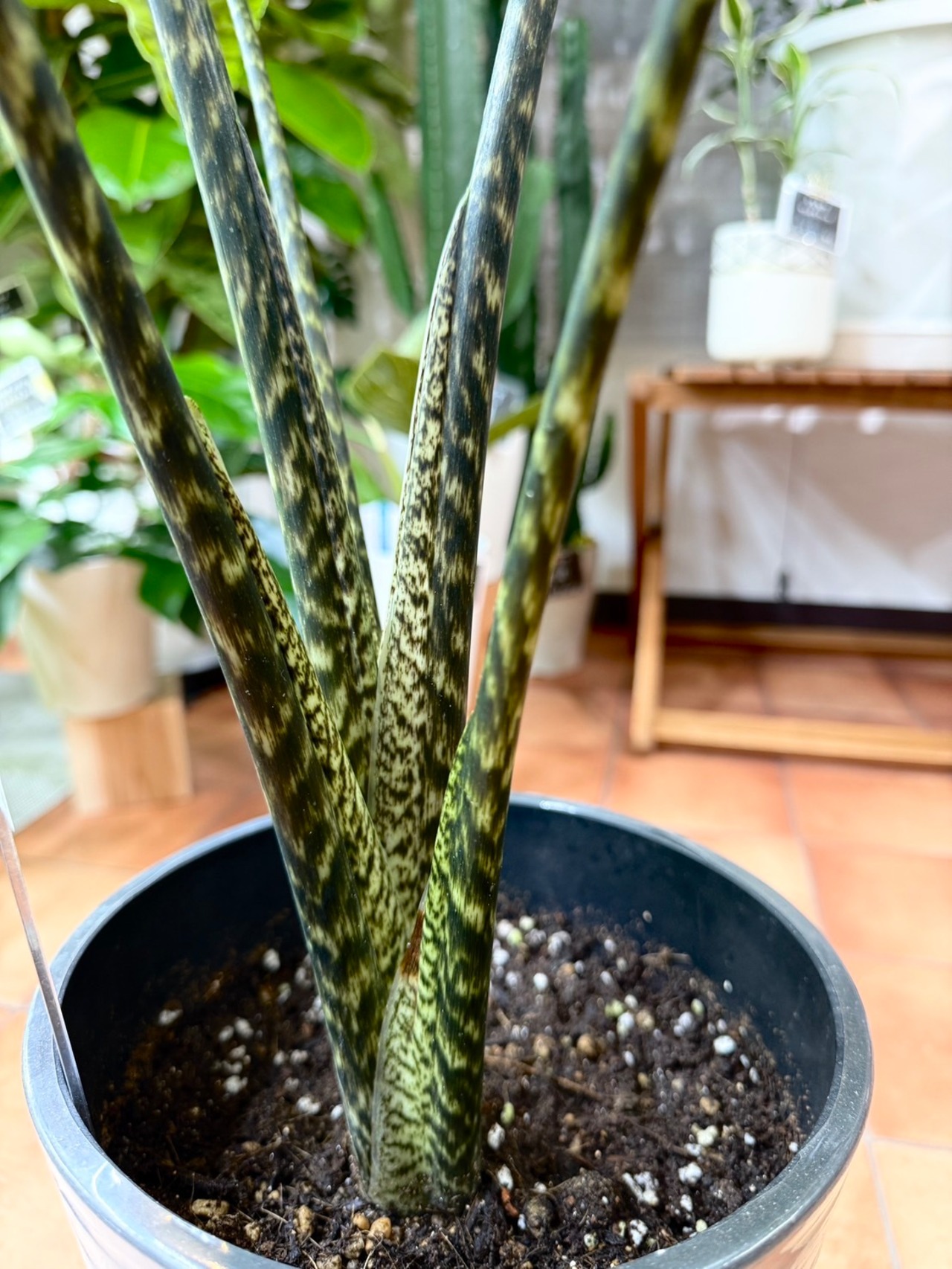 アロカシア・ゼブリナ・レティキュラータはアロカシア ゼブリナ レオパードとも呼ばれ、その美しく細長く、緑と黄色の模様の葉が特徴的です。