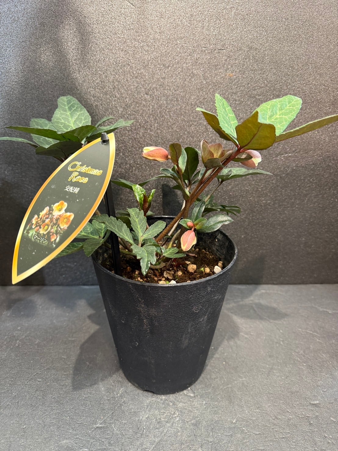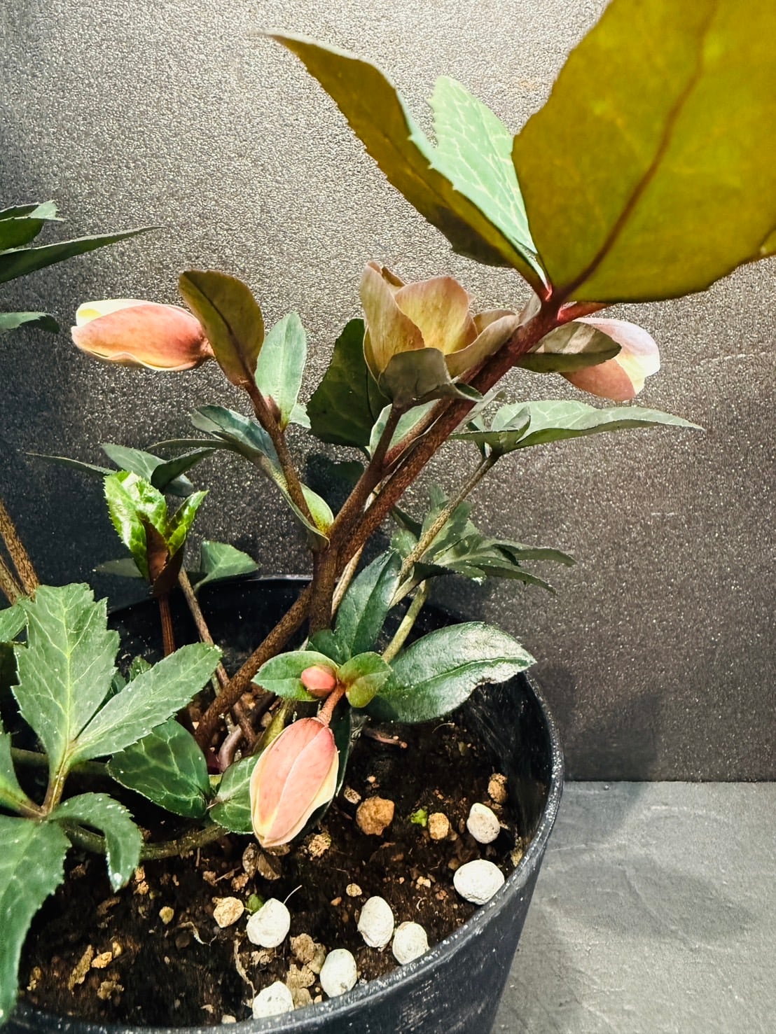 クリスマスローズ「マーリン」は、ニゲルとリビダスの交配種で、クリーム色からピンク、ワインレッド、グレーへと変化する複色の花が特徴です。