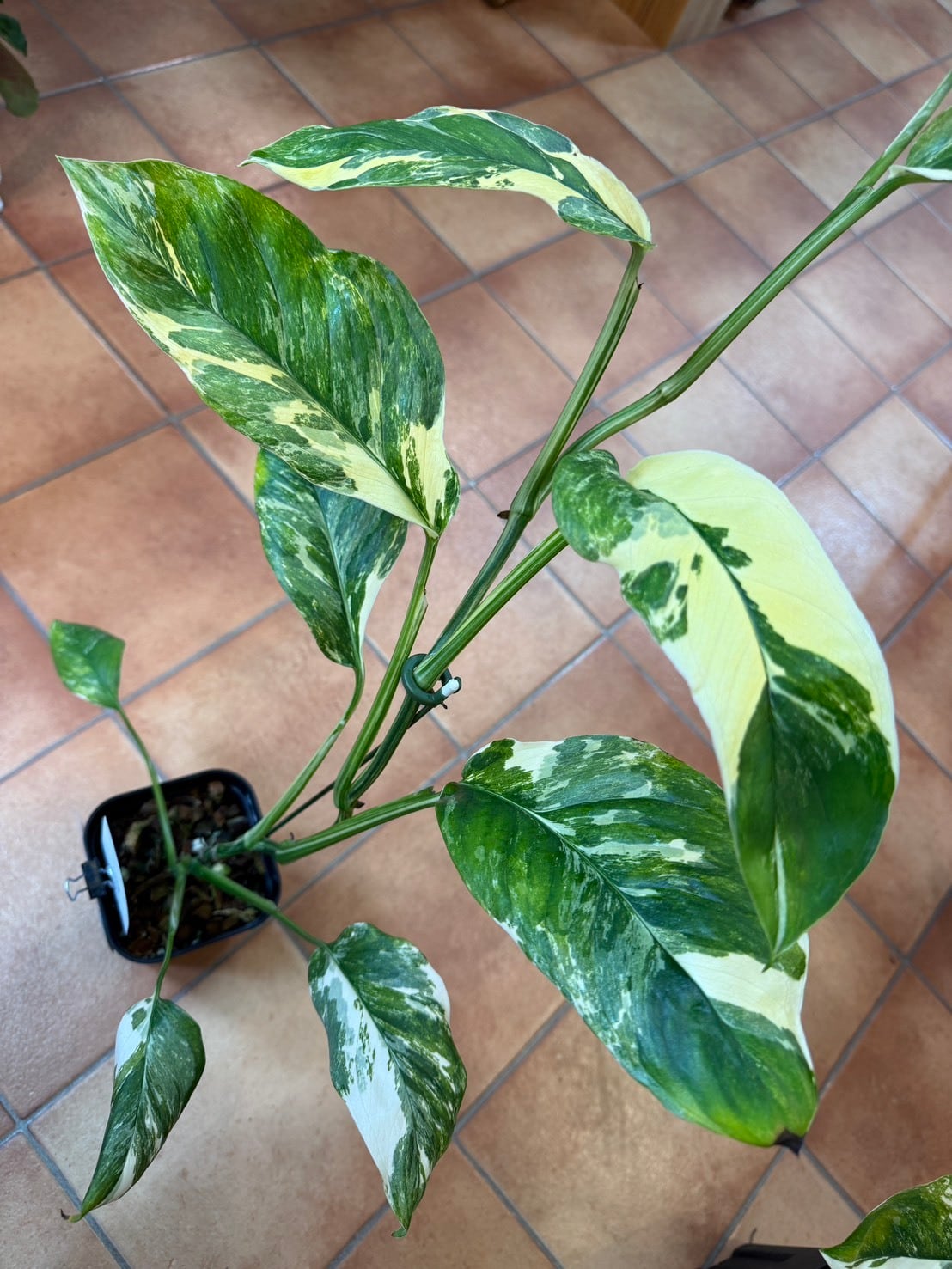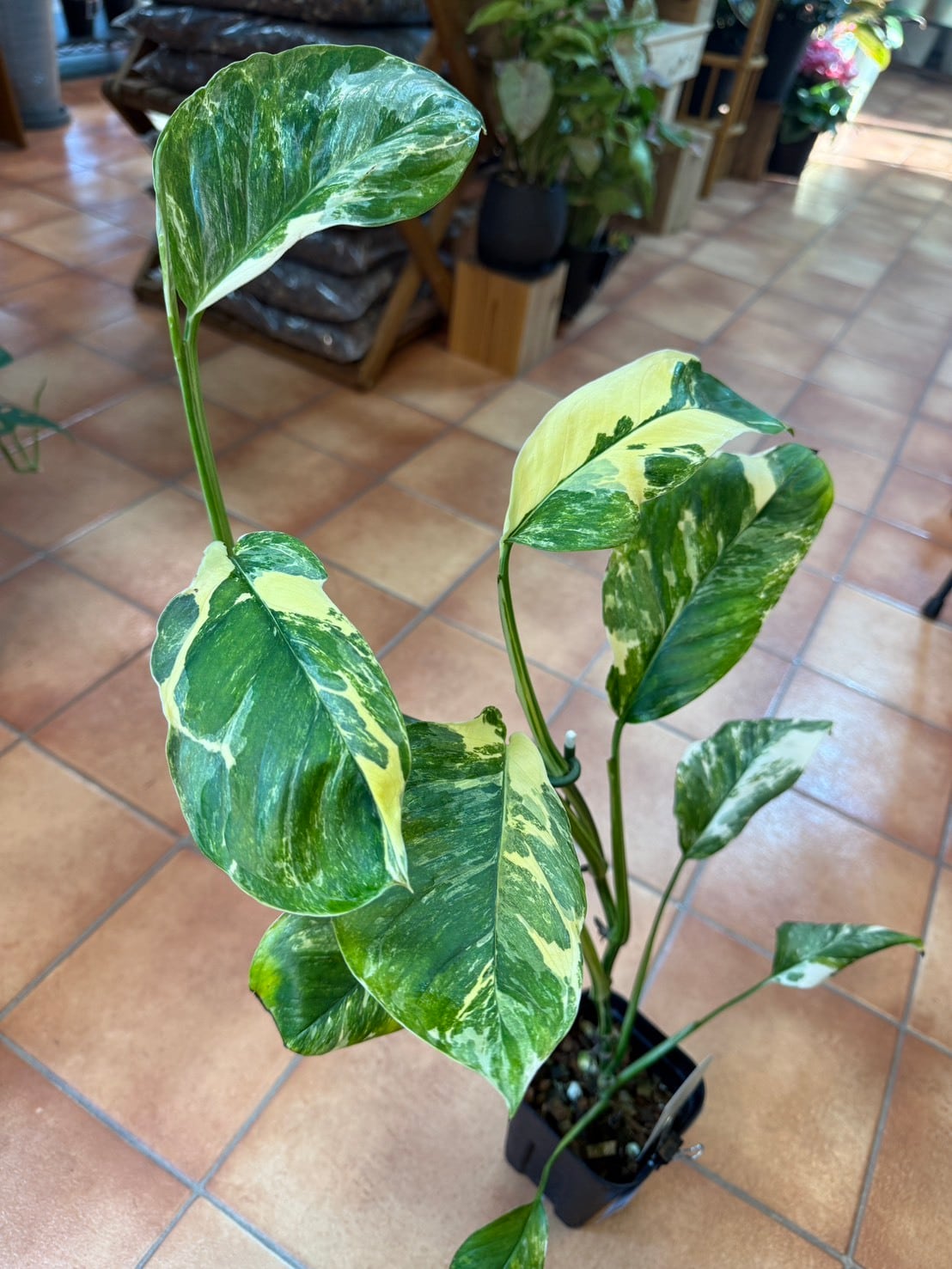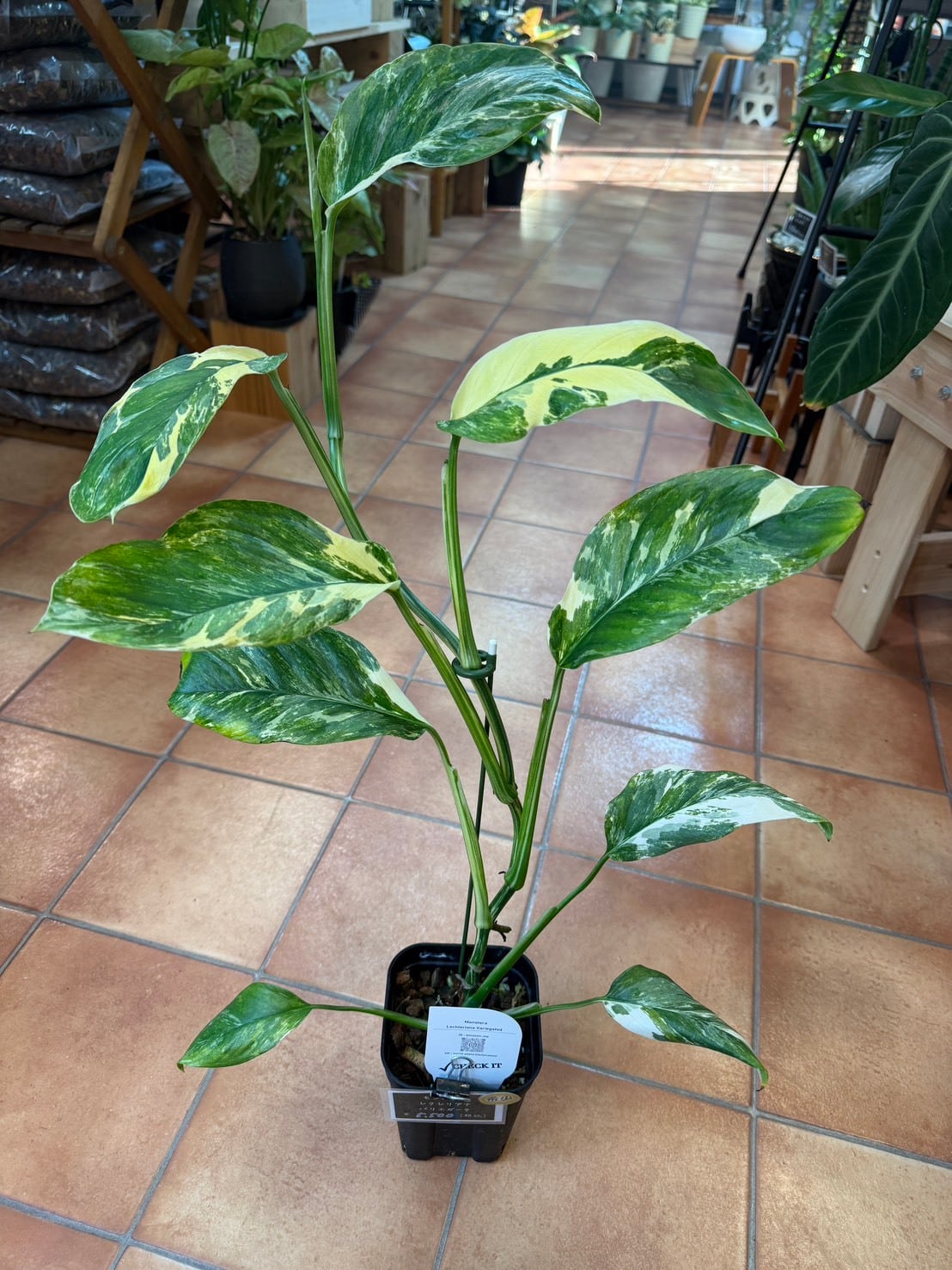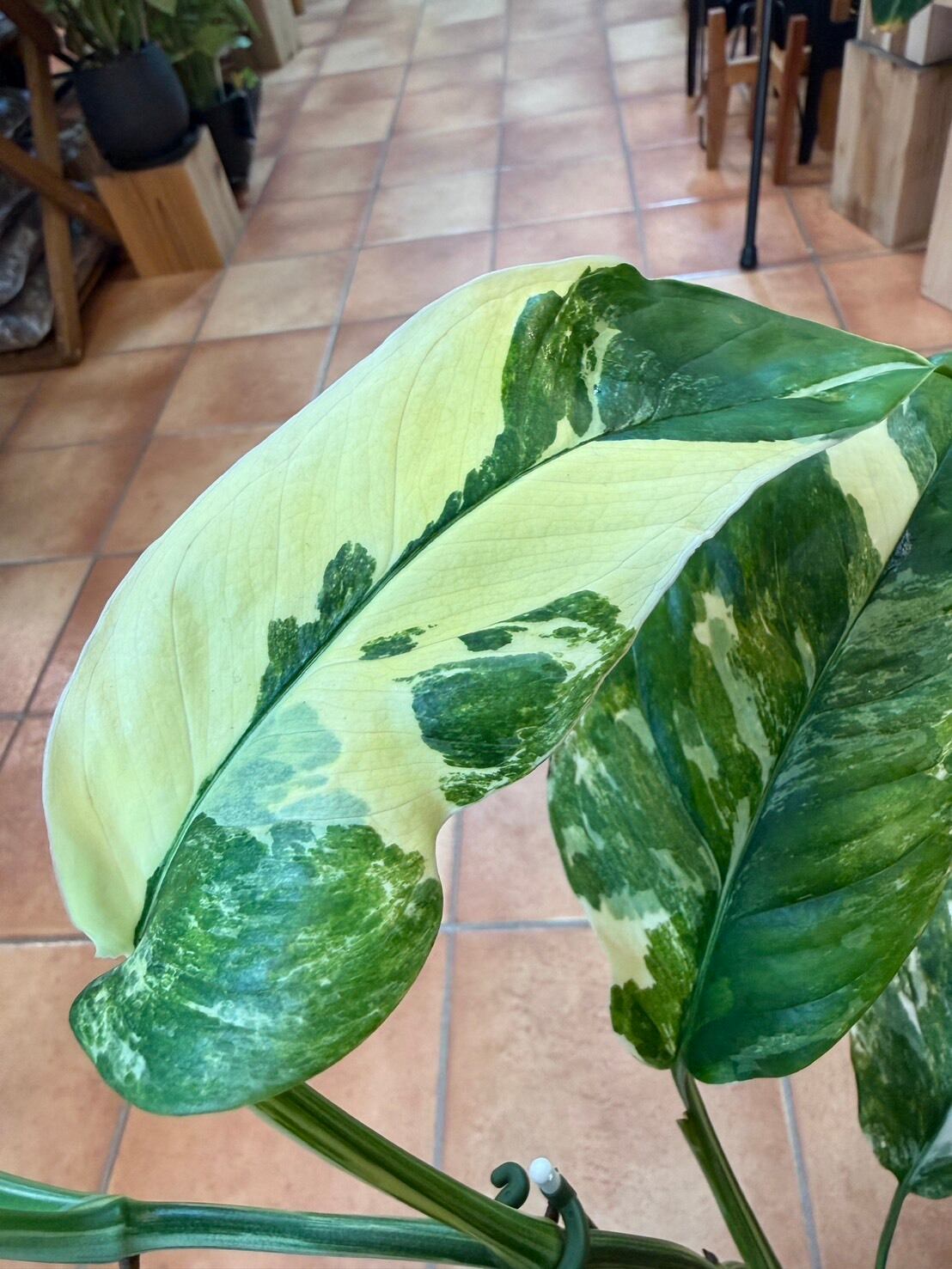 モンステラ・レクレリアナ・バリエガータは、縦長の葉に多数の穴が特徴的なモンステラ・レクレリアナの斑入り品種です。