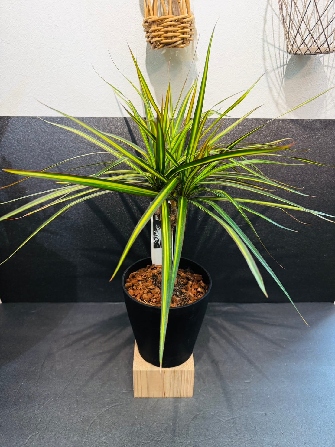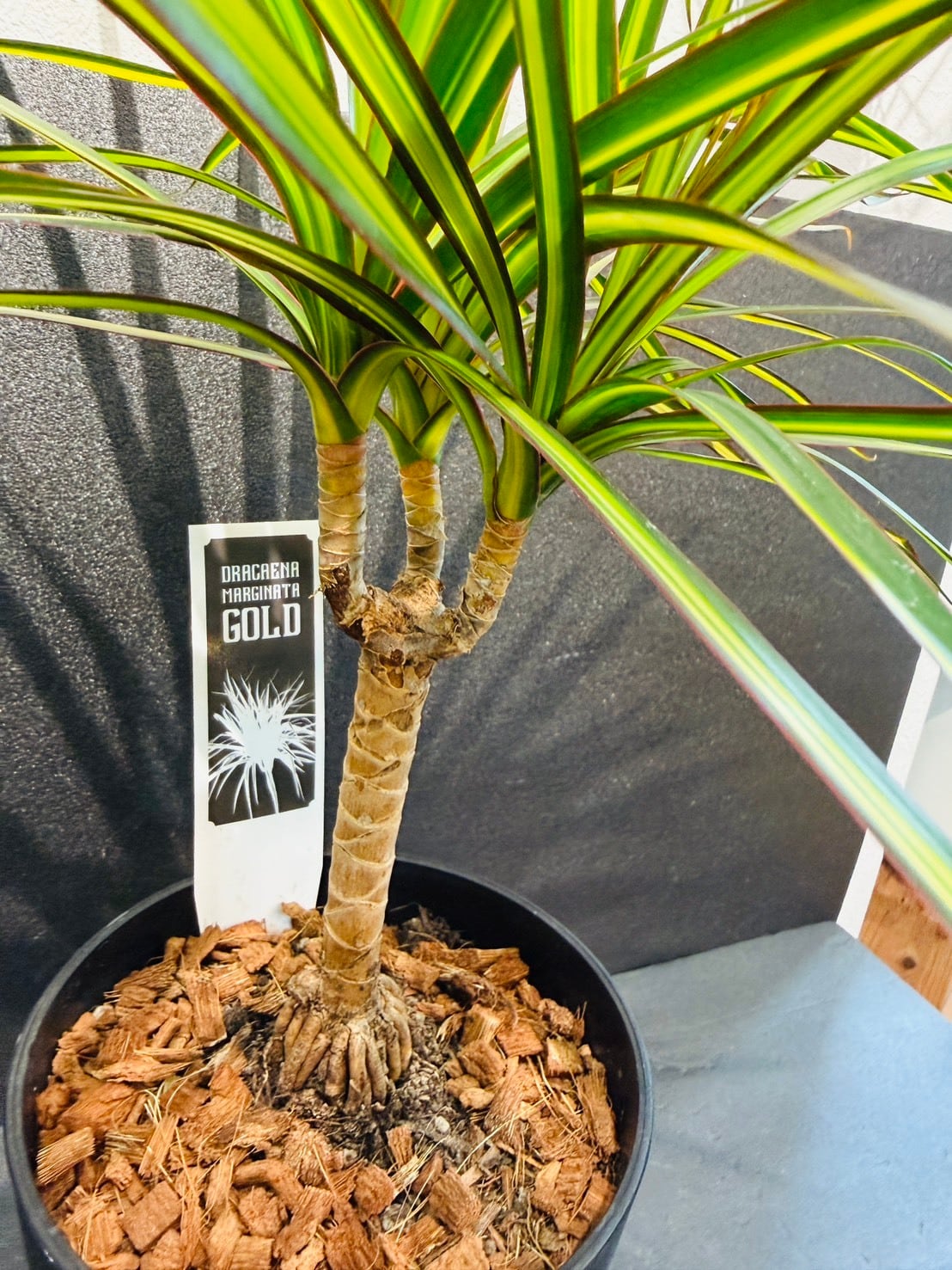 ドラセナ・コンシンネ・マジナータ・ゴールドは、剣先型の細長い濃緑色の葉に、色鮮やかな黄色の中斑が入る観葉植物です。