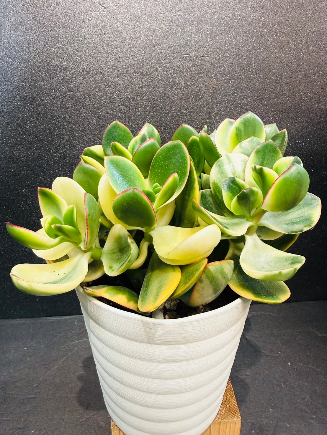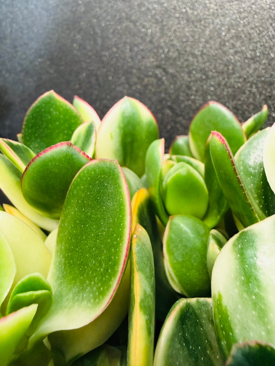 南アフリカの海岸に分布し、日本には昭和の初めころ入ってきたといわれています。葉は丸い形のものが多いのですが、細いものなどバリエーションがあり、秋冬に低温にあうと紅葉します。葉や草姿も面白いのですが、冬から春先にかけて咲く花も可憐で人気があります。鉢植えで栽培されますが、乾燥に強く、手入れも特段の手間がかからず、管理が楽な植物です。