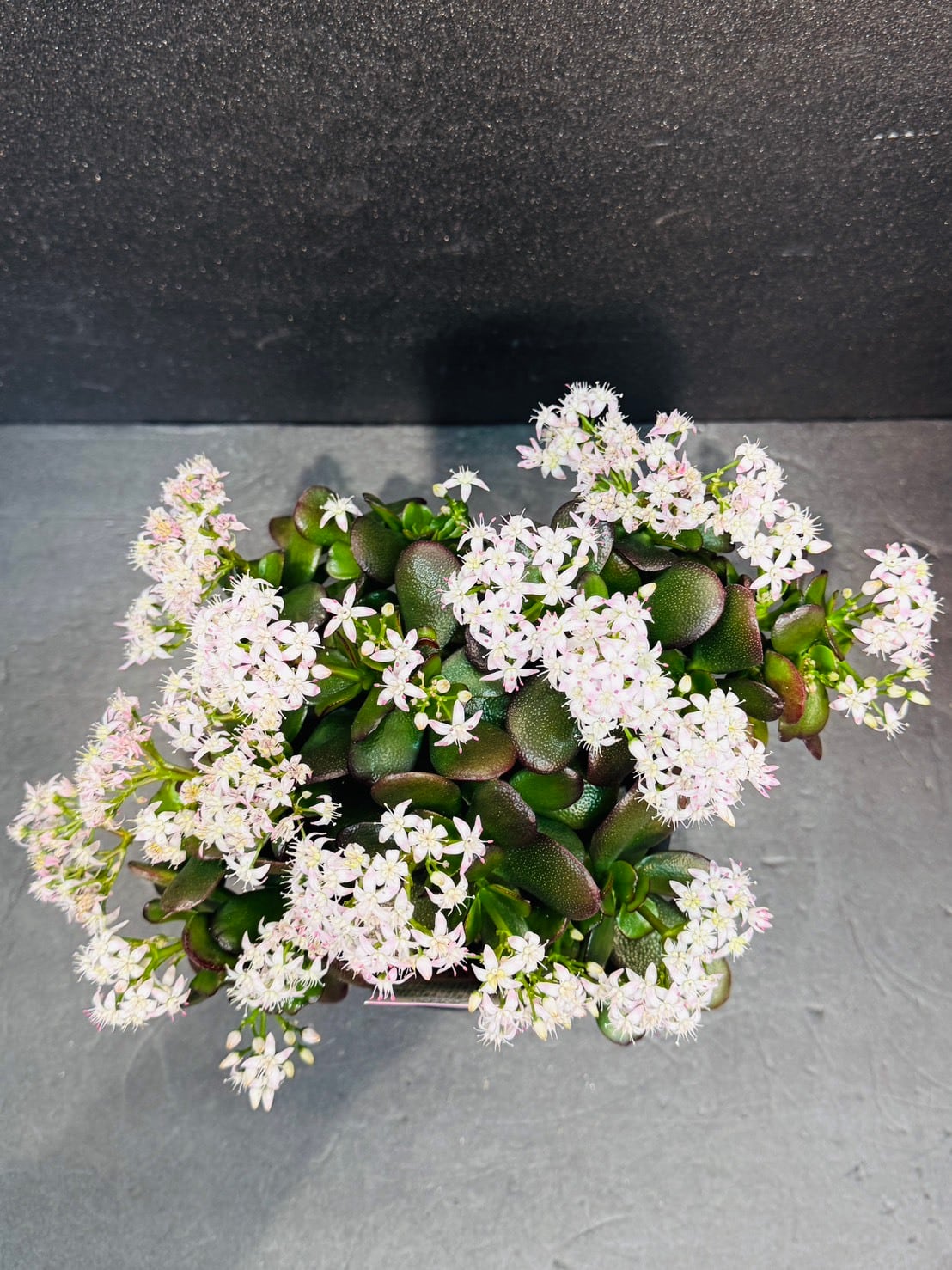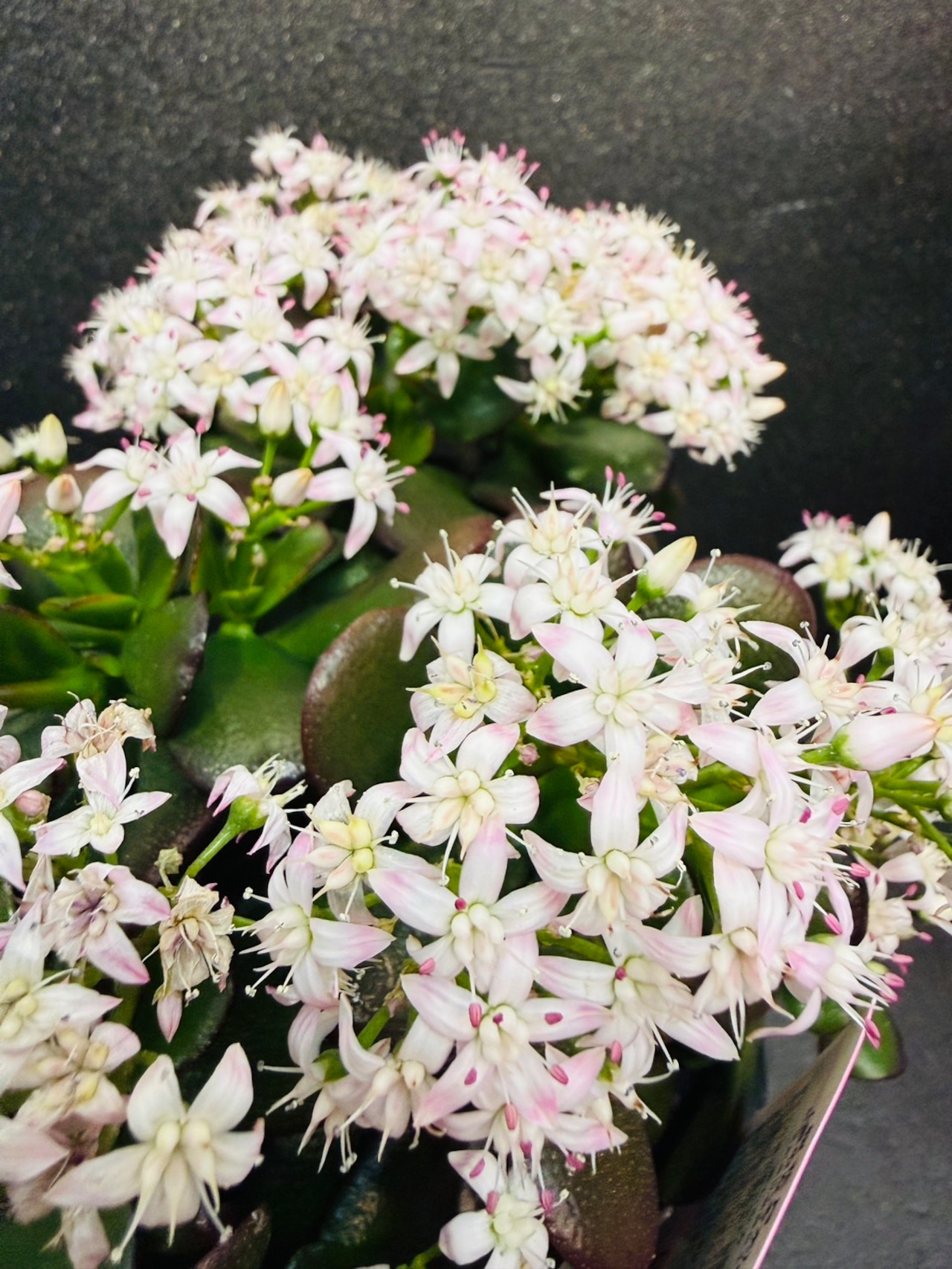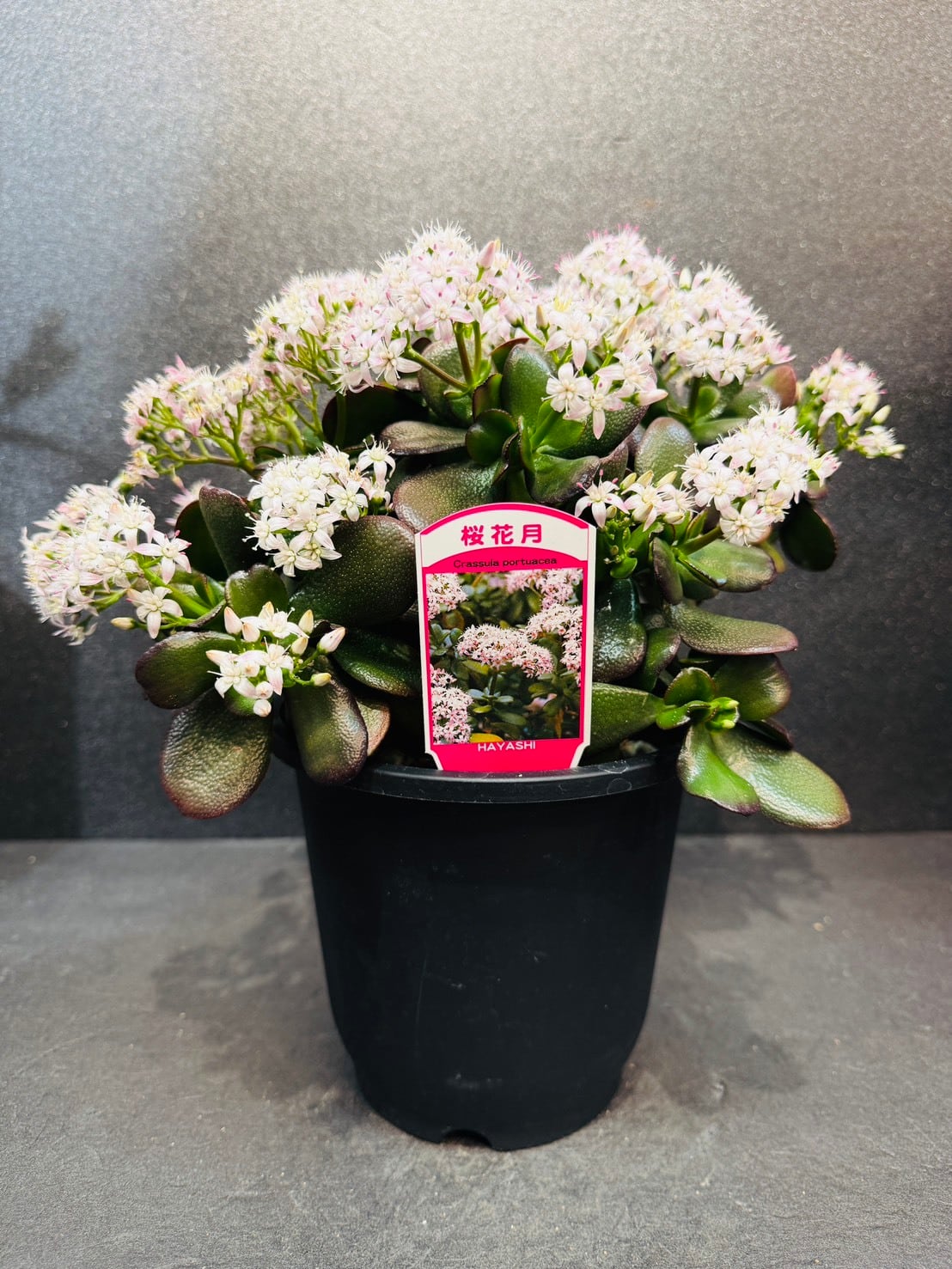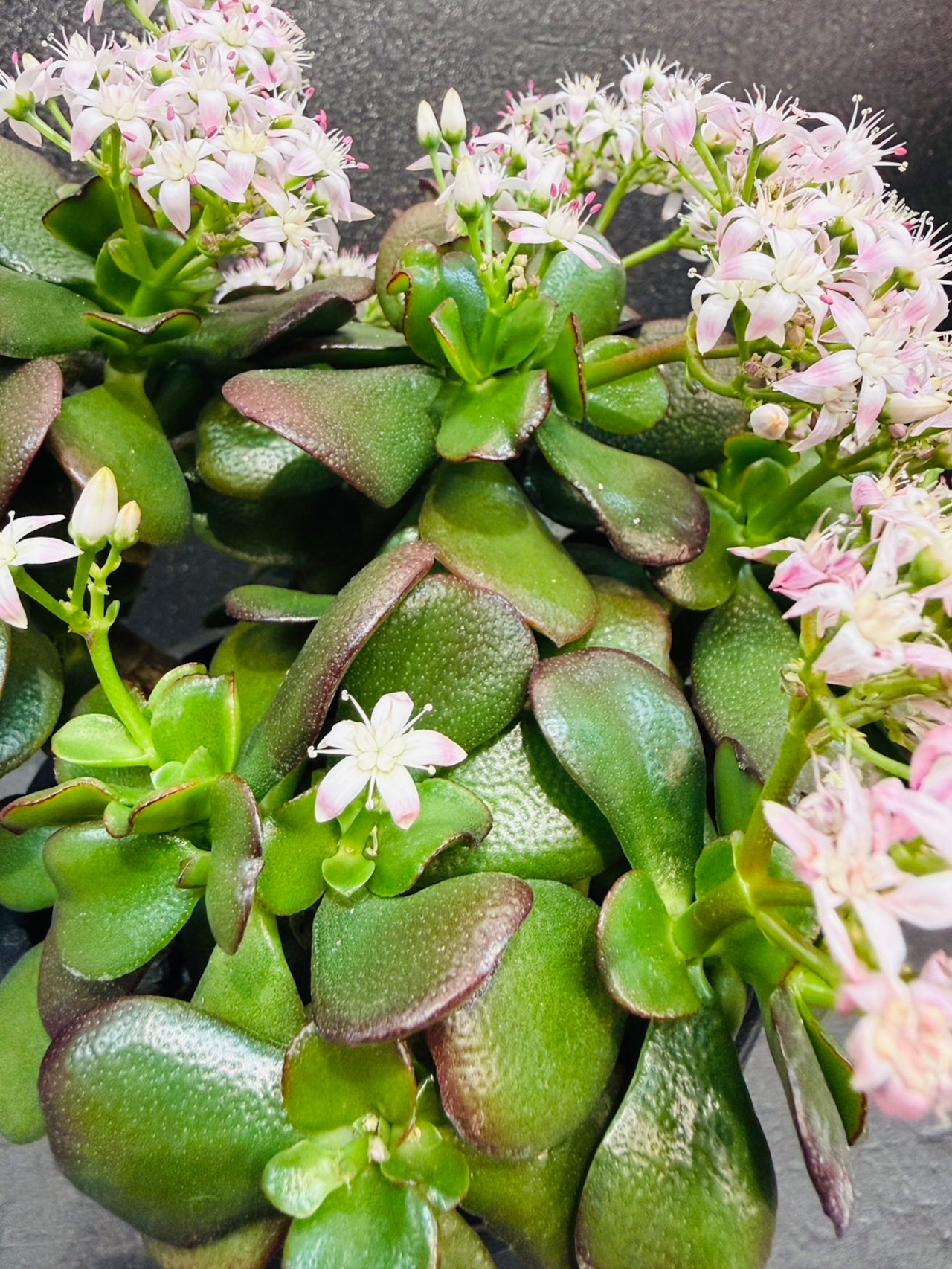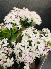 金のなる木・桜花月は、小ぶりでコンパクトな株でも冬〜春先に桜のようなピンクの小花をたくさん咲かせるのが最大の特徴です。