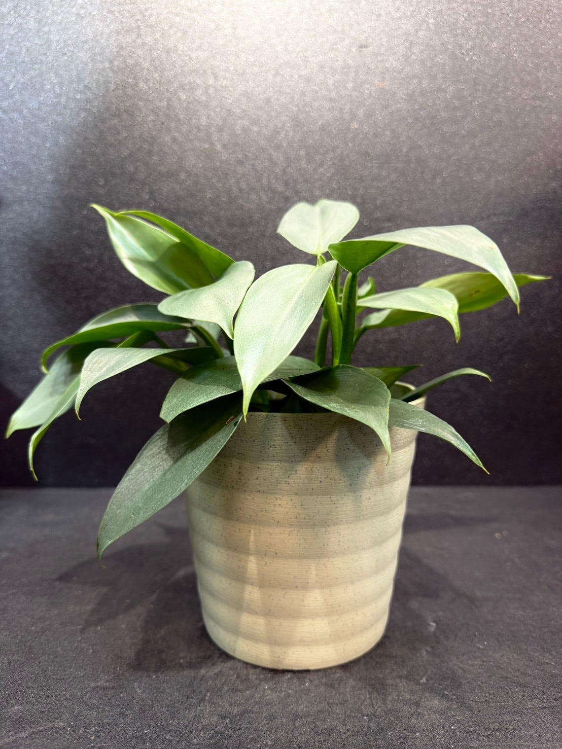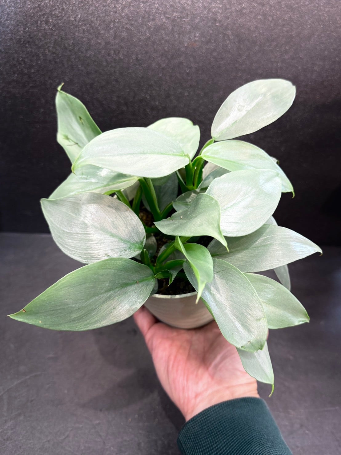 フィロデンドロン・シルバーメタルは、シルバーグレイのメタリックな葉が特徴の植物です。ツルを伸ばして這うように広がるフィロデンドロンの品種で、ハンギングとして人気があります。