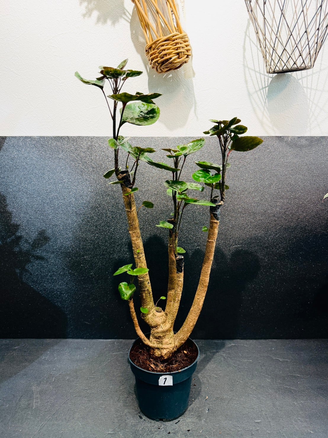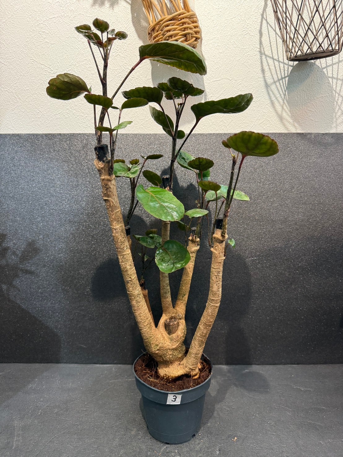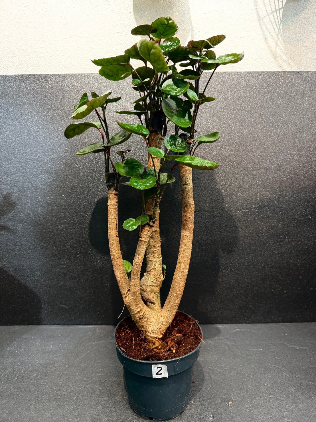 ポリシャス・ファビアンは、フリスビーのような厚みのある丸い深緑の葉と、太く安定感のある幹が特徴の観葉植物です。