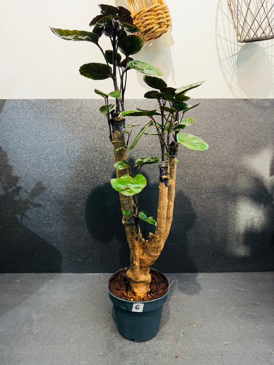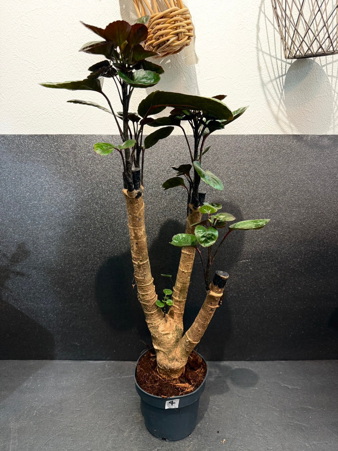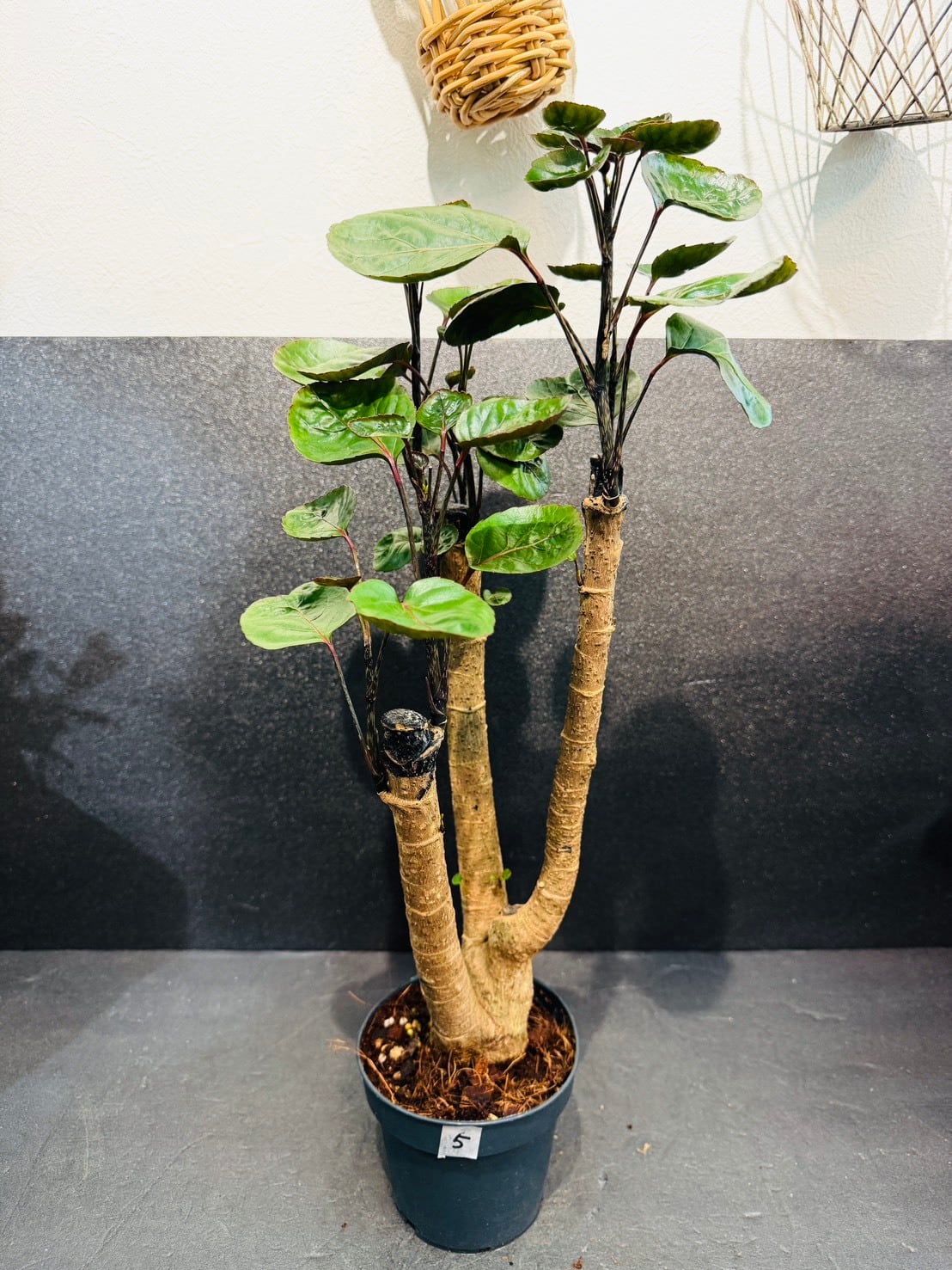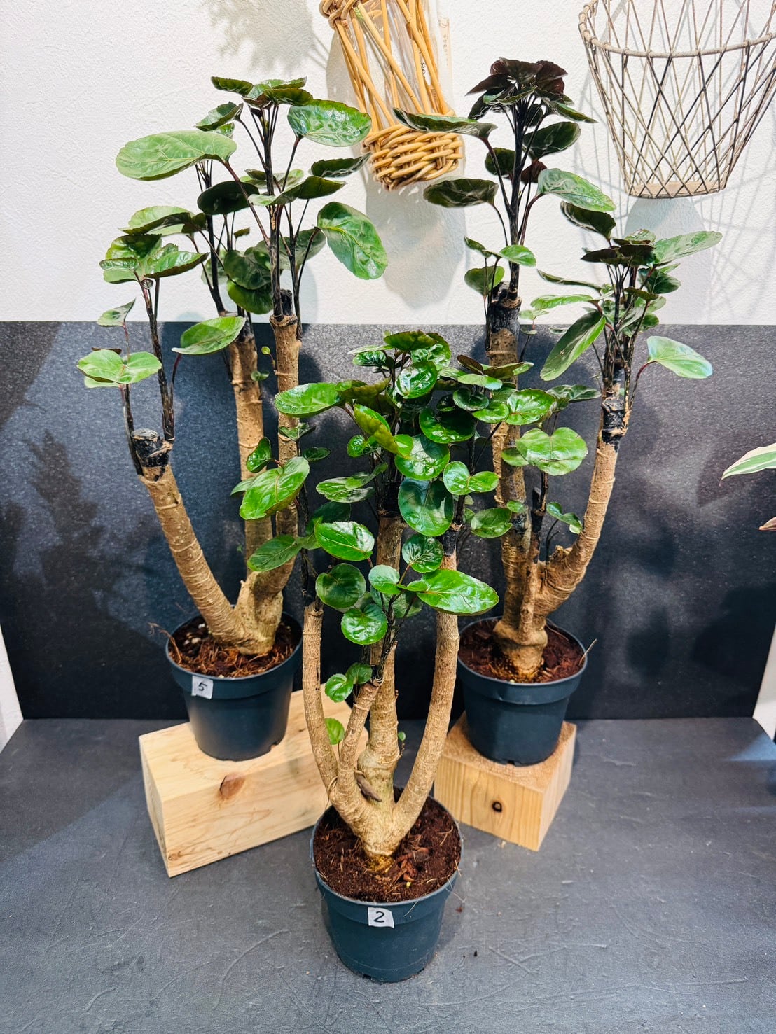 ポリシャス・ファビアンは、フリスビーのような厚みのある丸い深緑の葉と、太く安定感のある幹が特徴の観葉植物です。