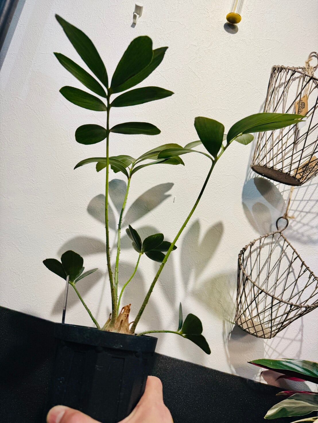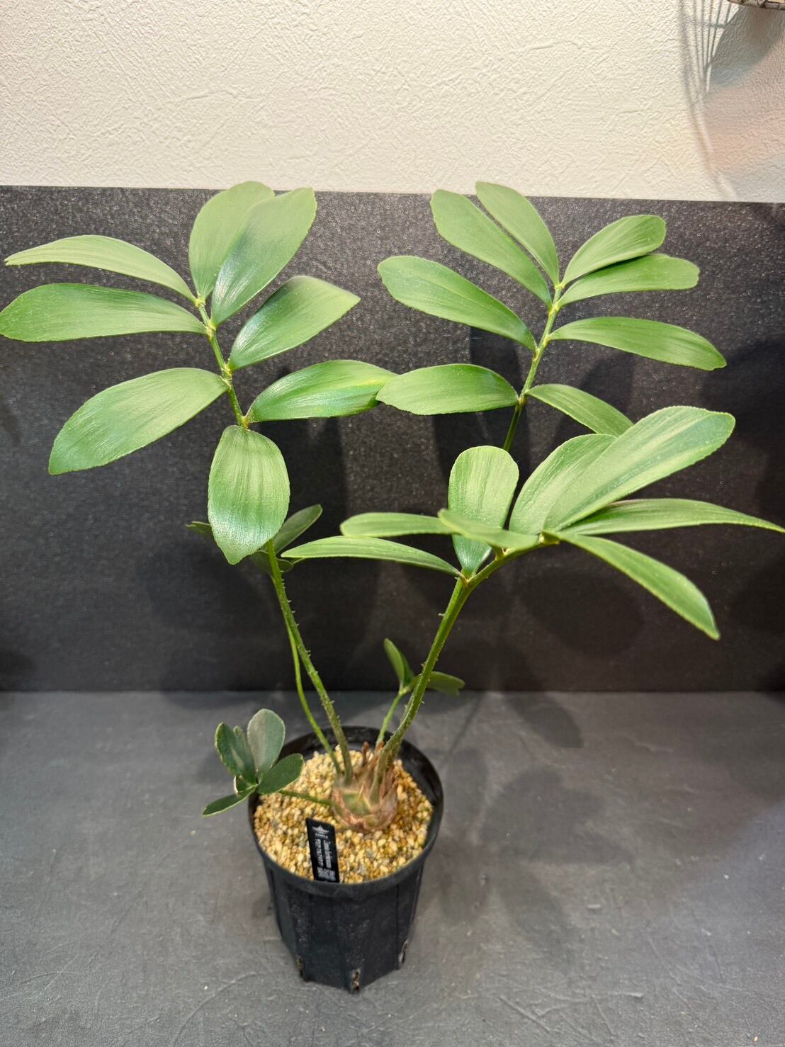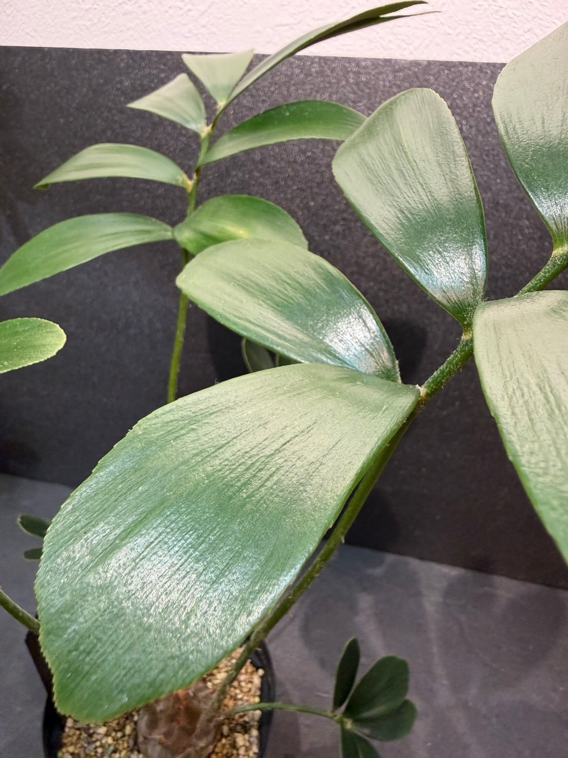 幹は短く球根状で成長が遅い。ソテツ目ですが、葉に棘が無く、柔らかく手触りがよいです。葉は幹の中央から放射状に広がる羽状複葉です。