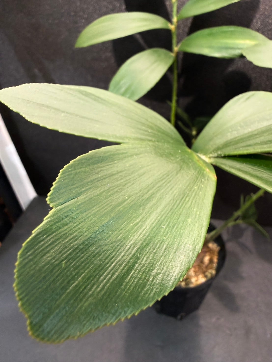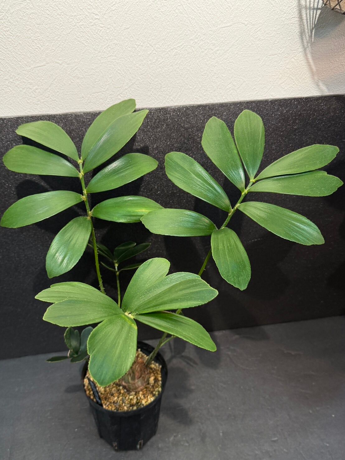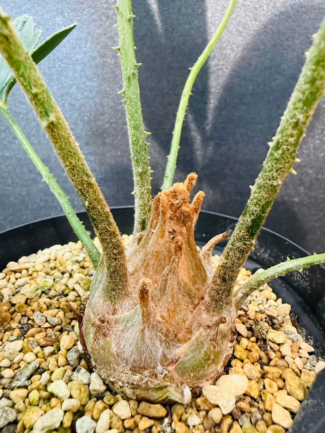 幹は短く球根状で成長が遅い。ソテツ目ですが、葉に棘が無く、柔らかく手触りがよいです。葉は幹の中央から放射状に広がる羽状複葉です。