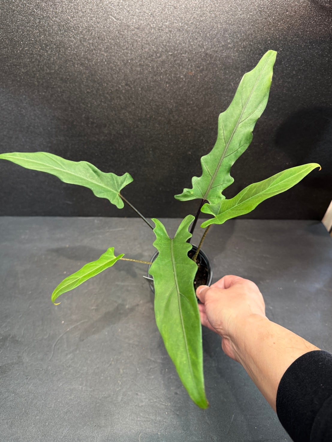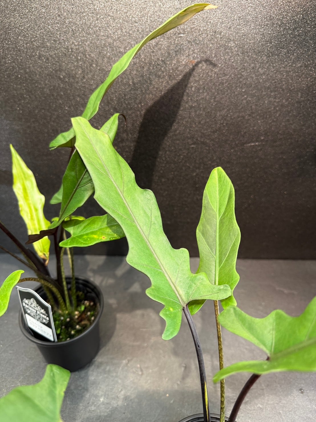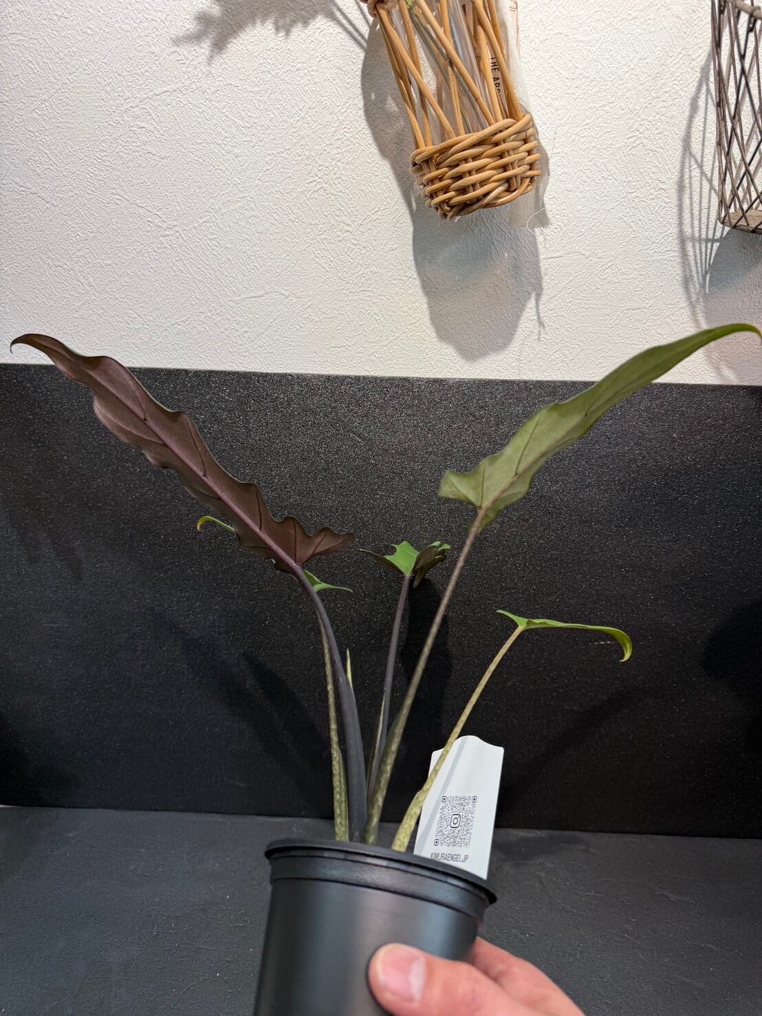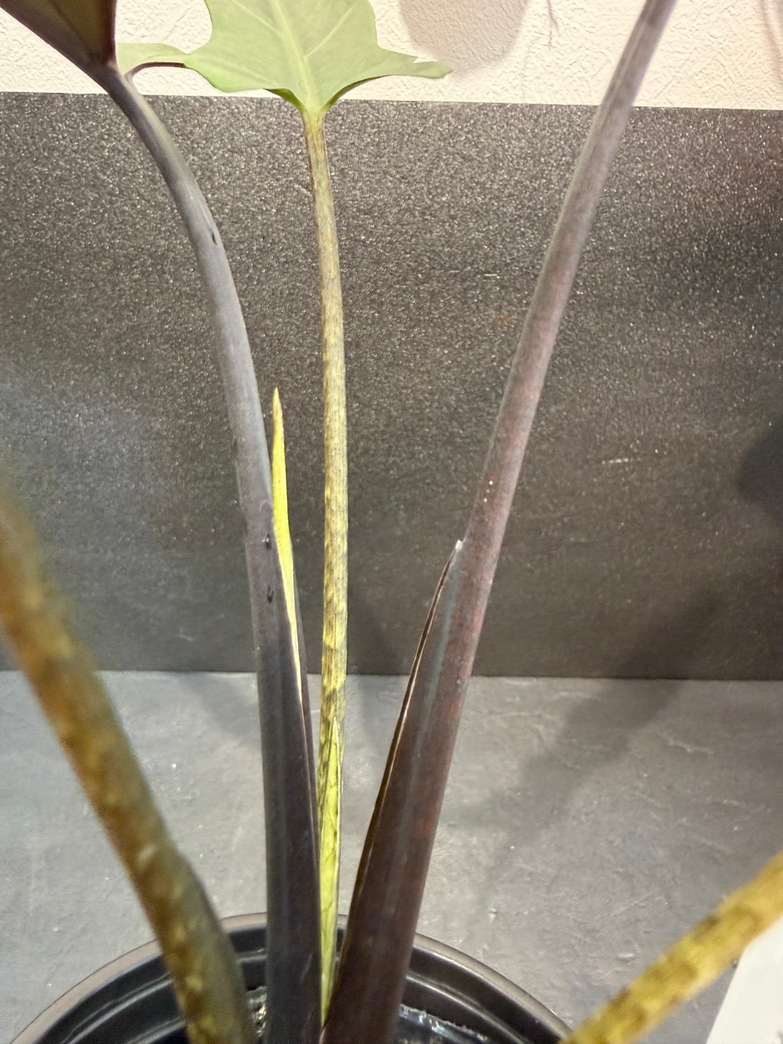 アロカシア・ラウテルバキアナ(Alocasia lauterbachiana)は、細長い剣のような波打つ葉と、裏側の濃いパープル〜グレーのコントラストが特徴のサトイモ科の観葉植物です。別名「パープル・ソード」とも呼ばれ、直立するシャープな姿が魅力です。