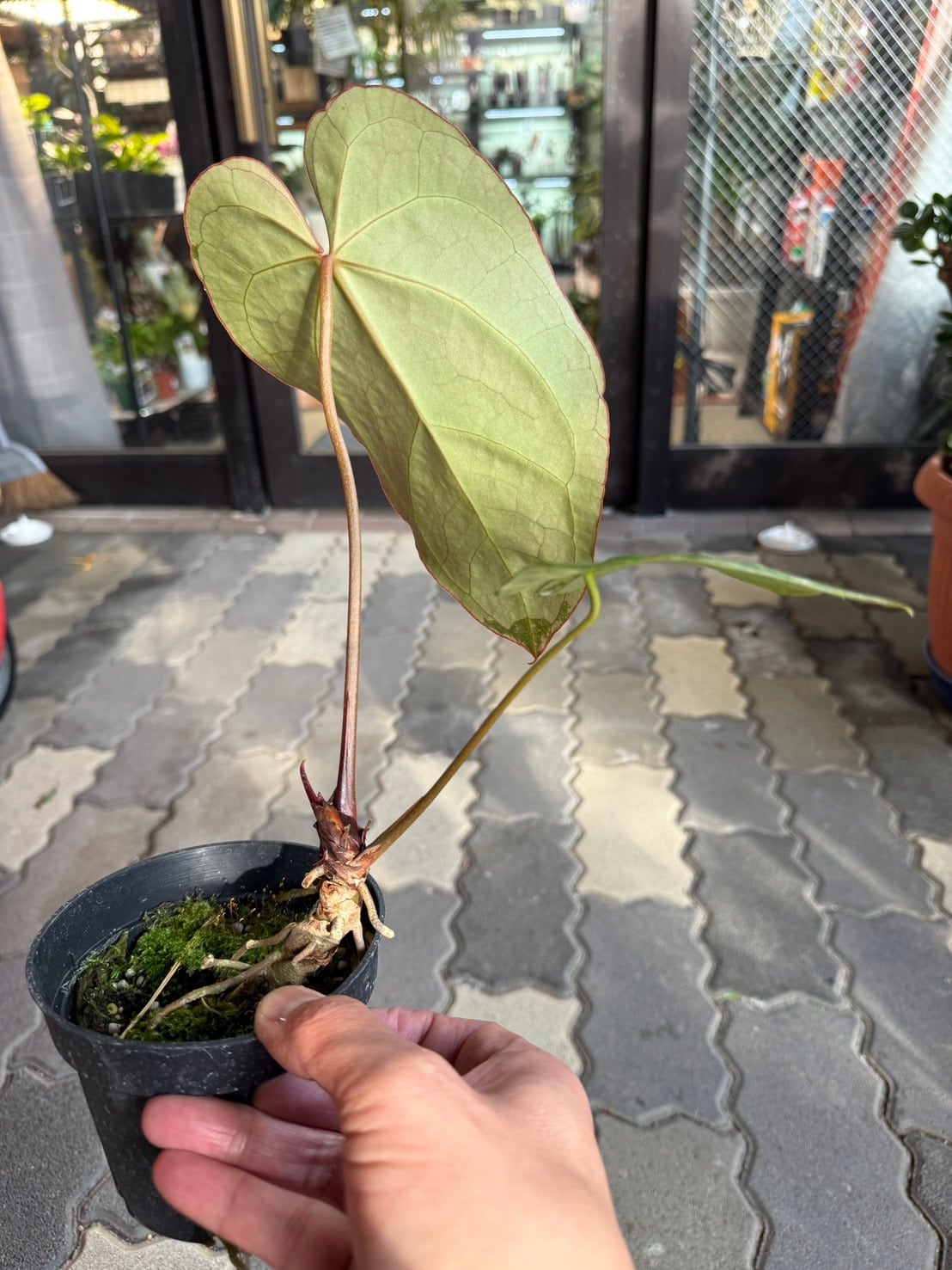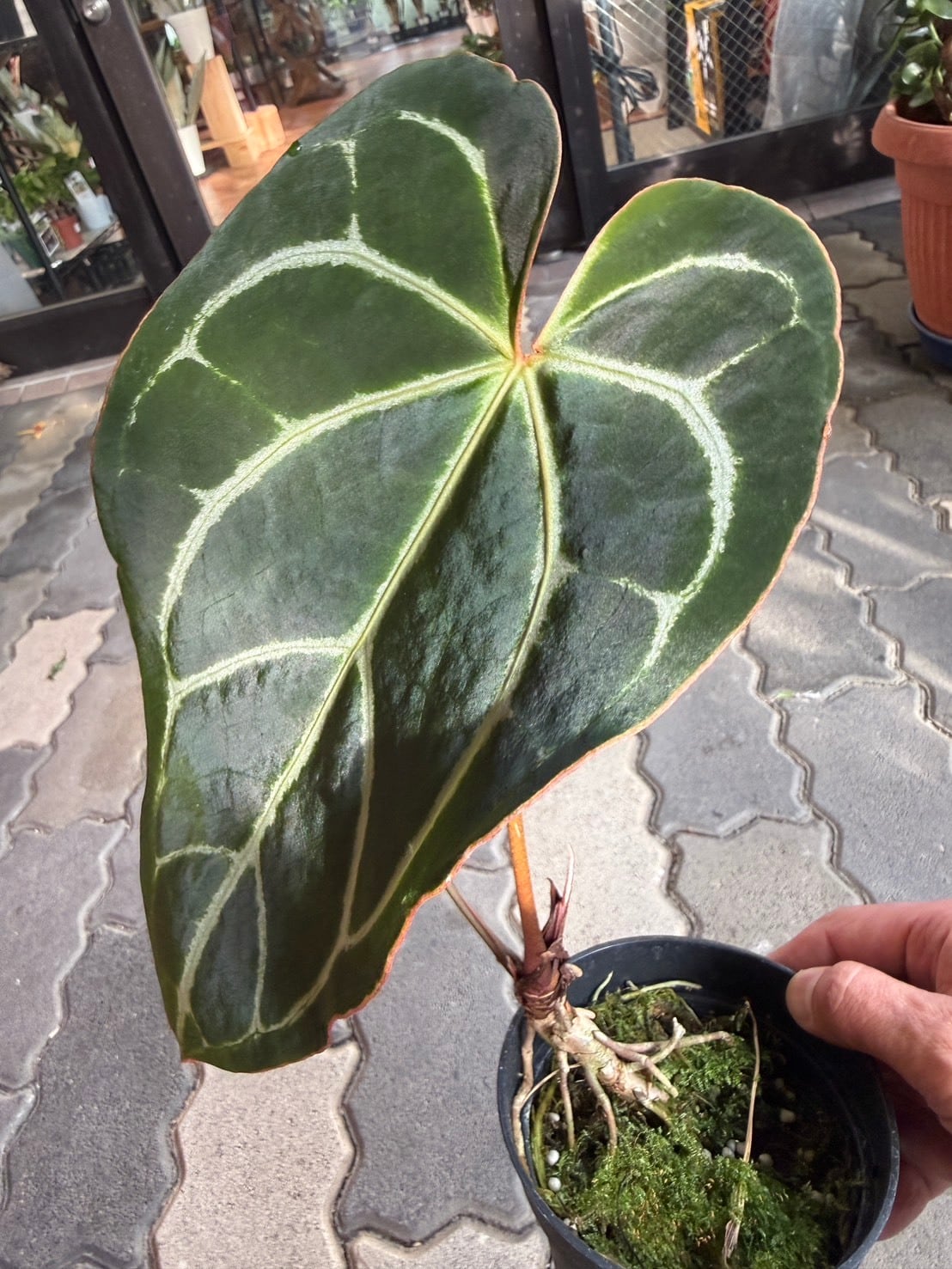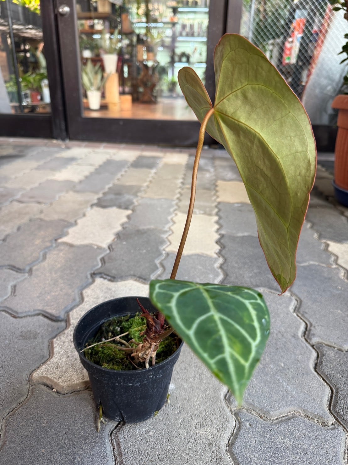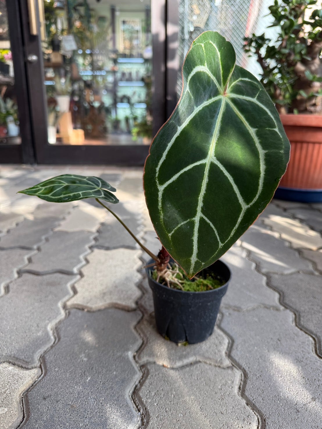 アンスリウム・クリスタリナムは、葉はサイズが大きくてハート形をしており、葉の質感がベルベットのようで高級感のある葉が特徴です。