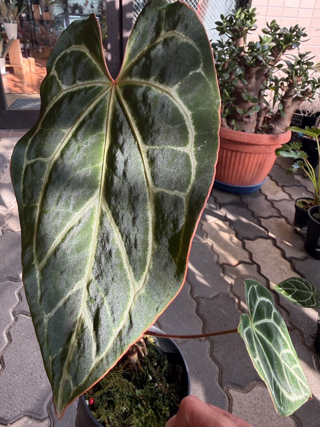 アンスリウム・クリスタリナムは、葉はサイズが大きくてハート形をしており、葉の質感がベルベットのようで高級感のある葉が特徴です。