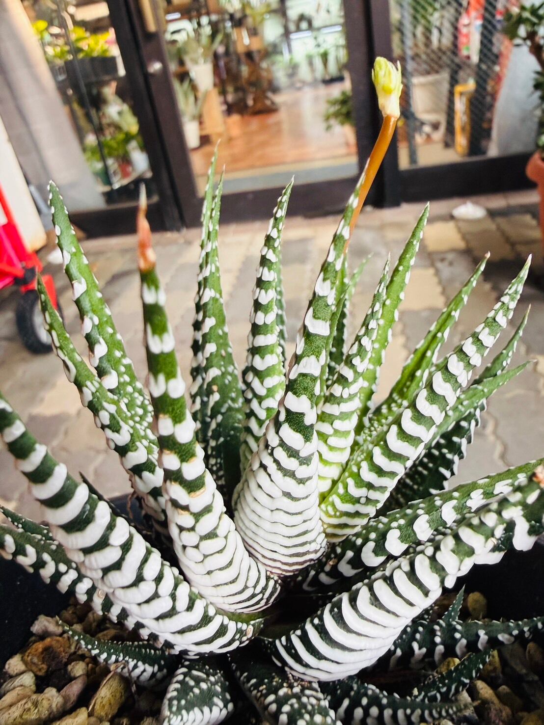 葉は硬く、尖っており、ロゼット状(バラの花の形)に展開します。